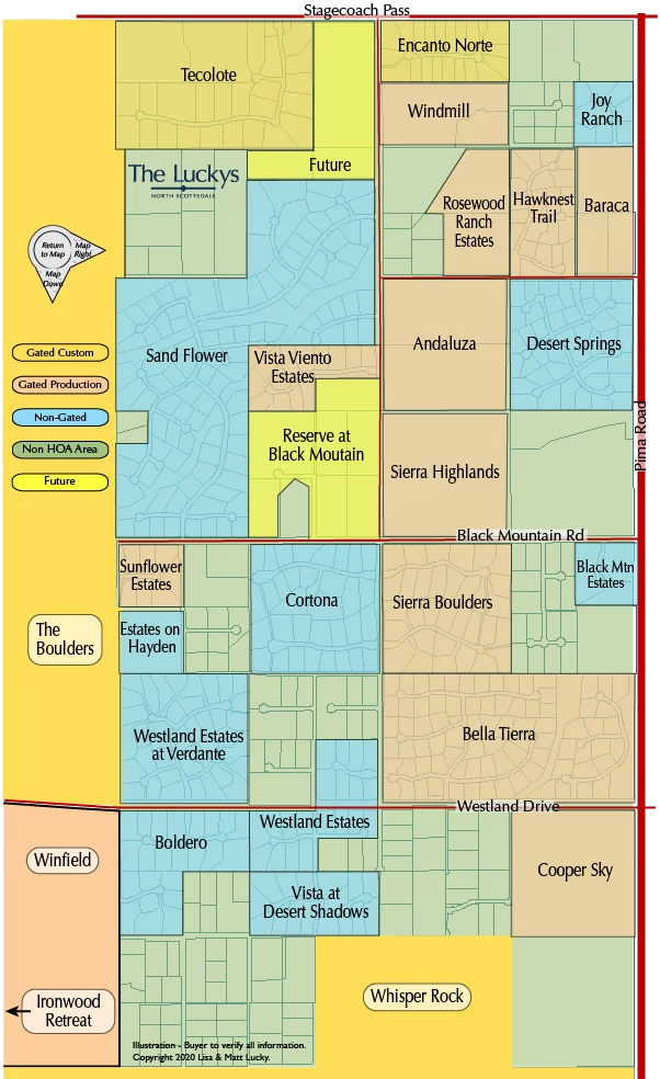 The Other Boulders Area Subdivisions Map includes smaller Boulder Character Area subdivisions include Baraca Estates, Boldero, Bella Tierra (aka Boulder Ridge), Cortona, Desert Springs, Encanto Norte, Cantada (aka Hawknest Trail), Copper Sky, Hawknest, Ironwood Retreat, Joy Ranch, Sand Flower, Sierra Boulders, Sierra Highlands, Sunflower Estates, Tecolote, Verdante at Westland Estates, Vista Viento, Vistas At Desert Shadows, Westland Estates, and Windmill by Bob Bacon.