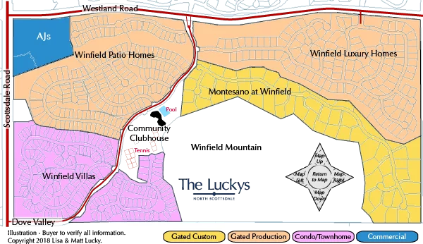 Winfield is a 300-acres guard gated Del Webb community on Scottsdale Road, south of Carefree Highway, and nestled between Whisper Rock and The Boulders. Named for the founder of Scottsdale, Winfield Scott, the guard-gated community offers the best of both Scottsdale and Carefree. The 75-acre Winfield Mountain Preserve ensures residents will enjoy the natural beauty of arroyos, desert trees, majestic saguaro cacti and other desert vegetation or the High Sonoran Desert. Most homes enjoy views of nearby Black Mountain and city lights.
