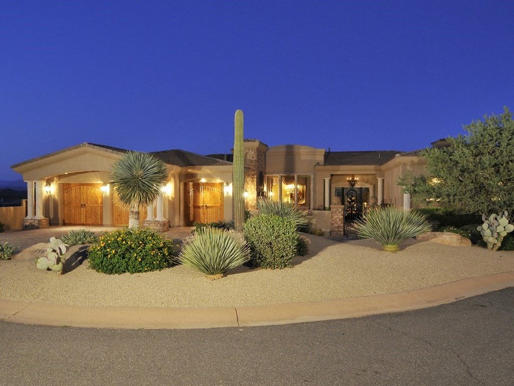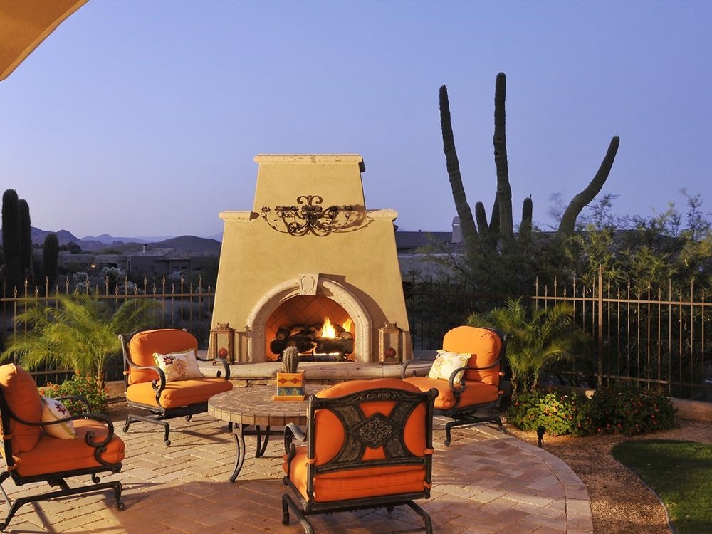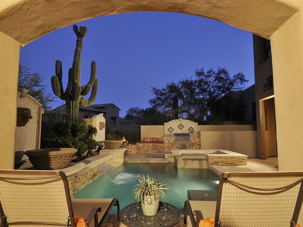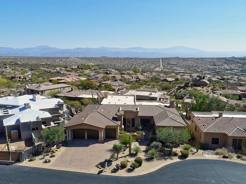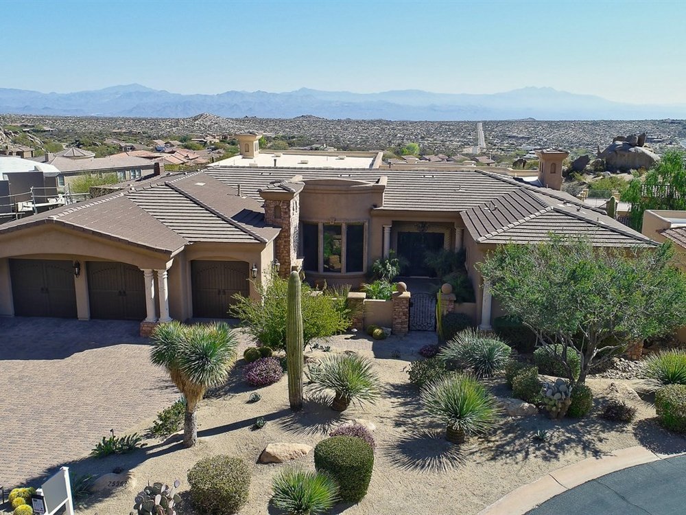 Tucked away in a private cul-de-sac of guard-gated Troon Village, this 5,000 plus square foot home brings luxury and views to the forefront. The panoramic views from the front and rear include Troon Mountain, Four Peaks, and the McDowell Mt. Range. Most furnishings and accessories available by separate Bill of Sale. Luxury abounds inside the home with wood-beam ceilings, polished travertine floors, five fireplaces, grand coved ceilings, granite counters, designer paint, and balcony dining to take in the views. The kitchen, complete with double islands, stainless-steel appliances, and beautiful hardwood cabinetry, opens to the family room and breakfast area for an open and spacious feel. Escape to the cozy front courtyard with hand-laid pavers and a centerpiece stacked-stone cantera fireplace. Or cool off in the rear yard with play pool and negative-edge spa, built-in BBQ, fireplace and fire pit, and lounge areas. The master suite has its own wet bar and courtyard fountain, with a soaking tub and fireplace, double vanities, walk-in closet, and large walk-in shower. Two additional en suite bedrooms and a bonus room with full kitchen/bar round out this exquisite home.