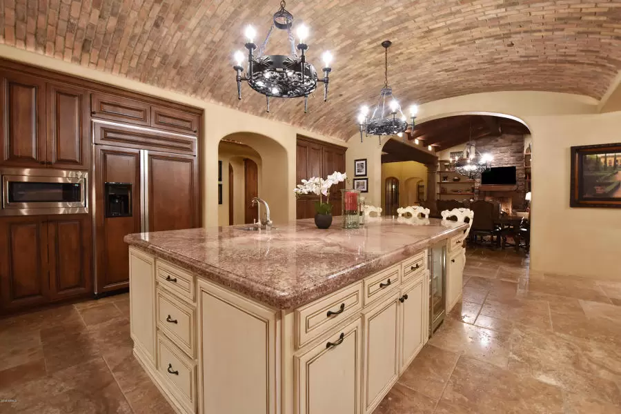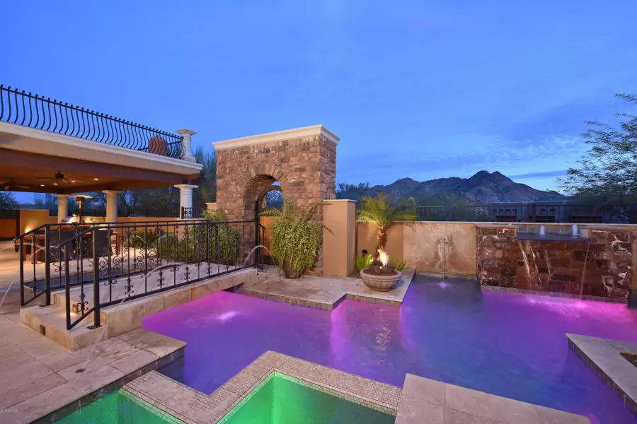 This exquisite Old-World Tuscan-inspired estate is a craftsman’s dream. Stunning details abound in this large masterpiece such as wood-beamed and groined-vault brick ceilings, Versailles-patterned travertine and wood floors, smooth stucco, and stacked-stone accents. The spacious rooftop deck allows for nearly 360-degree views including Troon Mountain and the McDowell Mountain range. The grounds are designed for entertaining with a front-entry bridge over the heated pool and spa leading to the entry courtyard, then wrapping around to the large, fully covered patio with built-in BBQ, travertine tile and large pocketing doors to bring the inside out! The lower-level master suite has its own sitting room and exterior access with a truly luxurious en suite bath. Two additional en suite bedrooms and a den are located downstairs. Upstairs features a bonus living space with view-deck access and built-in cabinetry with a refrigerator and sink; as well as an additional bedroom with full bath. You’ll appreciate the grand, open great room floorplan with centerpiece fireplace, breakfast area, and a gourmet kitchen with everything the home chef could desire. Come and see everything this home has to offer!