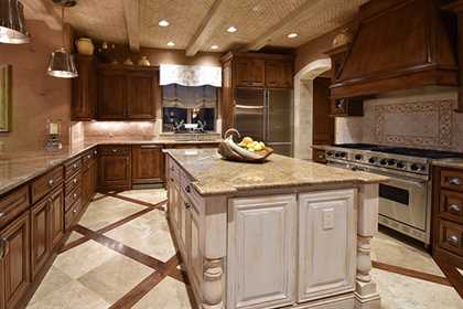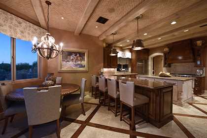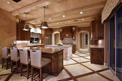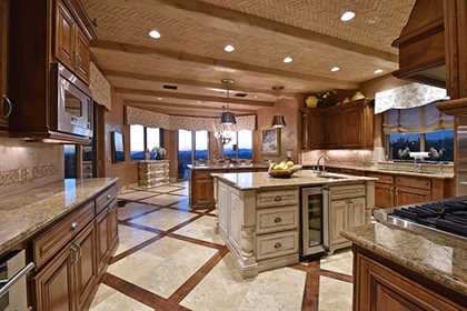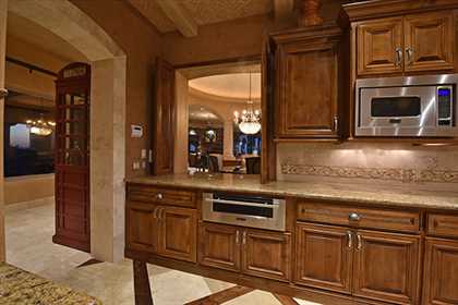 The chefs kitchen features a wood beamed and herringboned brick ceiling, custom alder wood cabinetry, travertine floors with wood inserts, granite counters, gas range, stainless steel appliance package including Sub Zero and Viking, new pendant lighting, and an adjacent breakfast room. The elevated lot creates an entertainers dream with 100k added to the landscaping, an award winning newly resurfaced pool and private spa, designer lighting, wrap around upper balcony with fireplace, BBQ and vined covered terraces, lower covered patio with bar, multiple lounge areas and tumbled travertine hardscape.