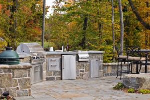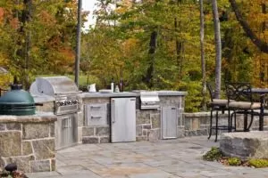 Where you decide to place your outdoor kitchen depends upon several factors. Firstly, you’ll want to make sure that smoke from the grill doesn’t waft back into the home. So have a good idea of the general wind pattern in your yard and orient the grill appropriately. Secondly, if you frequently entertain, and don’t want to travel a long distance from the indoor kitchen to the outside, consider placing your grill and outdoor kitchen relatively near the entrance to the inside kitchen. Remember that outdoor cooking and entertaining frequently means carrying heavy platters from one place to another. Thirdly, if you want to maintain the view you currently have from inside the house to the outside, you’ll want to place the outdoor kitchen to the side or at an angle so that the view isn’t blocked. Lastly, consider the overall traffic flow of your yard and the safety of your family. A hot, outdoor grill shouldn’t be located right next to the area where the Frisbee is thrown around, or near where you ride bikes or play. Just like an indoor kitchen, the outdoor kitchen is full of hazards so place it accordingly. Good planning will help ensure that your outdoor kitchen is in the right location for your yard. Pro tip: If you are considering doing a lot of landscaping changes to your yard such as adding retaining walls or a swimming pool, include the outdoor kitchen as part of the overall design. A professional outdoor kitchen designer will not only design the right kitchen for you, they can offer valuable advice about the ideal location of the kitchen and how it will work with the other elements of the yard.