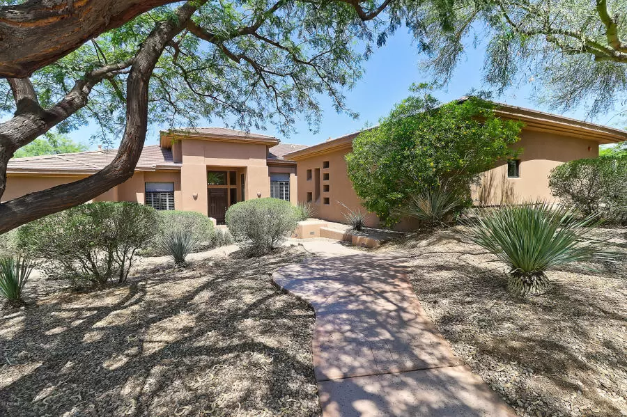 With a dramatic backdrop of both Troon Mountain and Pinnacle Peak, this custom estate offers a single-level floor plan with high ceilings, lots of windows for natural light and views, soft contemporary lines to complement both traditional and modern decor styles, stacked-stone accent walls and niches, tumbled-travertine master bathroom accents, granite slab counters, tile and hardwood floors, three additional guest bedrooms with en suite baths, an office, formal living and dining spaces, and an eat-in kitchen with floor-to-ceiling glass opening to the family room with fireplace and bar area. The outdoor living spaces include an extended covered patio, built-in cooking station, gathering cove with outdoor fire pit, sun deck, heated spa, and infinity-edge pool.