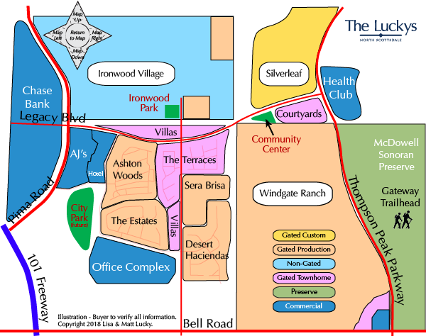 The neighborhoods in Desert Parks Village subdivisions are all a quick walk or bike ride away from the Homestead Community Center, which offers sports courts, a playground, a splash fountain, event facilities, a demonstration kitchen and the Homestead Playhouse community theatre. The hiking and biking trails in the community lead to the Market Street retail center, the Village Health Club, schools, and more. Convenient to downtown Scottsdale (20 minutes) and central Phoenix (35 minutes). Sera Brisa is found on the Desert Park Village Area Map but is not part of DC Ranch community.