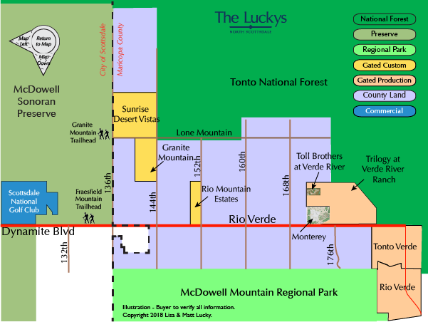 Granite Mountain Character Area is sometimes called the North Scottsdale Foothills area. The map includes the county land east of the City of Scottsdale as well as Tonto National Forest which borders to the north and east. The McDowell Mountain Recrational Park is to the south. Much of the land within the City of Scottsdale is owned by the city as part of the McDowell Sonoran Perserve.