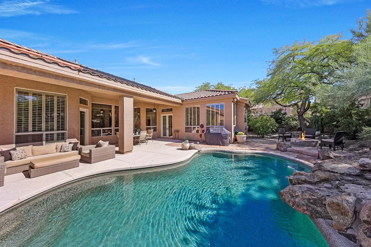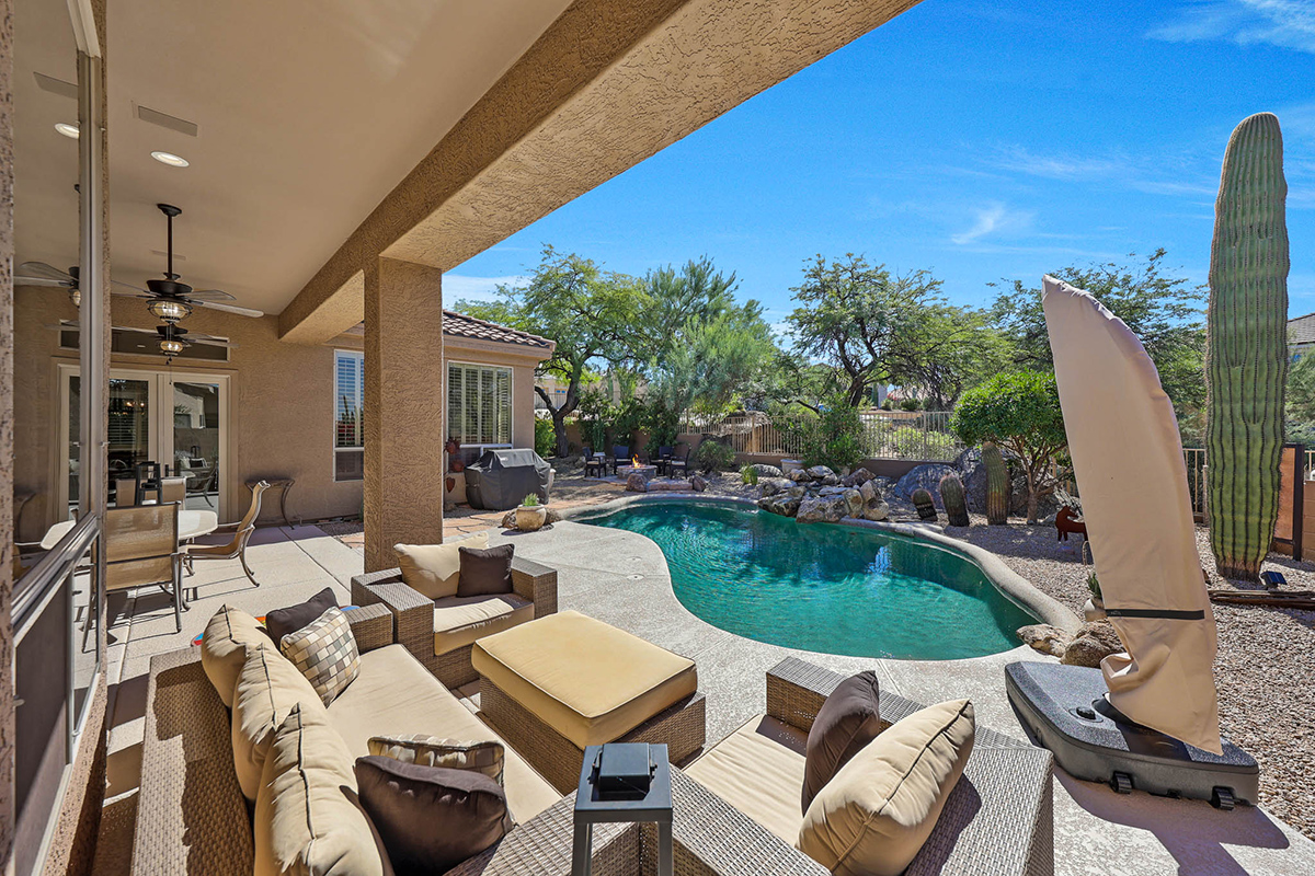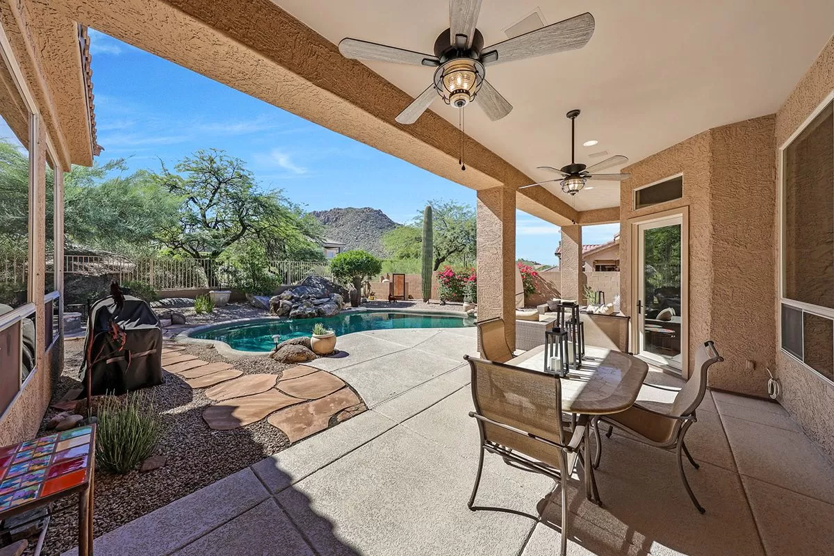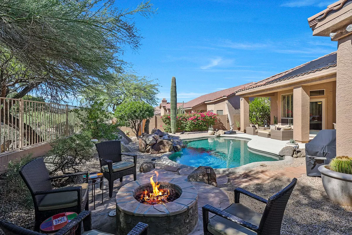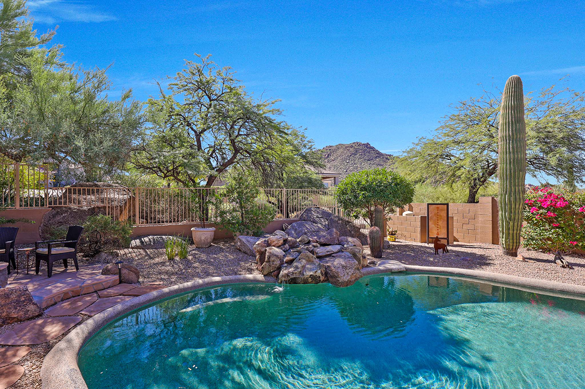 Beautifully remodeled and perfectly sized, this over 2,800 square foot home sits on a desirable corner lot backing to Natural Area Open Space (NAOS) for added privacy and desert views. The expanded floor plan provides additional square footage in the kitchen and family room, creating an ideal flow for everyday living and entertaining. Outdoor spaces embrace the Troon Mountain backdrop with a pebble-finish, heated pool (both solar and newly installed gas heater) featuring a rock waterfall, mature desert landscaping, a fire pit lounge area, covered patio, and low-maintenance yard. Home can be purchased turn-key furnished by a Separate Bill of Sale.