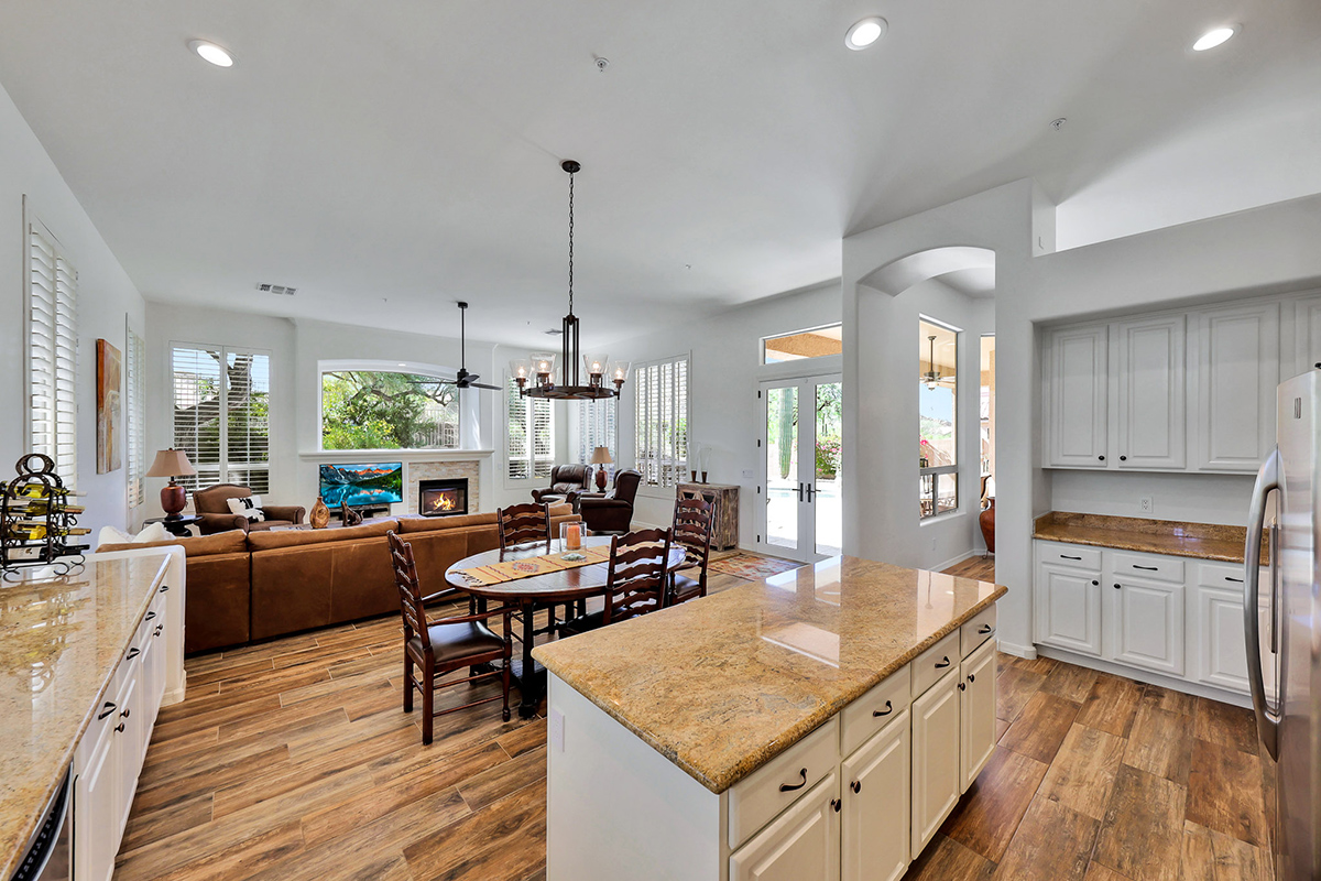 The open-concept kitchen and family room is the heart of the home, showcasing white cabinetry, granite counters, stainless steel appliances with gas stove, a center island, and a stacked-stone fireplace and entertainment wall with exterior patio access. The formal great room (living and dining) highlights large windows framing the backyard and mountain views.
