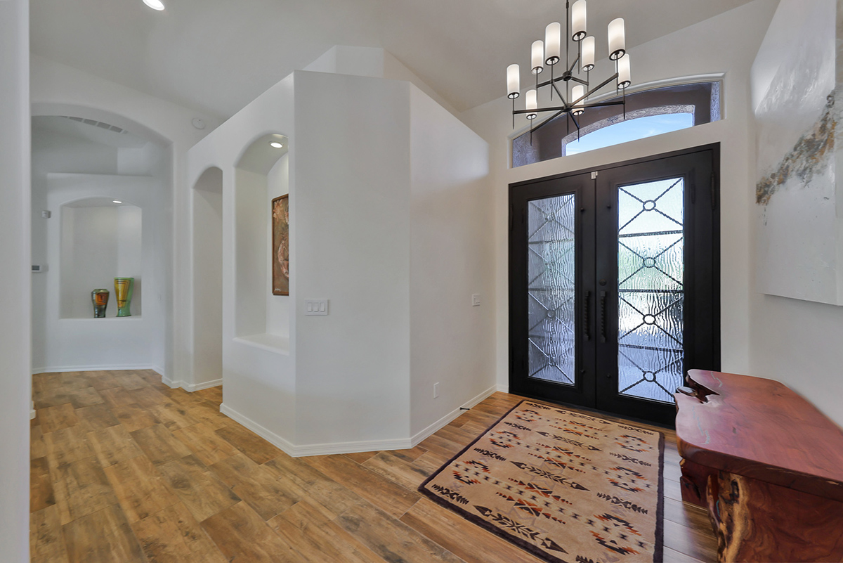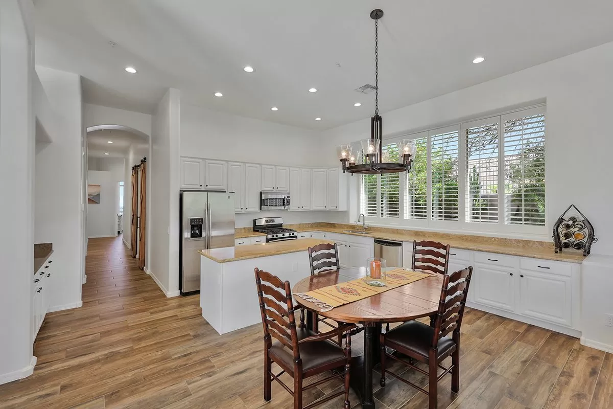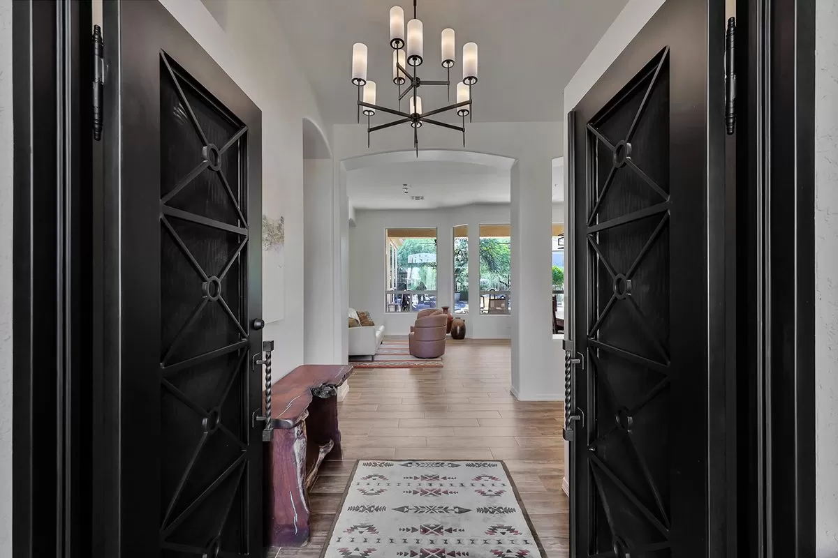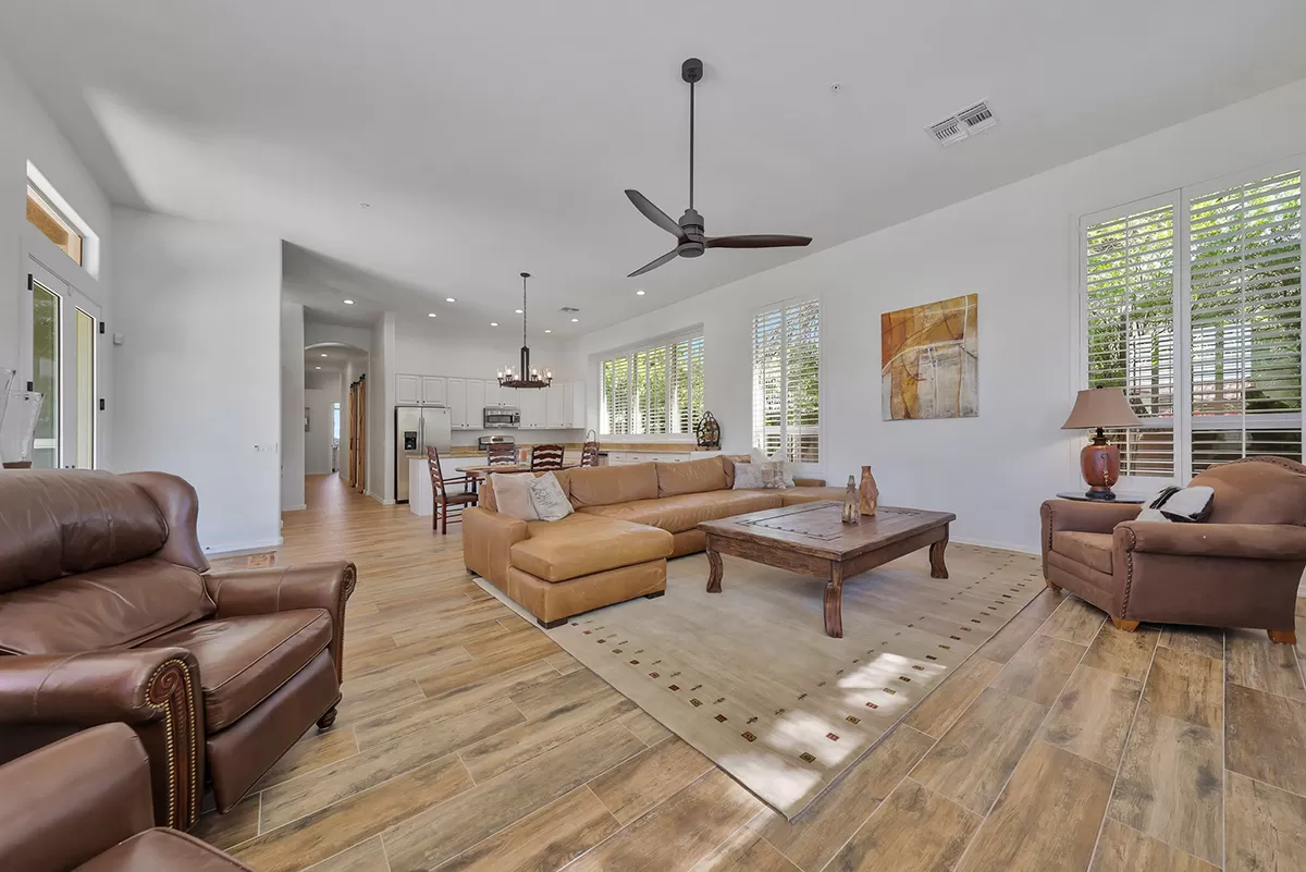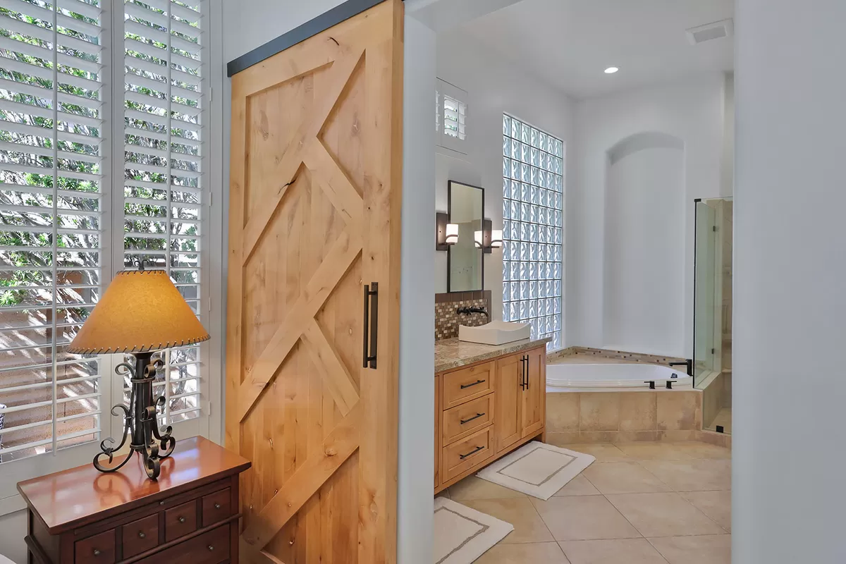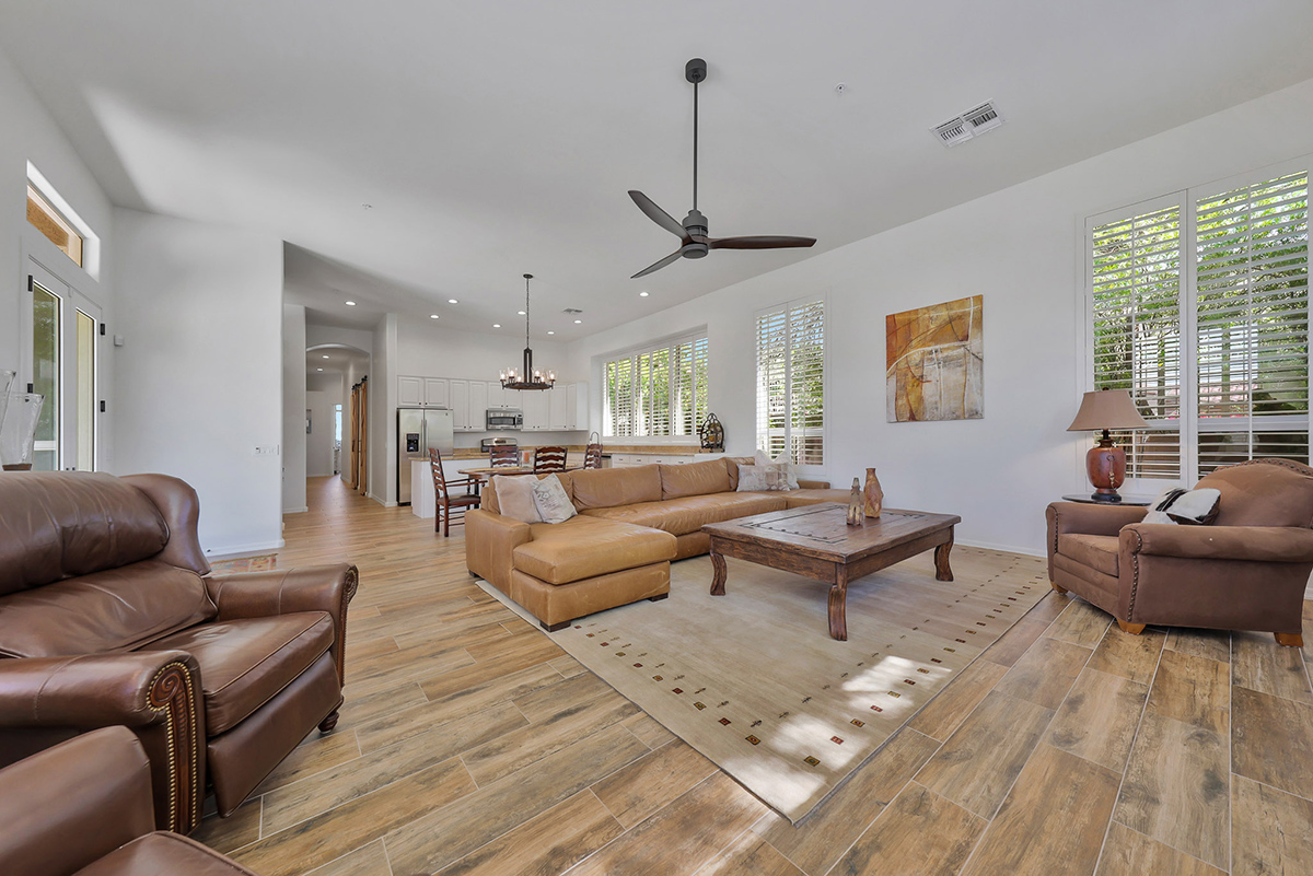 Extensive updates throughout include: new patio doors (living room and bedroom), new front door, guest suite remodel, complete hall bath remodel, interior and exterior paint (including doors, trim, ceilings, and shutters), new light fixtures and ceiling fans, replaced door hardware, switches, and outlets, and new soft close barn doors in the primary suite and office. Pool equipment has been upgraded with a variable-speed pump, Pentair smart controls with app access, LED lighting, and chlorinator. Additional highlights include wood-look plank tile floors throughout most of the home, plantation shutters, a three-car garage, and HVAC units replaced in 2018 and 2017.