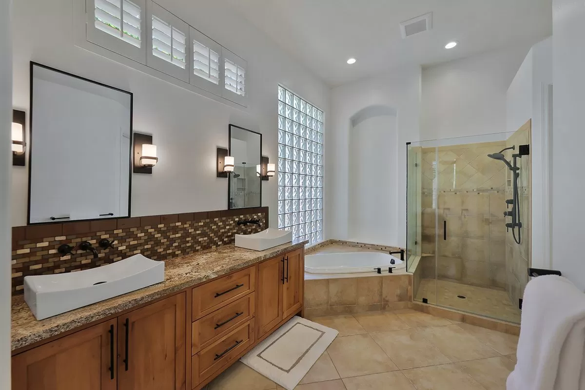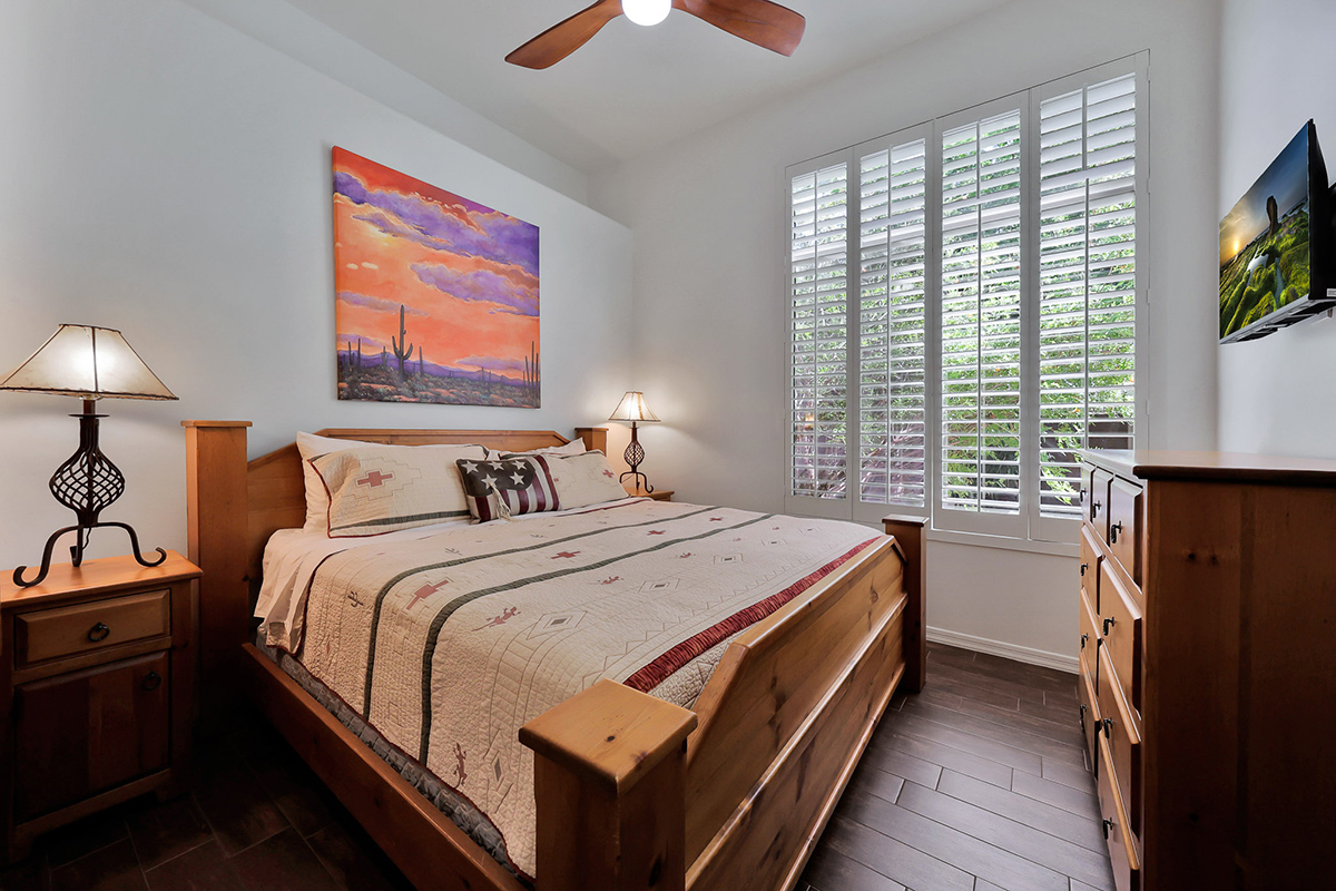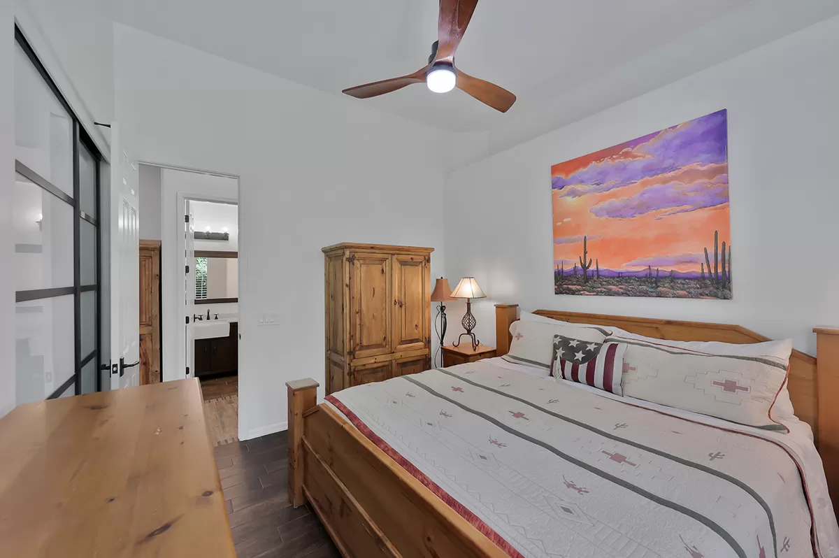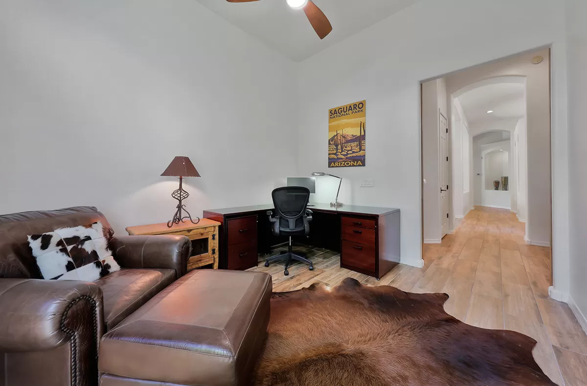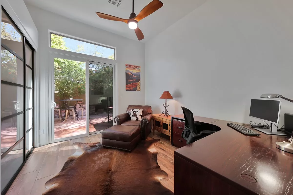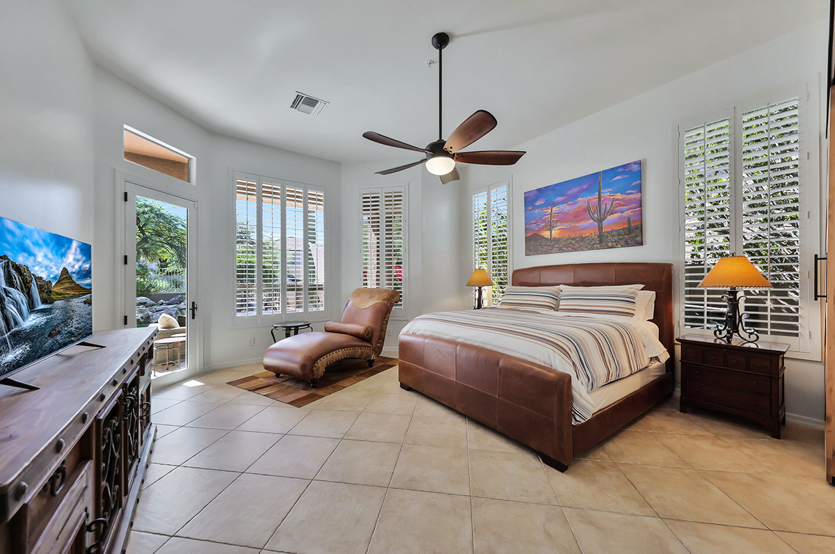 The primary suite features a spacious bedroom with patio access overlooking the backyard and mountain vistas. The primary bathroom offers a glass-enclosed shower, soaking tub, dual-sink vanity, and a large walk-in closet with built-in organization. Two additional guest suites include one ensuite and one adjacent to a hall bath. A private office with its own side patio has been converted into a fourth bedroom with a closet, adding flexibility to the floor plan.