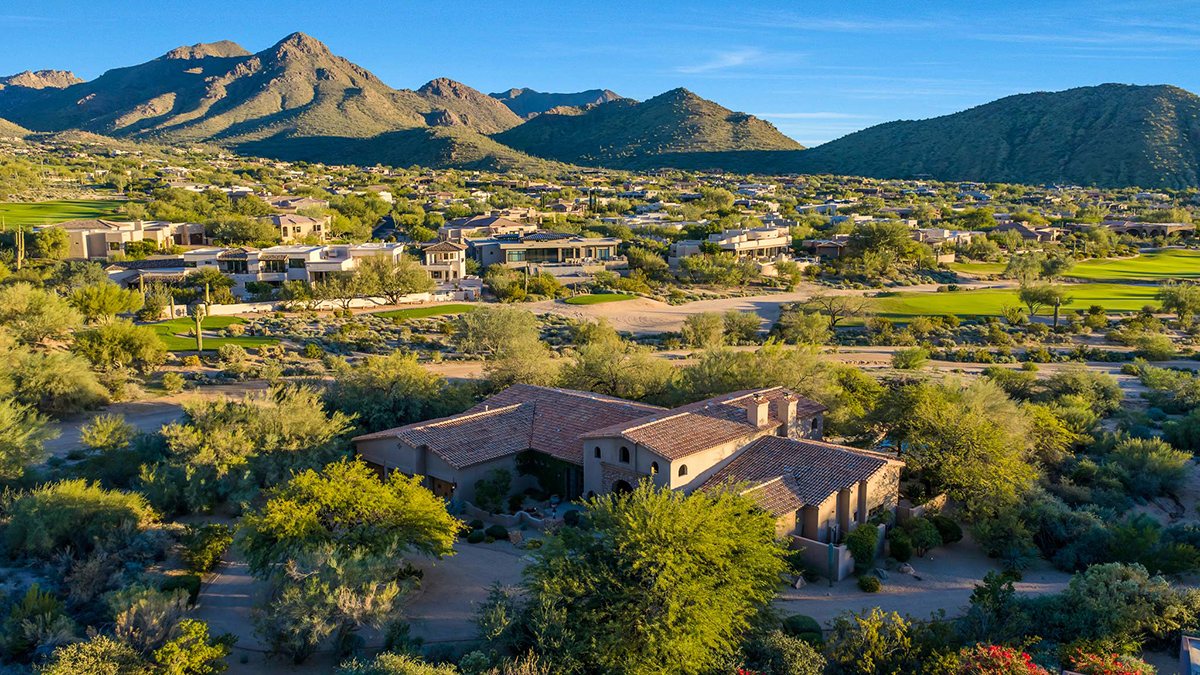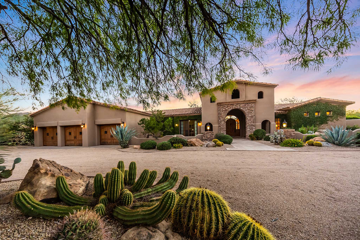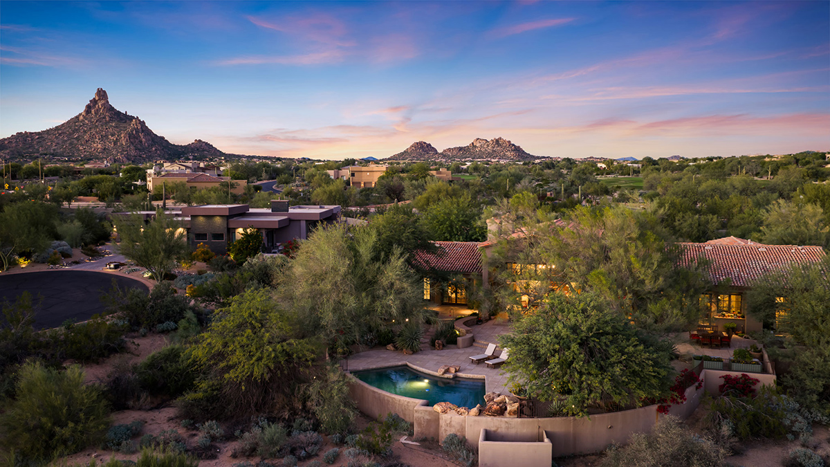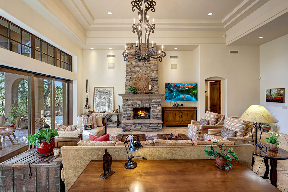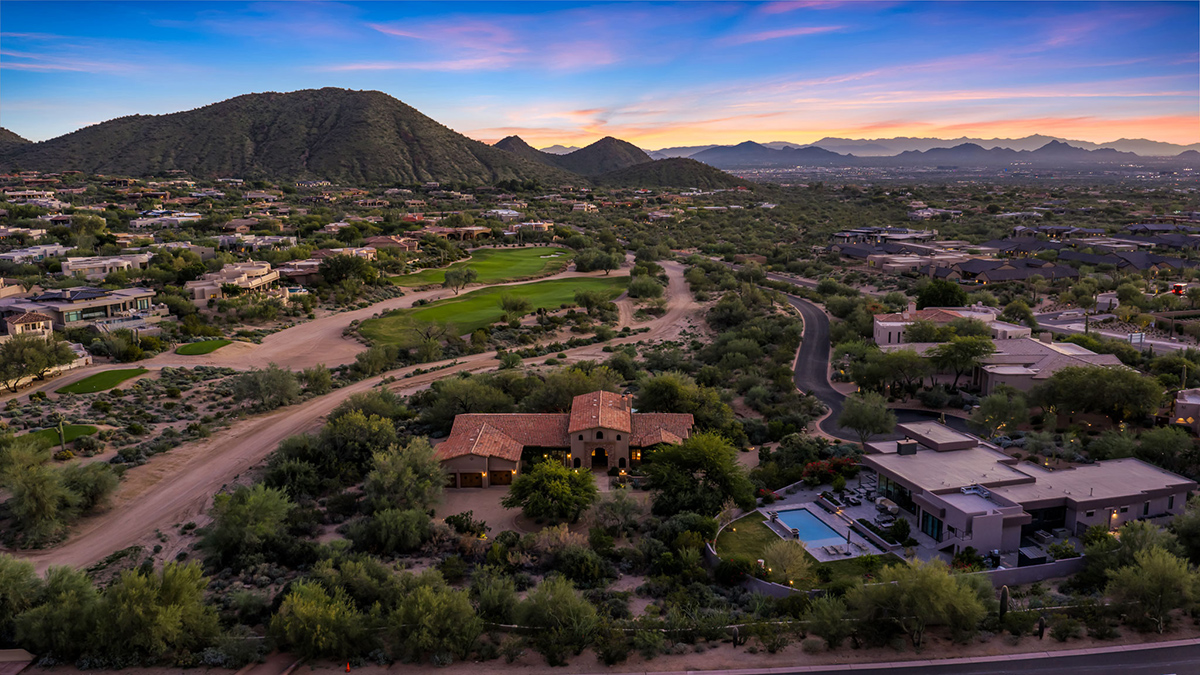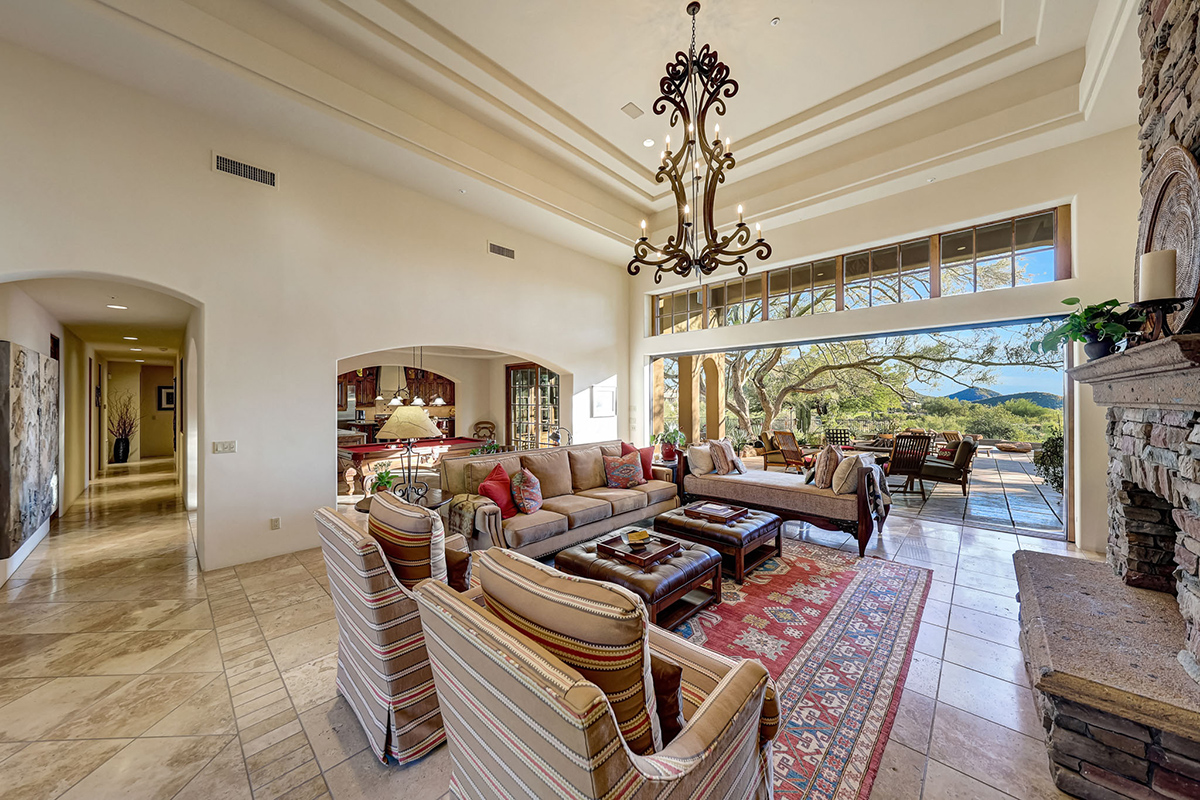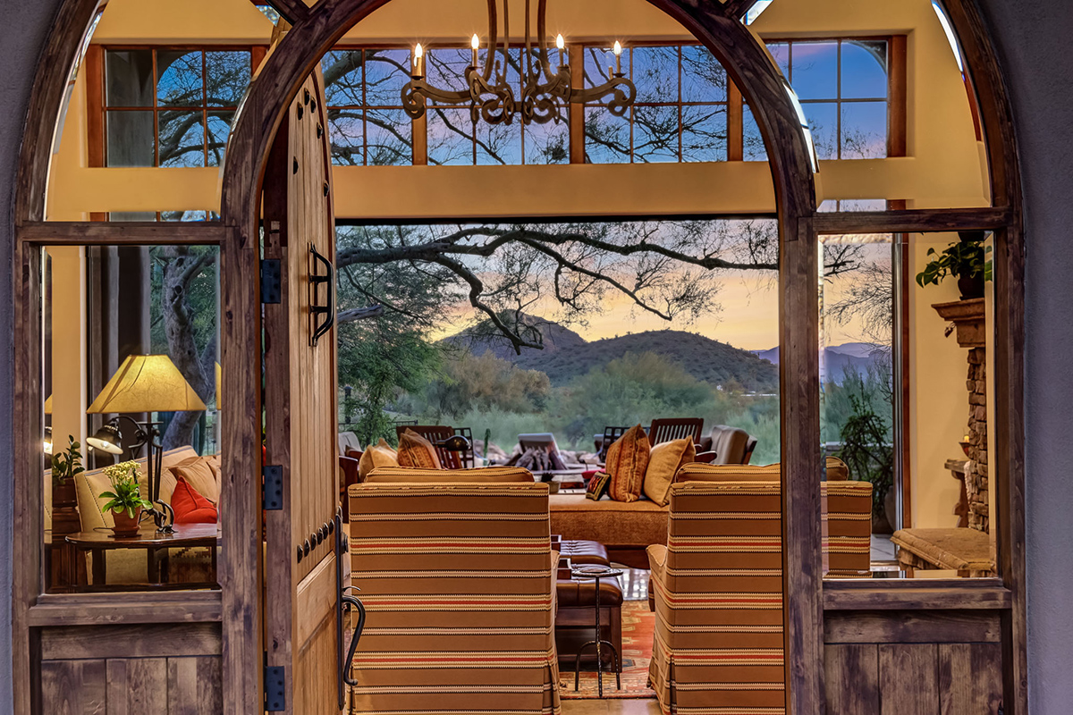 Completely remodeled and reimagined in 2008, this exceptional 4 bedroom, 4.5 bath, 4,112 sq ft home with a 3-car garage is located in the guard-gated community of Glenn Moor at Troon Village. Perfectly positioned to view the 10th hole of the private Troon Country Club Golf Course in its entirety, the home also enjoys stunning down-valley, mountain, and city-light views. Glenn Moor offers 24-hour secured entry, a clubhouse with pool and tennis court, and guest parking. A winding driveway leads to mature landscaping filled with unique specimens, stately trees, and flowering accents. Inside, the home showcases soaring ceilings, clerestory windows, wood casement windows and doors, and travertine flooring throughout the main living areas finished with clean, modern smooth walls.