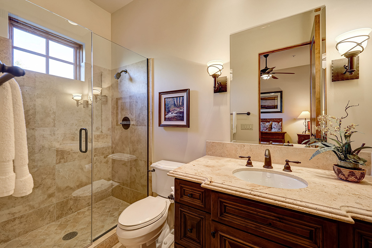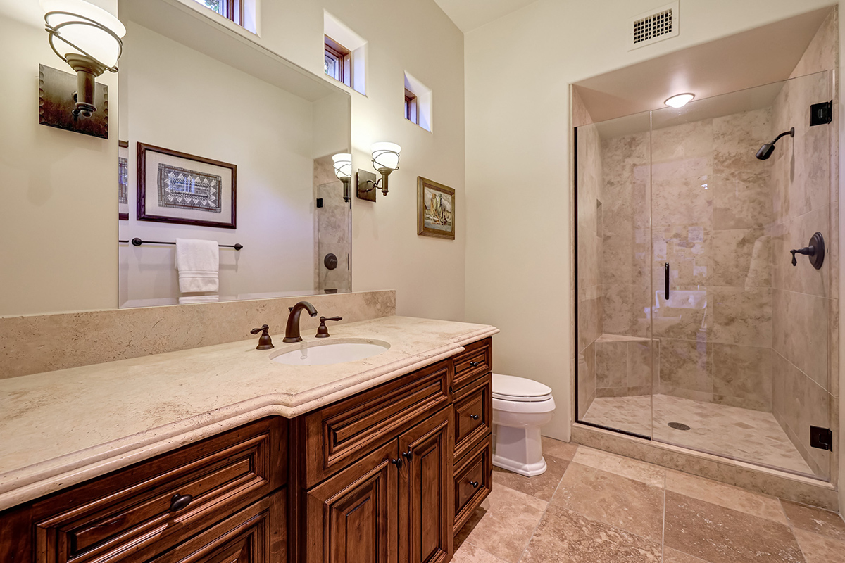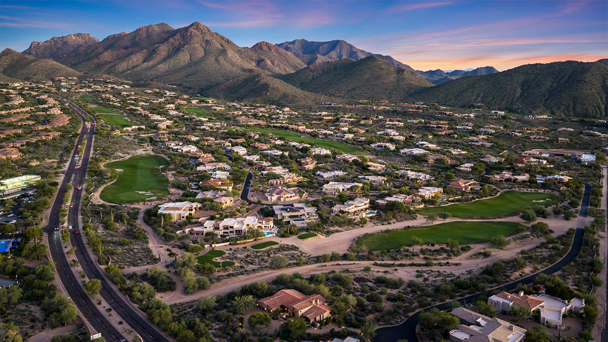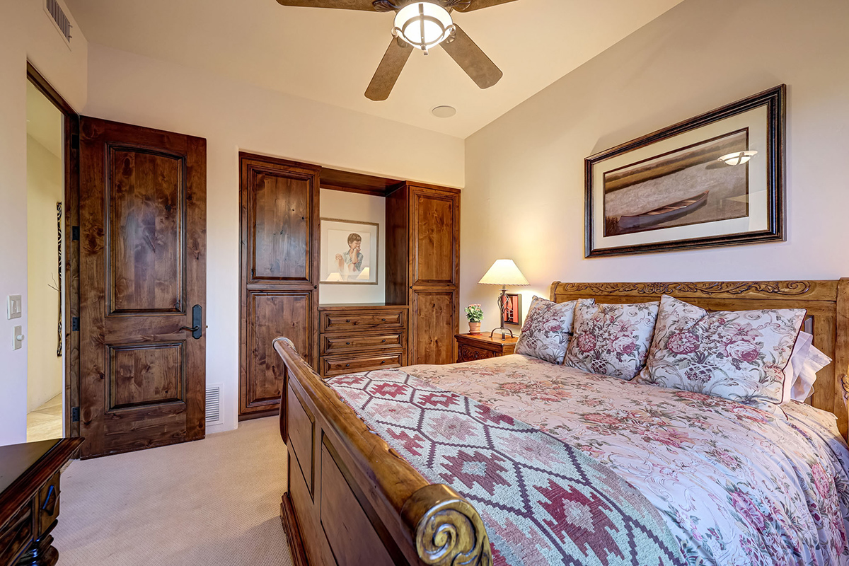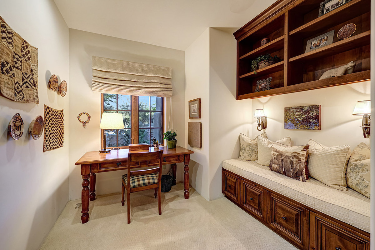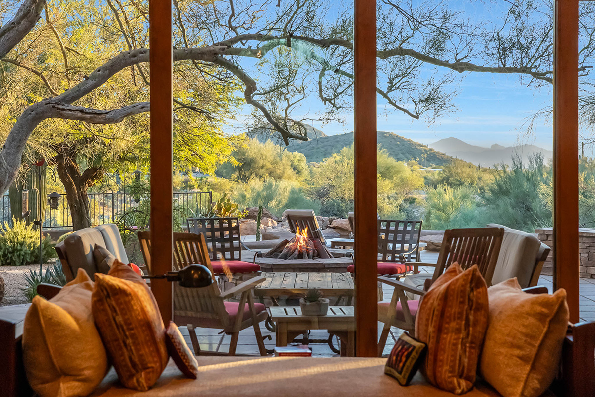 Completely remodeled and reimagined in 2008, this exceptional 4 bedroom, 4.5 bath, 4,112 sq ft home with a 3-car garage is located in the guard-gated community of Glenn Moor at Troon Village. Perfectly positioned to view the 10th hole of the private Troon Country Club Golf Course in its entirety, the home also enjoys stunning down-valley, mountain, and city-light views. Glenn Moor offers 24-hour secured entry, a clubhouse with pool and tennis court, and guest parking. A winding driveway leads to mature landscaping filled with unique specimens, stately trees, and flowering accents. Inside, the home showcases soaring ceilings, clerestory windows, wood casement windows and doors, and travertine flooring throughout the main living areas finished with clean, modern smooth walls.