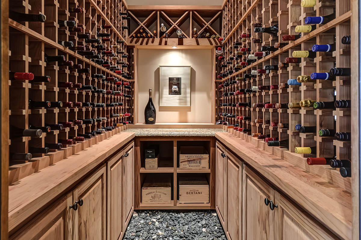The family room features a stacked-stone fireplace, full pocketing doors that blend indoor and outdoor living seamlessly, and a beautiful arched entry door with sidelights. Formal dining (currently used as a billiards room) offers exterior access. The chef’s kitchen overlooks the backyard and offers stained cabinetry, ogee-edge granite counters, stainless steel appliances, a stainless apron sink, prep sink in the island, gas cooktop, custom hood vent, walk-in pantry, two dishwashers, and a side-by-side fridge/freezer. The kitchen flows into the breakfast nook with a full bar with sink and beverage refrigerator, and an air-conditioned wine room appointed with smooth pebble flooring, ideal for entertaining.