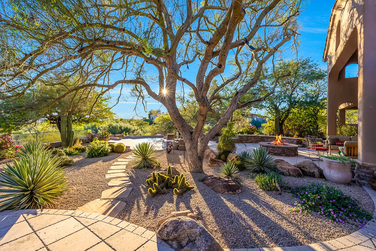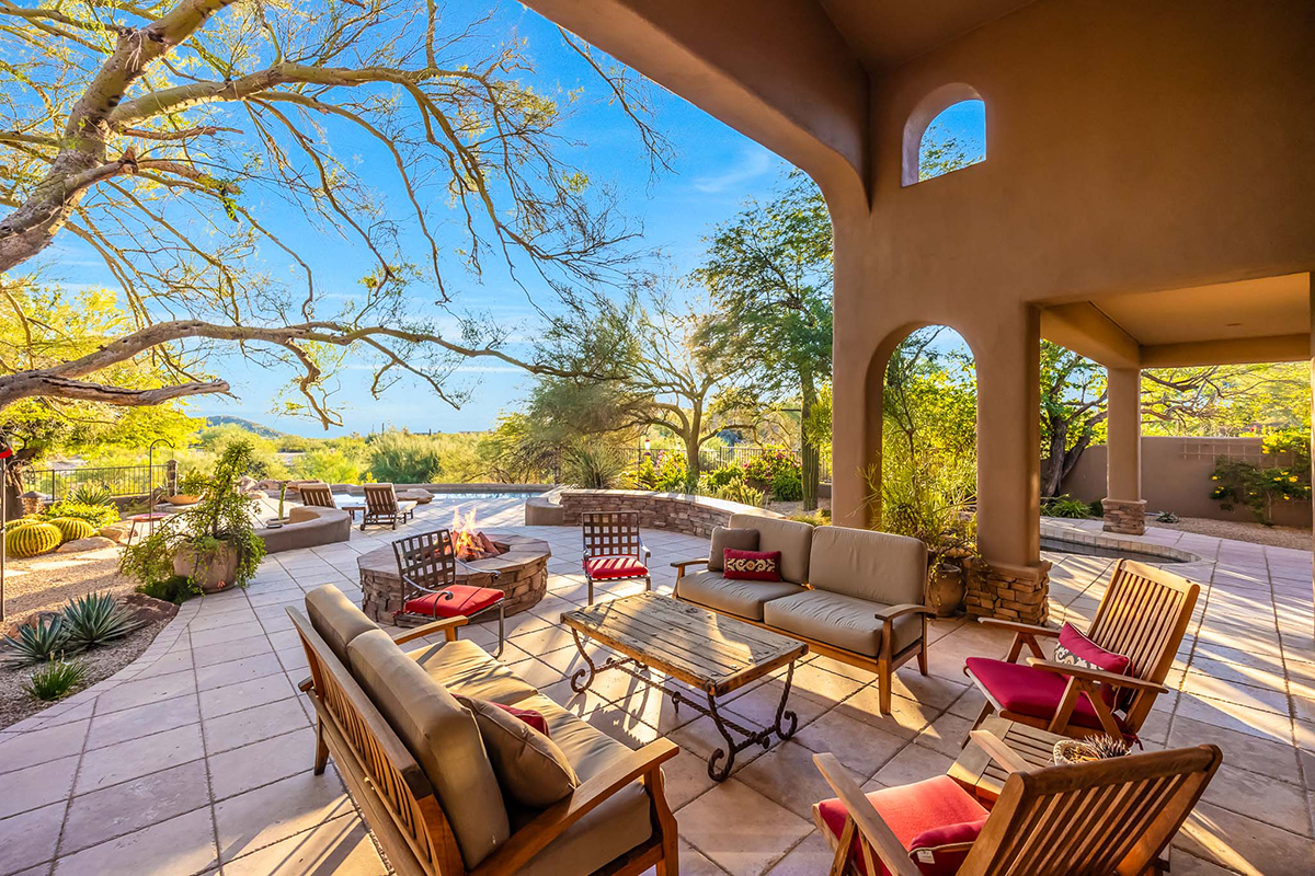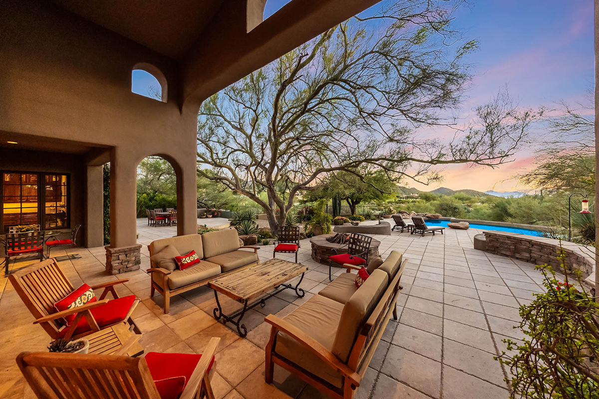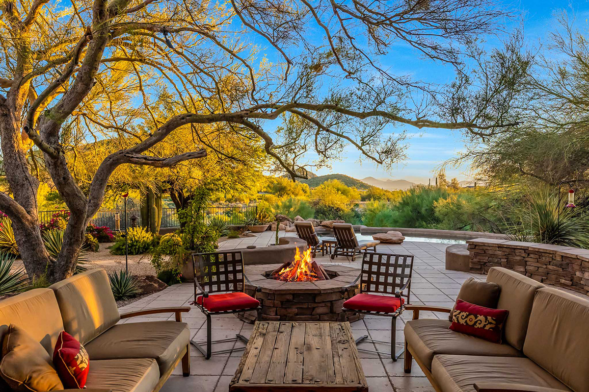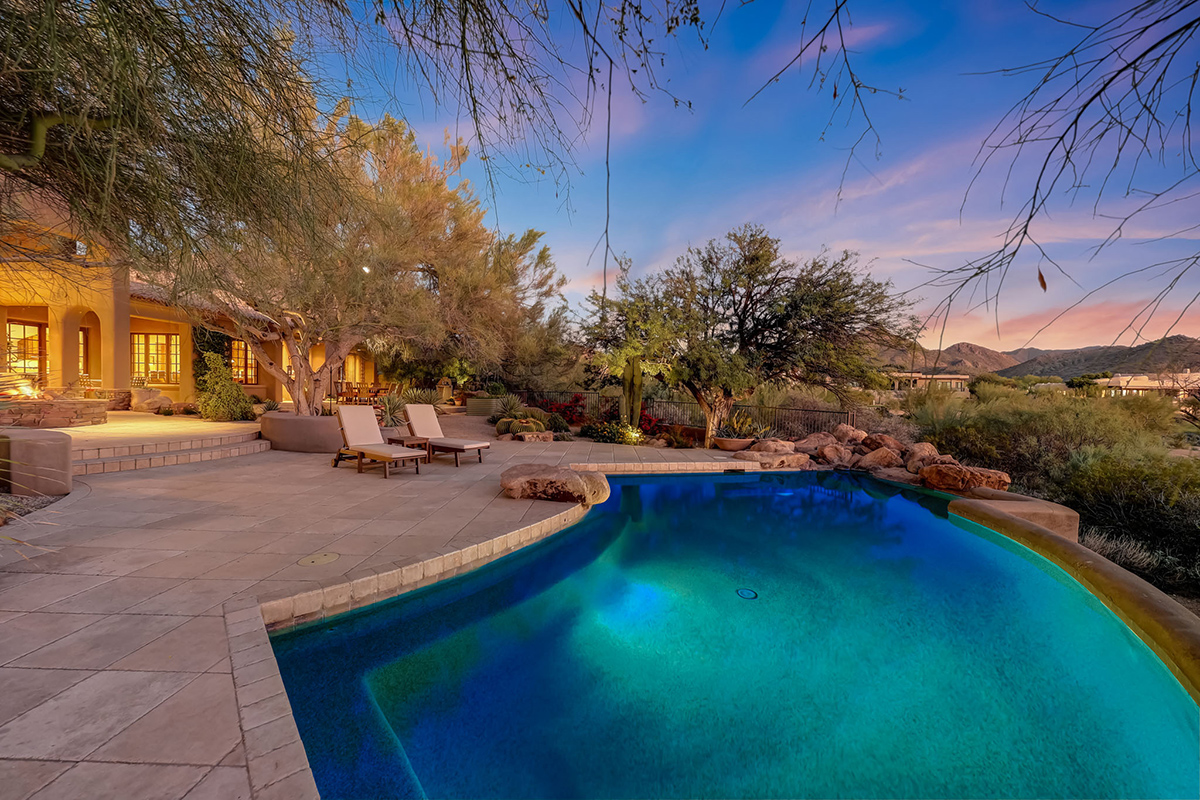 The backyard is truly a retreat: a stunning pool positioned at the edge of the yard, a centerpiece fire pit, large covered patio with tall ceilings, a private spa just off the primary suite, raised planters, and lush, thoughtfully designed landscaping. The premium cul-de-sac lot is flanked by open space on three sides, offering exceptional privacy and panoramic views of golf, mountains, desert landscape, and twinkling city lights. A rare opportunity in one of Troon’s most desirable guard-gated enclaves.