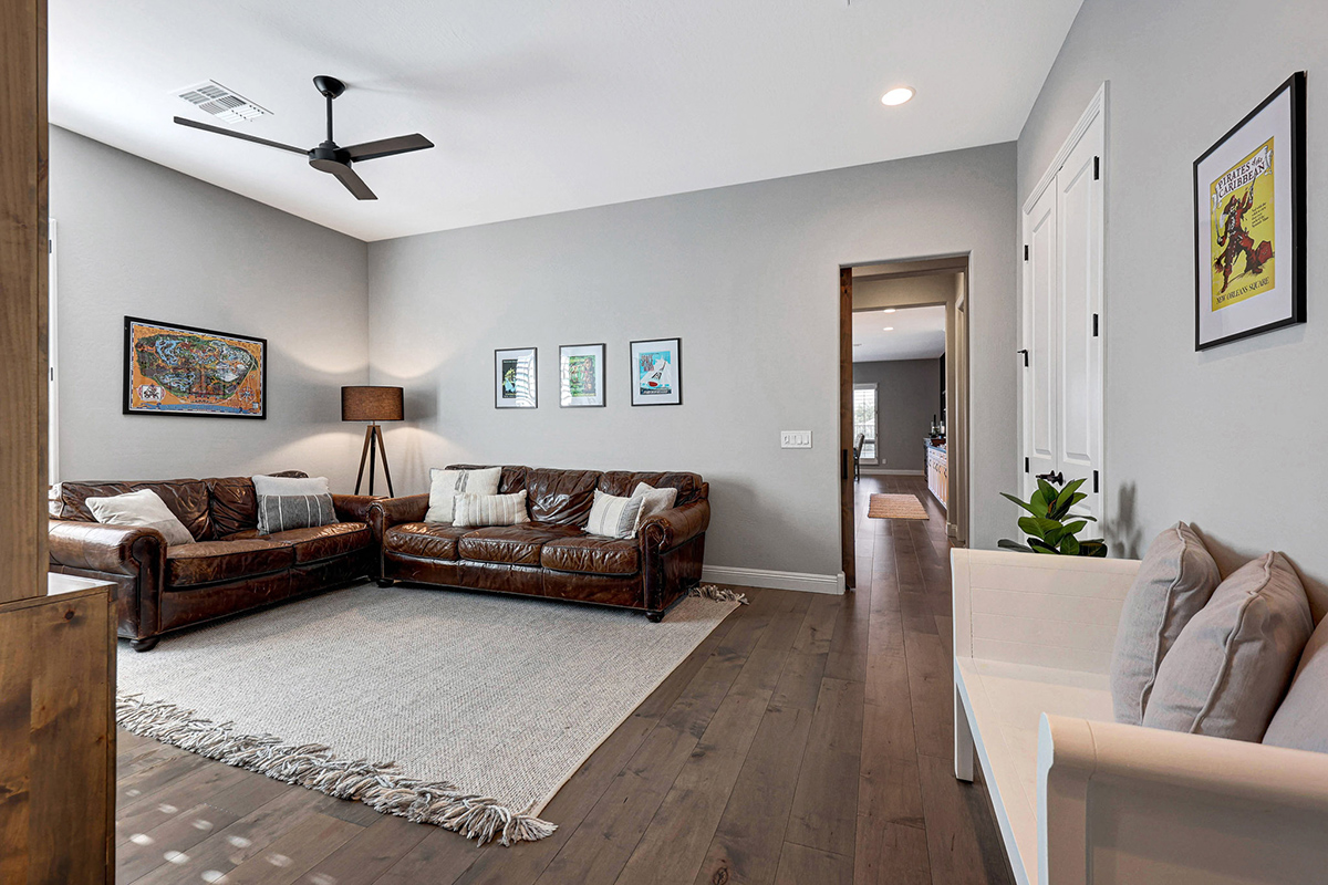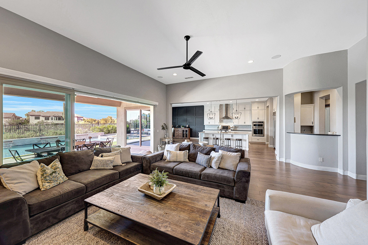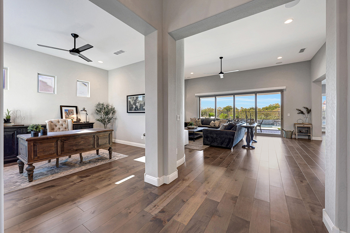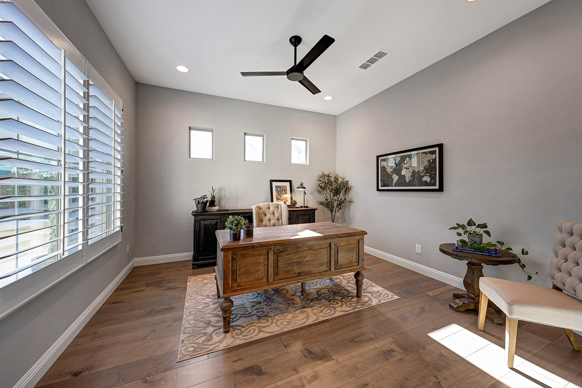Located in the gated community of Palomino Estates by Pulte Homes, this Santa Barbara-style residence offers 3 bedrooms plus an office & bonus room, 3.5 baths, 3,558 square feet, & a 3-car garage. Built in 2020 and set within an intimate enclave of just 39 homes, it sits on the largest lot in the neighborhood with Natural Area Open Space behind—providing exceptional privacy & picturesque Black Mountain views. A spacious paver courtyard welcomes you into a warm, refined interior featuring wood flooring, new designer lighting & fans, multiple custom accent walls w/ thoughtfully crafted wood paneling, & wood shutters throughout. The flexible floor plan includes an office off the entry, a generous great room with expansive sliding doors, & motorized window shades for indoor & outdoor living for seamless indoor-outdoor living.