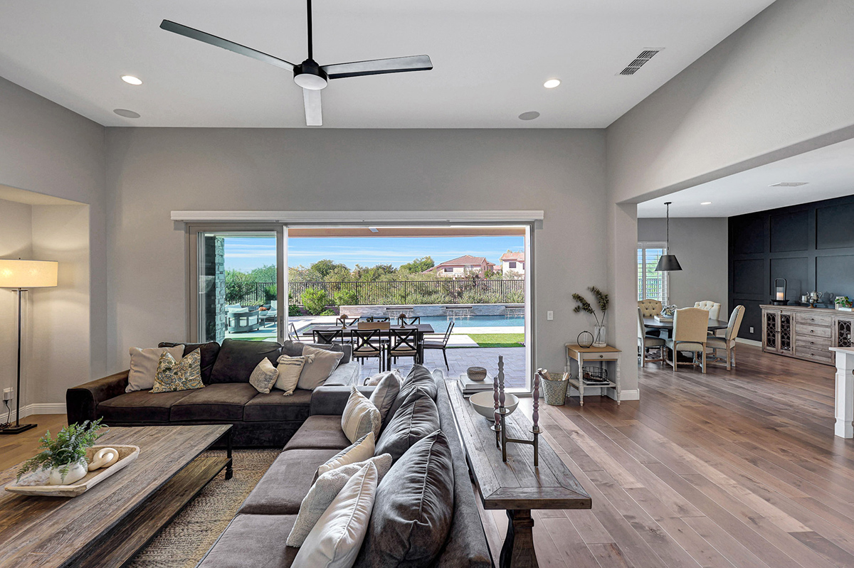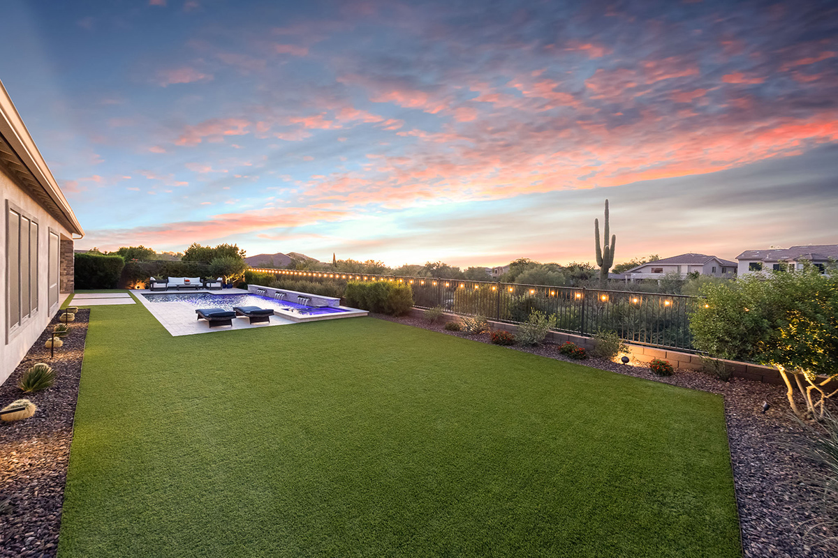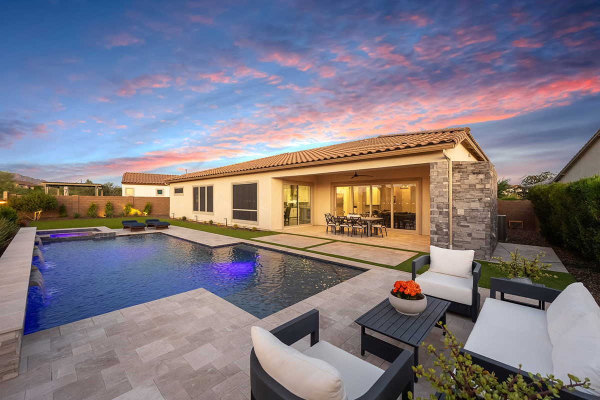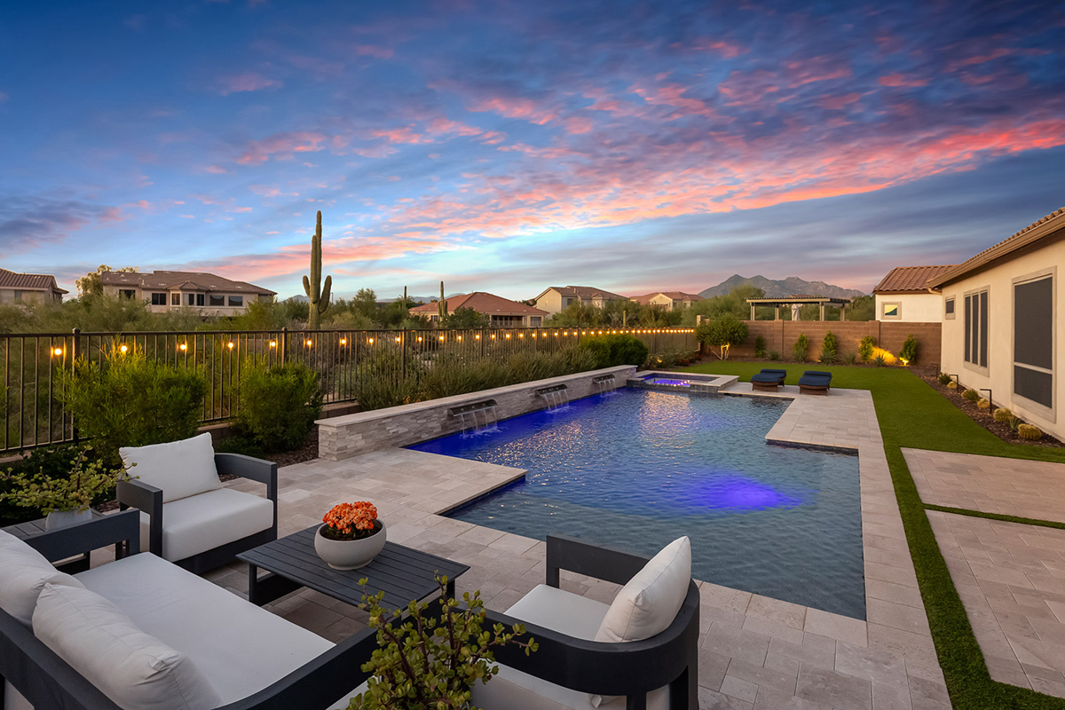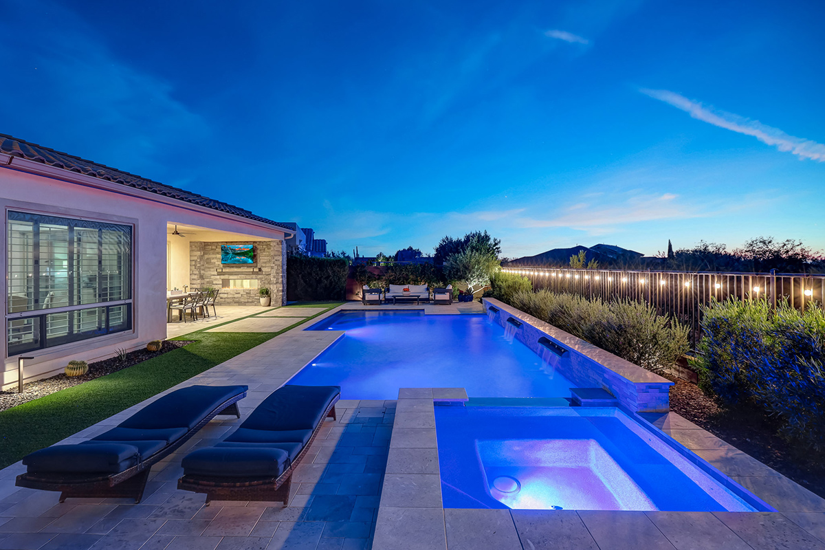 The backyard is a true showpiece, featuring travertine hardscape, artificial turf, and a heated saltwater pool and spa with Baja shelf and water features, along with a stunning linear stone fireplace with TV mount under the large covered patio. Backing to open space, the yard provides an expansive, private setting ideal for year-round enjoyment.