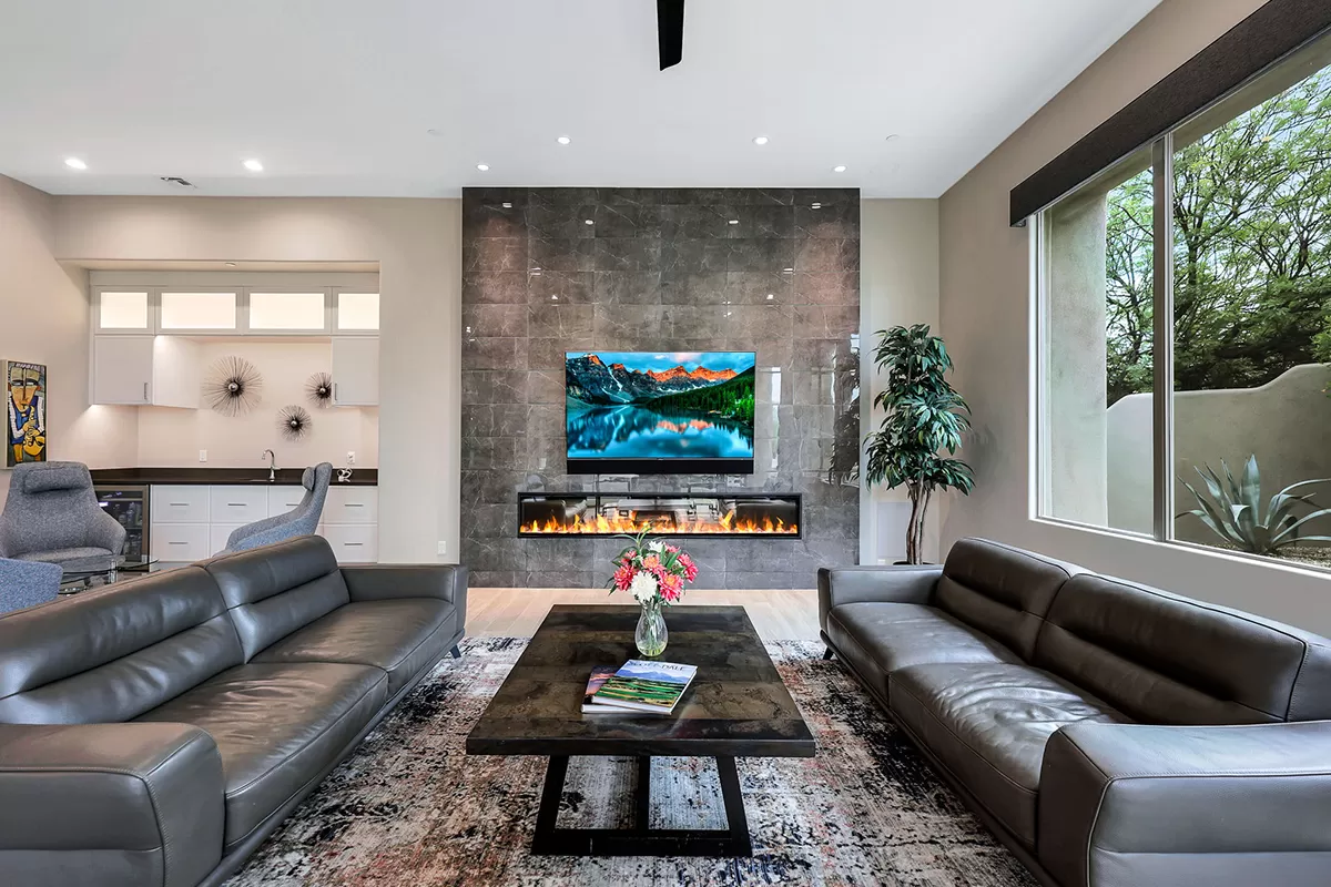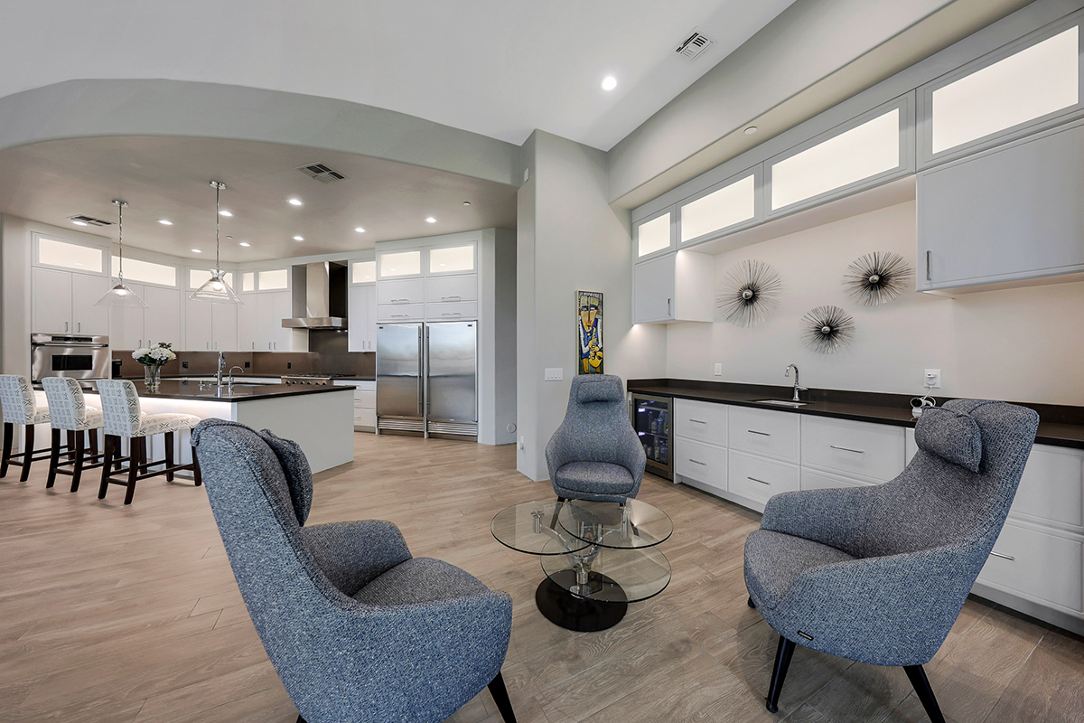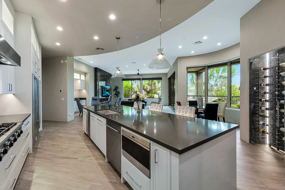 Inside, the popular split floor plan showcases wood-like tile flooring and a striking kitchen with new cabinetry, counters, and stainless steel appliances, including a gas cooktop, side by side Subzero Fridge/Freezer, drawer microwave, dishwasher, ice maker and double wall ovens. Adjacent to the kitchen is a built-in wine cooler storage and a wet bar with sink and beverage fridge. The spacious great room is anchored by a modern floor-to-ceiling fireplace and retractable sliders that seamlessly open to the outdoors.