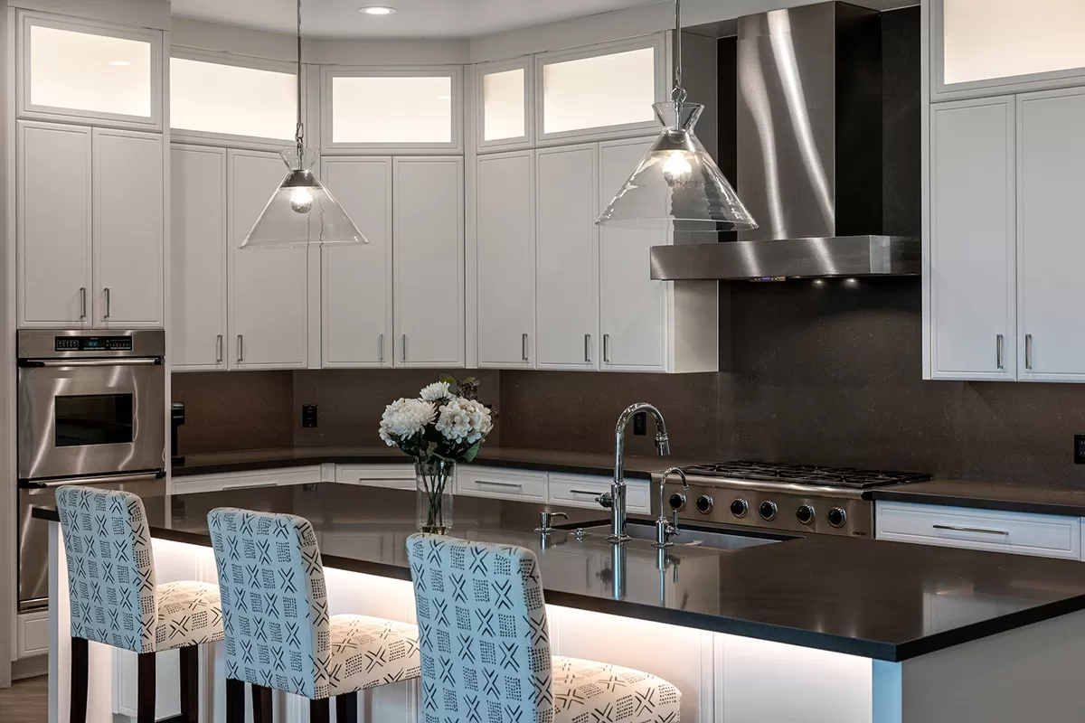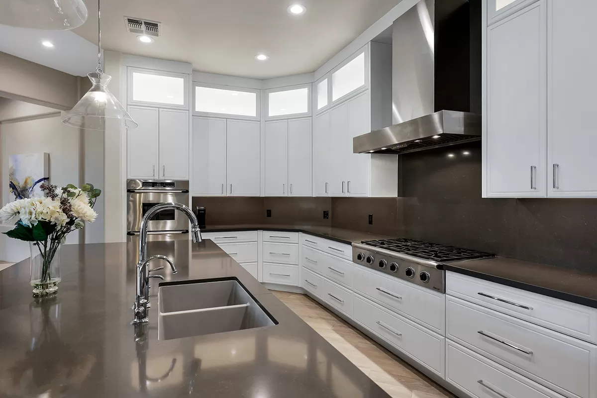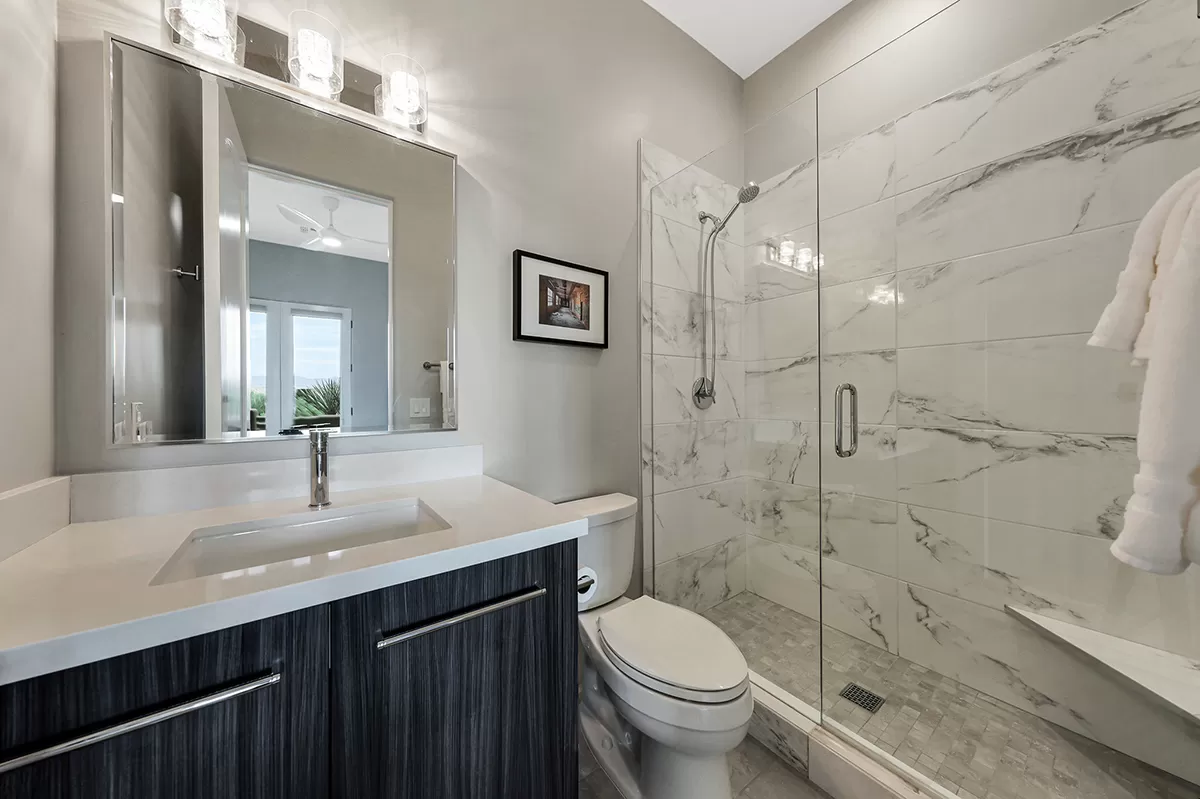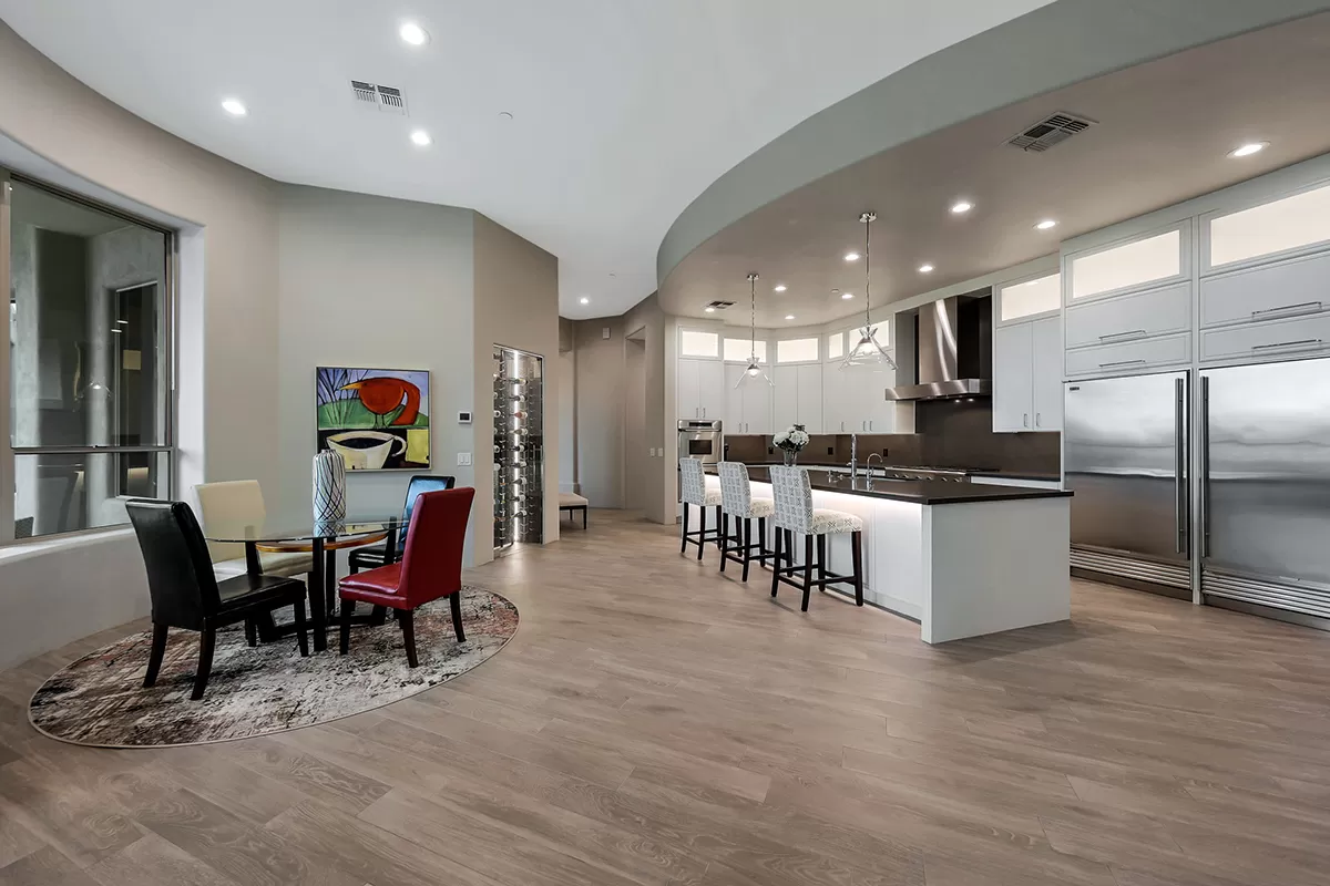 Inside, the popular split floor plan showcases wood-like tile flooring and a striking kitchen with new cabinetry, counters, and stainless steel appliances, including a gas cooktop, side by side Subzero Fridge/Freezer, drawer microwave, dishwasher, ice maker and double wall ovens. Adjacent to the kitchen is a built-in wine cooler storage and a wet bar with sink and beverage fridge. The spacious great room is anchored by a modern floor-to-ceiling fireplace and retractable sliders that seamlessly open to the outdoors.
