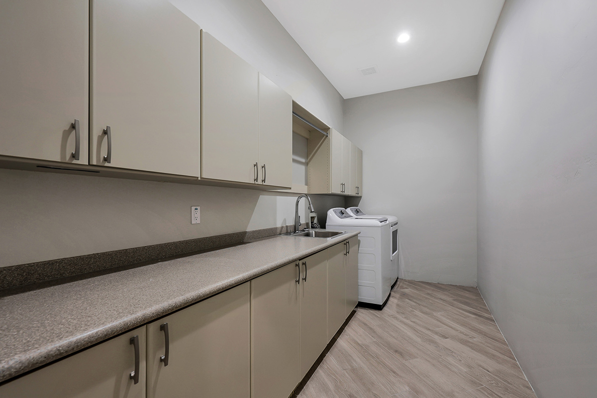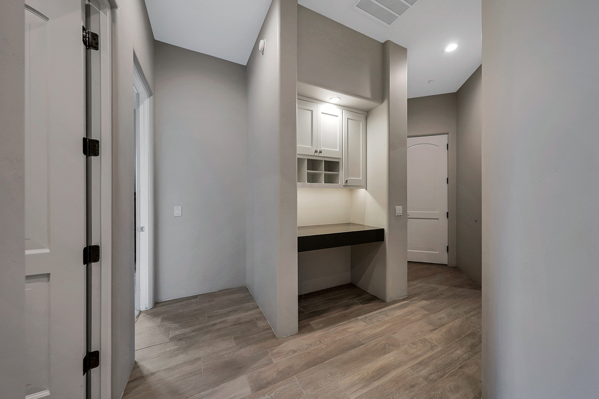 The primary suite is a private retreat with a spa-like bath featuring a freestanding tub, dual vanities, and walk-in shower. All guest bedrooms are ensuite and enjoy private entrances with covered patios, creating the perfect setup for family or visitors. The private office with exterior access has a box beam ceiling, built-in cabinets and floating shelves. Additional highlights include a large laundry with sink and a granite key drop with cabinetry off the garage entry.