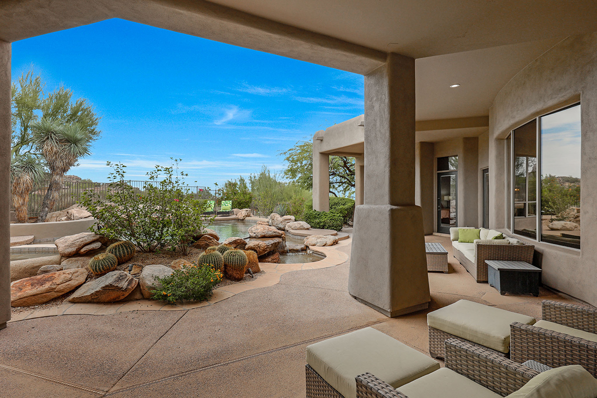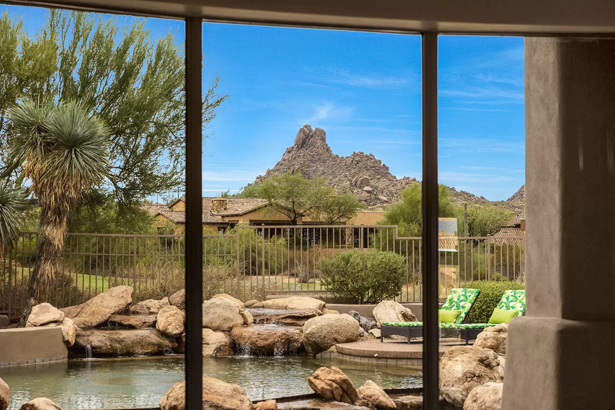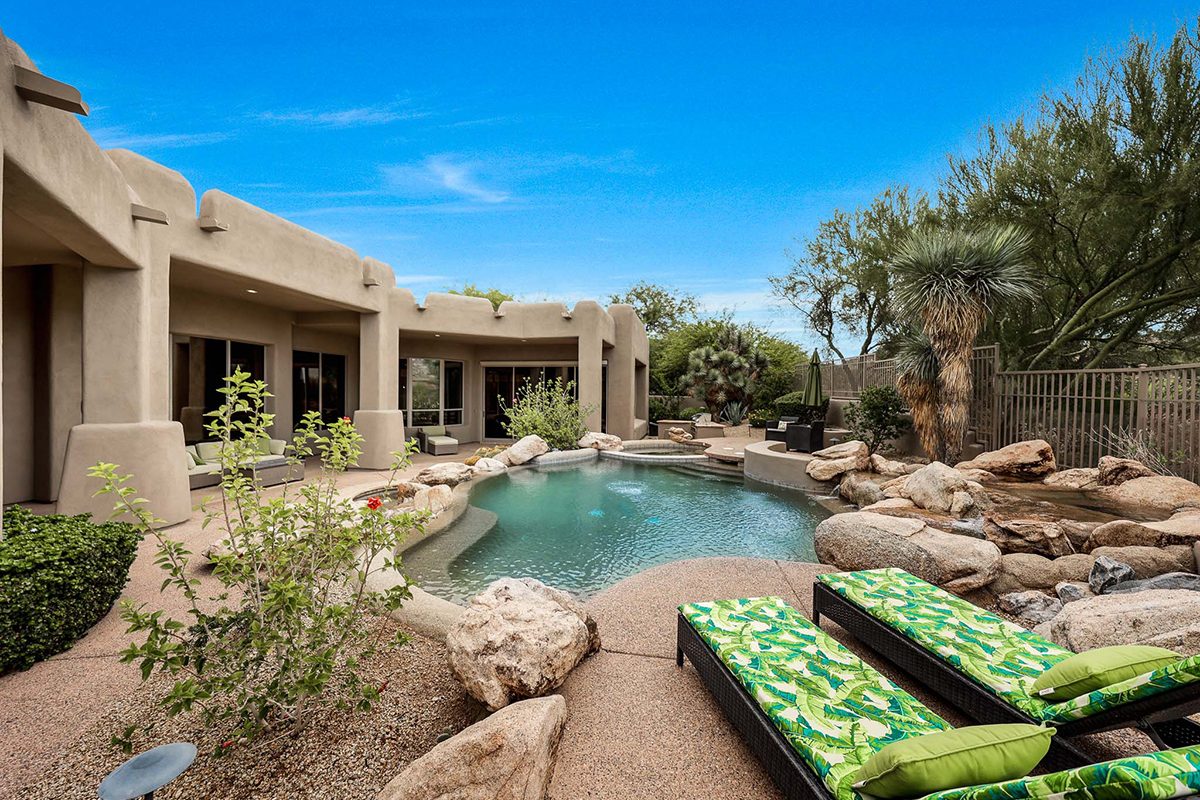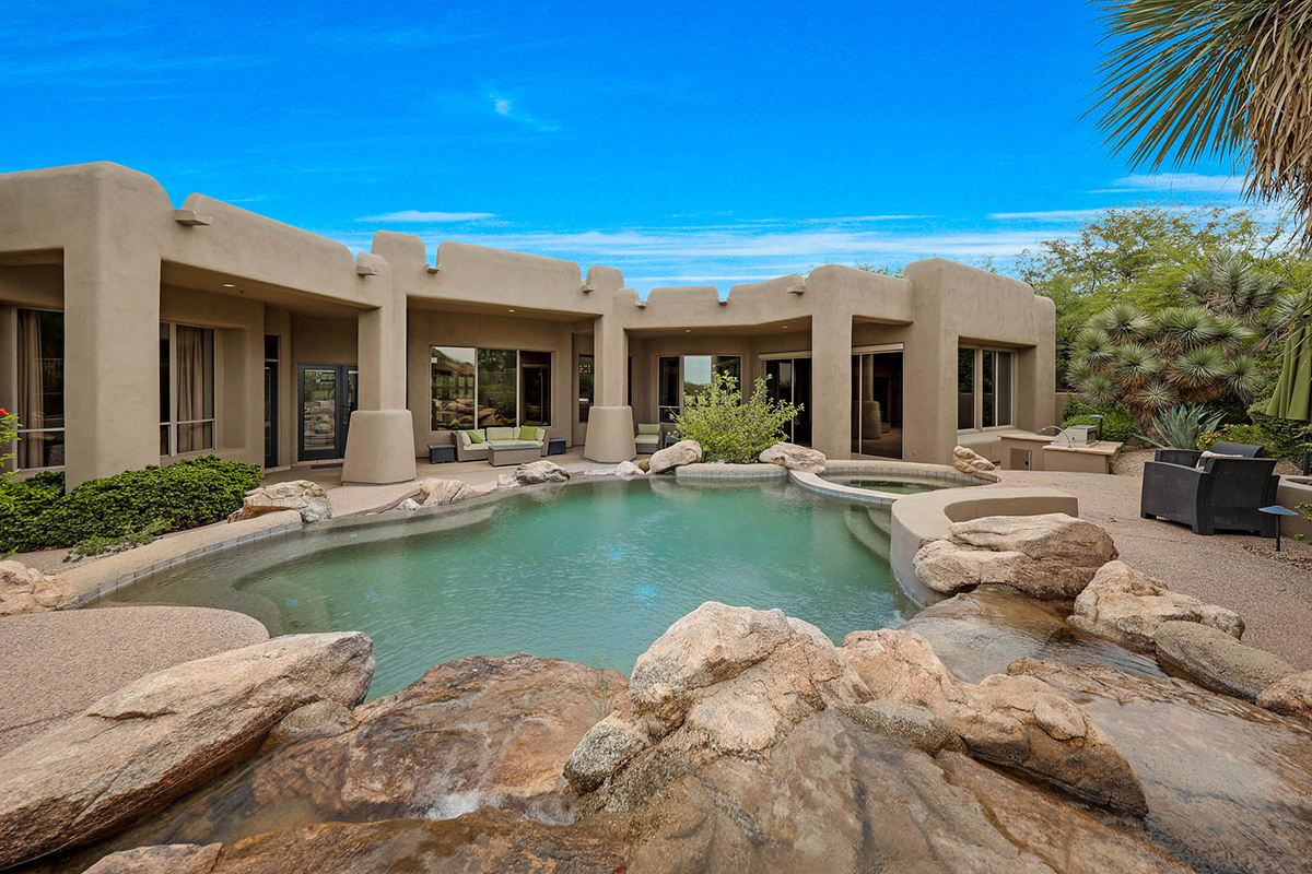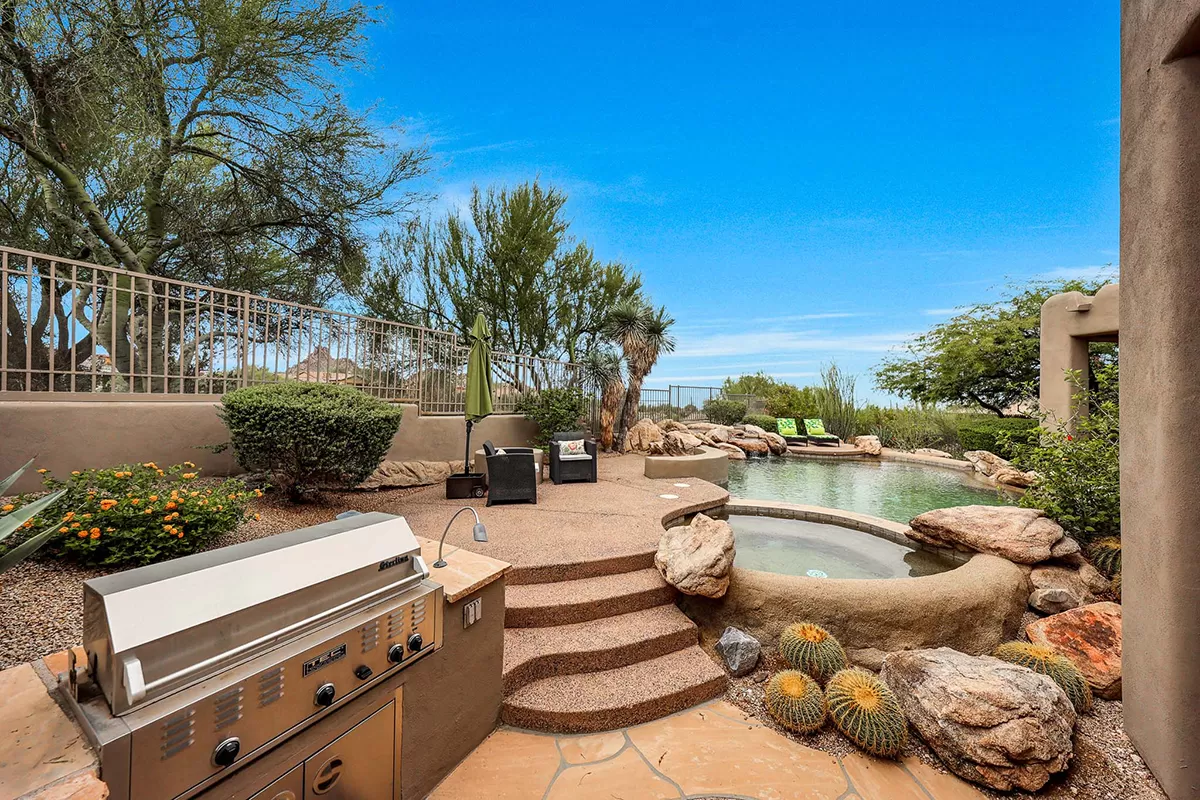 Outdoor living is unmatched with an elevated-tier backyard featuring a resort-style pool with waterfalls and boulder accents, spa, built-in barbecue, fire pit and large covered patio, all capturing golf course and direct Pinnacle Peak mountain views.