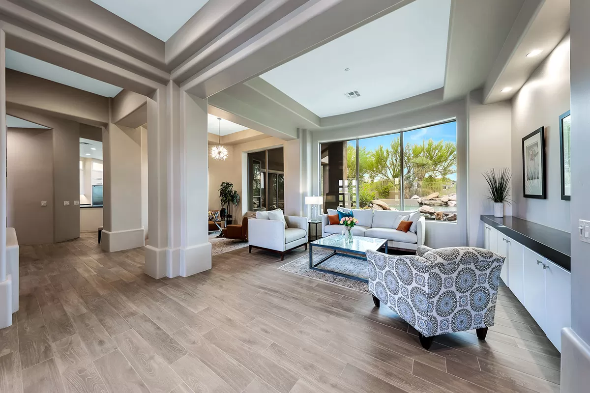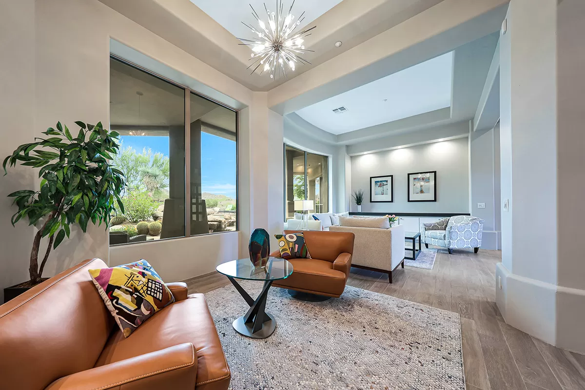 Positioned on a premier golf course lot in guard-gated Pinnacle Canyon at Troon North, this extensively remodeled MI Homes residence was completed in 2022 and offers 4,547 square feet of refined living with four bedrooms plus an office, four and a half baths, and a three-car temperature-controlled garage with a Tesla charger. The home is being offered completely turnkey, with most furniture and accessories included.