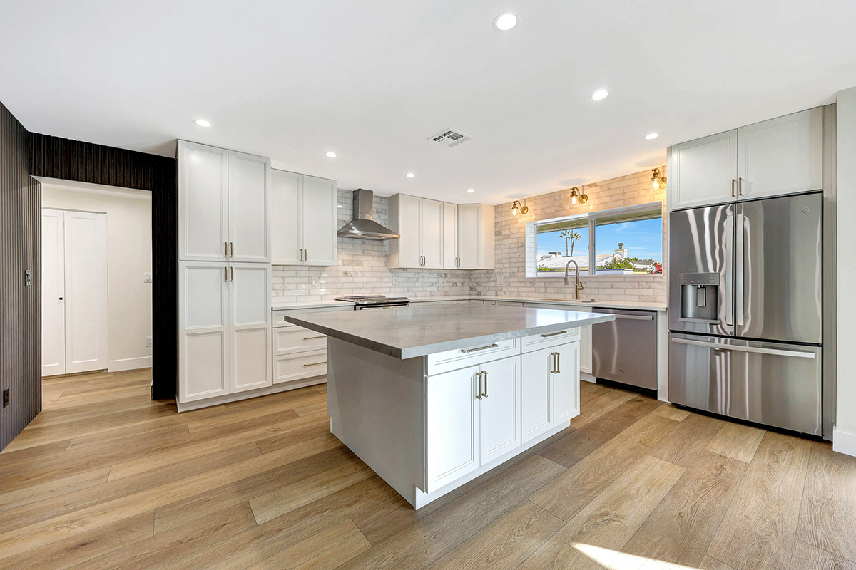 New LVP flooring flows throughout, unifying each space. The refreshed kitchen showcases stainless steel appliances, stone countertops, a center prep island, full-height tile backsplash, accent lighting over the sink, and updated cabinetry, creating a clean, modern aesthetic that complements the home’s overall design.