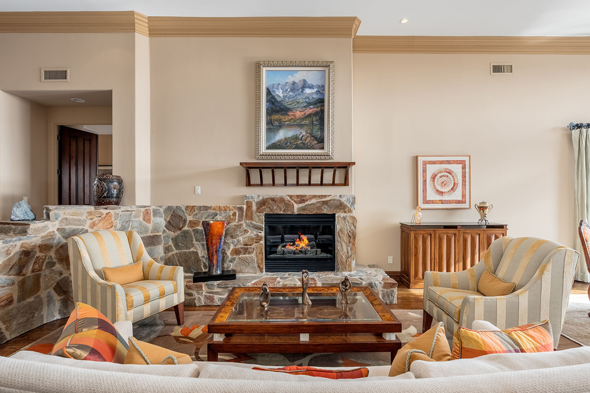 and dining spaces with a warm, open-concept family room anchored by a striking stone