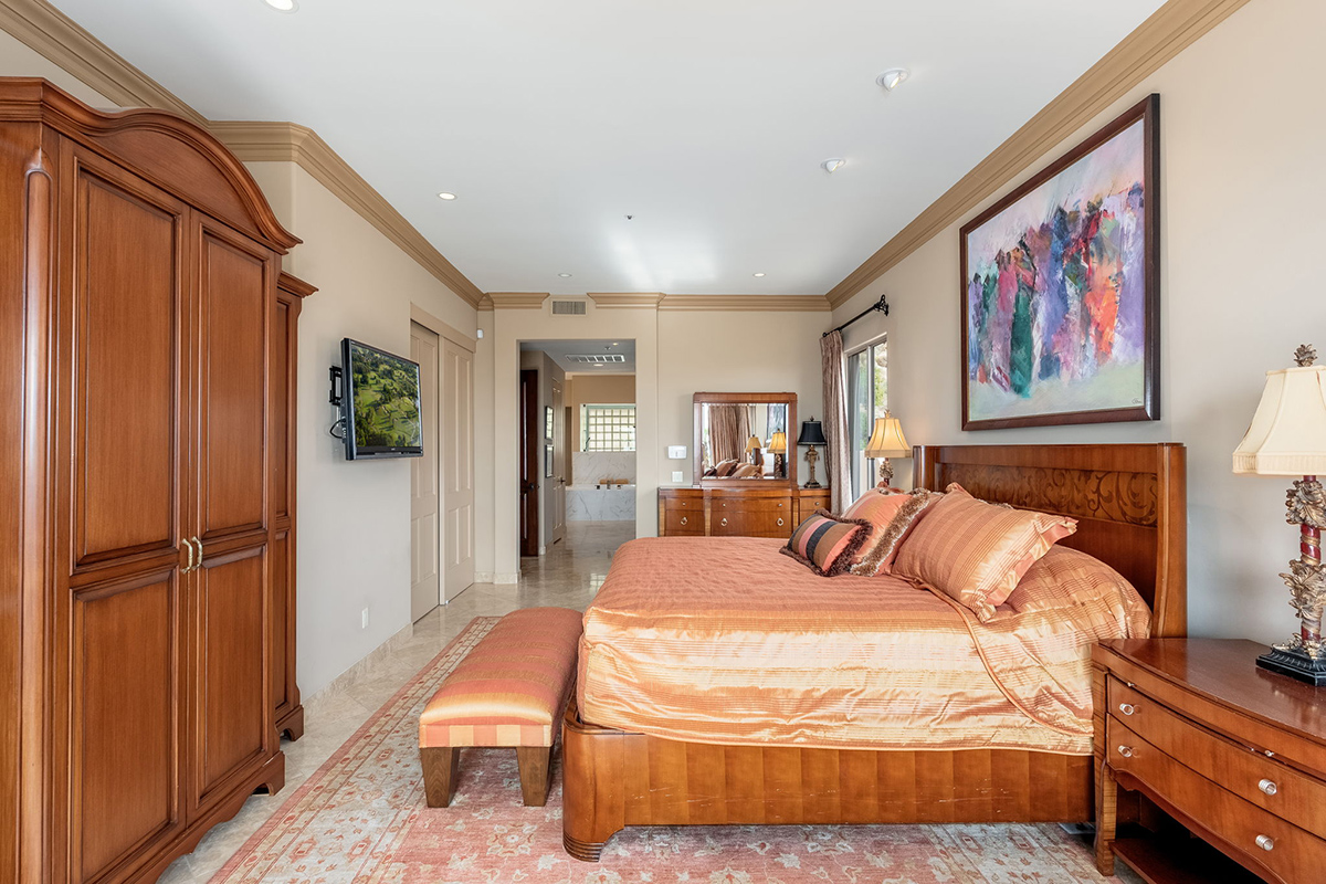 throughout include travertine flooring, crown moldings, and custom details that elevate the