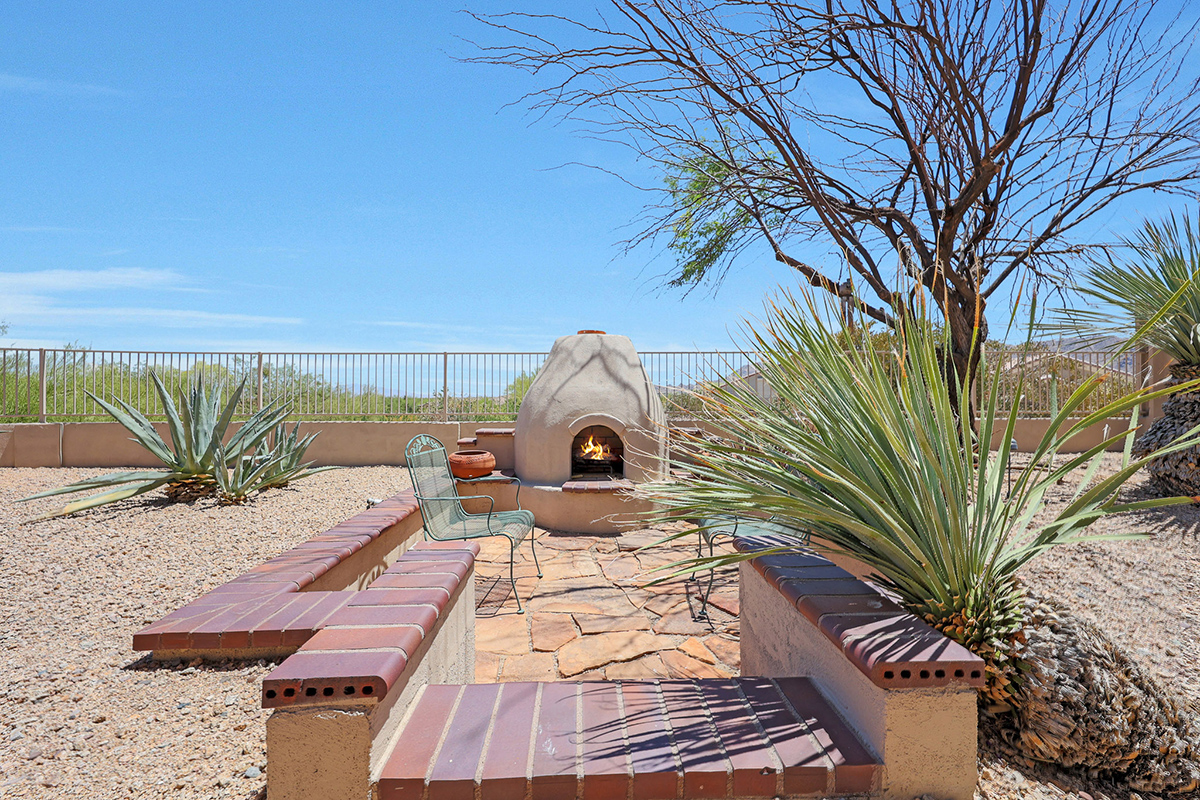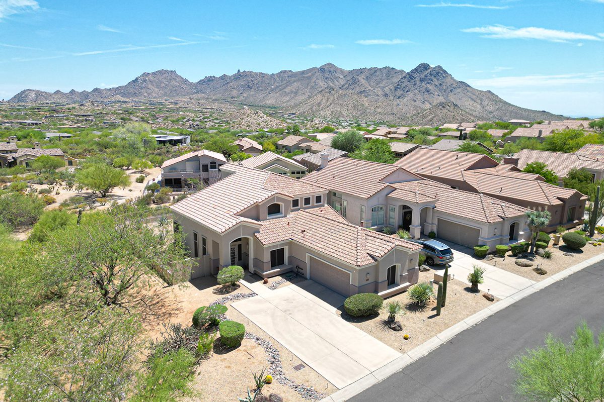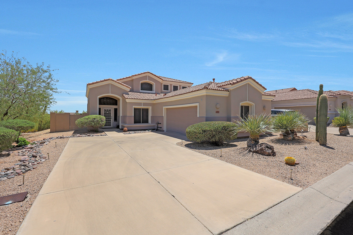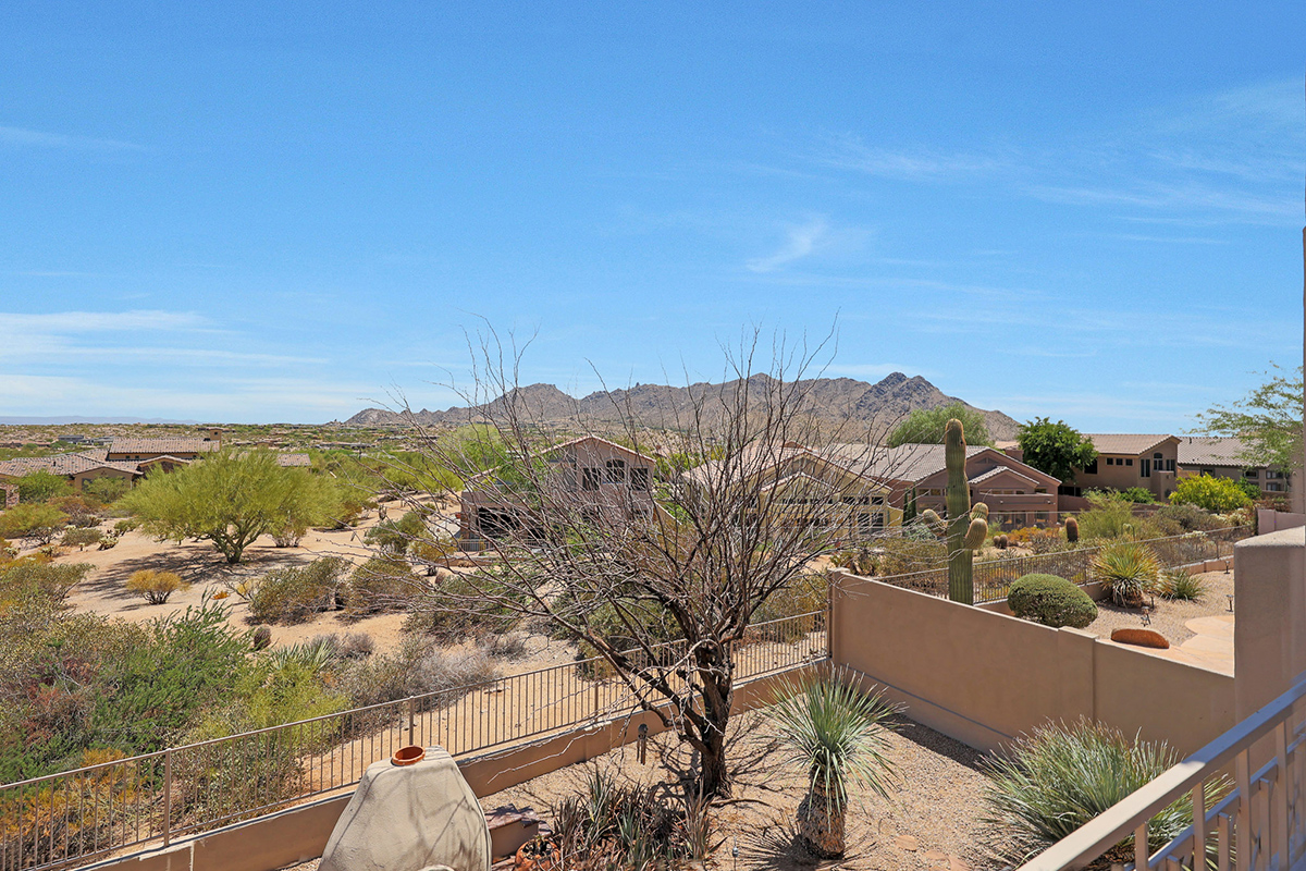 The backyard has near and far mountain views including the McDowell Mountain range and Four Peaks. A large covered patio, kiva fireplace and low maintenance landscaping make for a perfect easy care backyard!