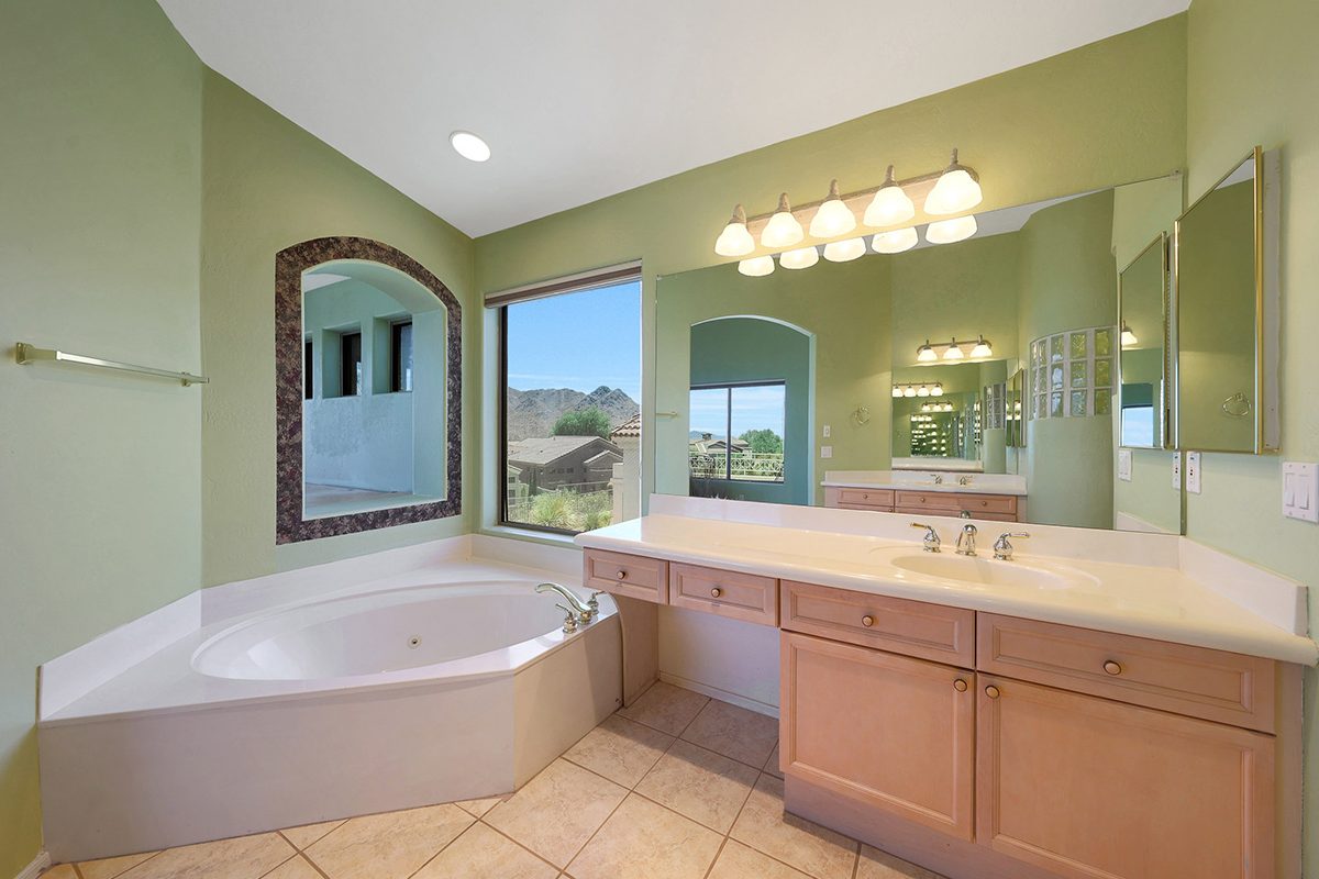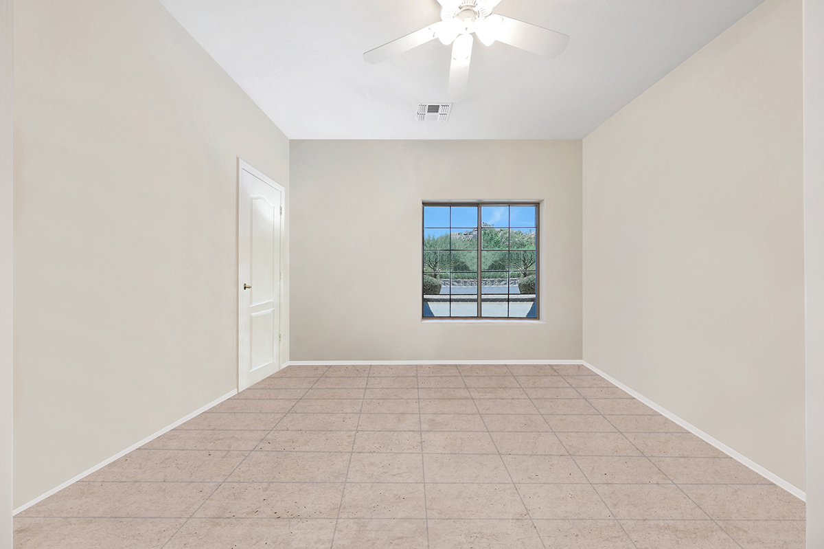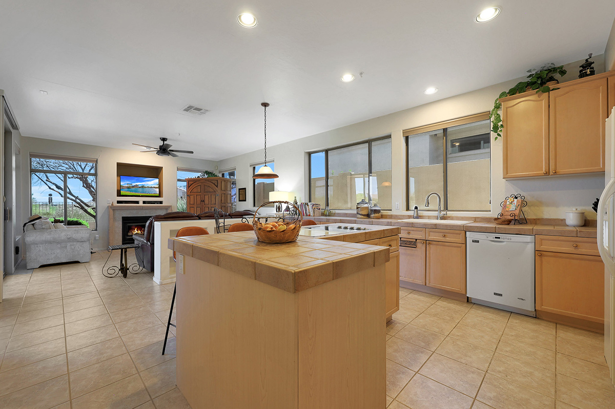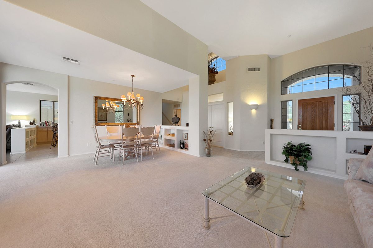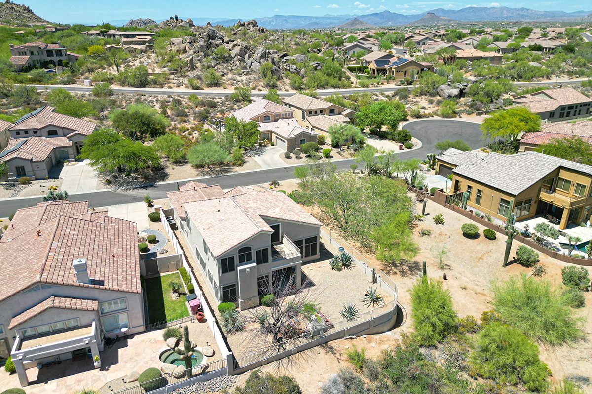 The backyard has near and far mountain views including the McDowell Mountain range and Four Peaks. A large covered patio, kiva fireplace and low maintenance landscaping make for a perfect easy care backyard!