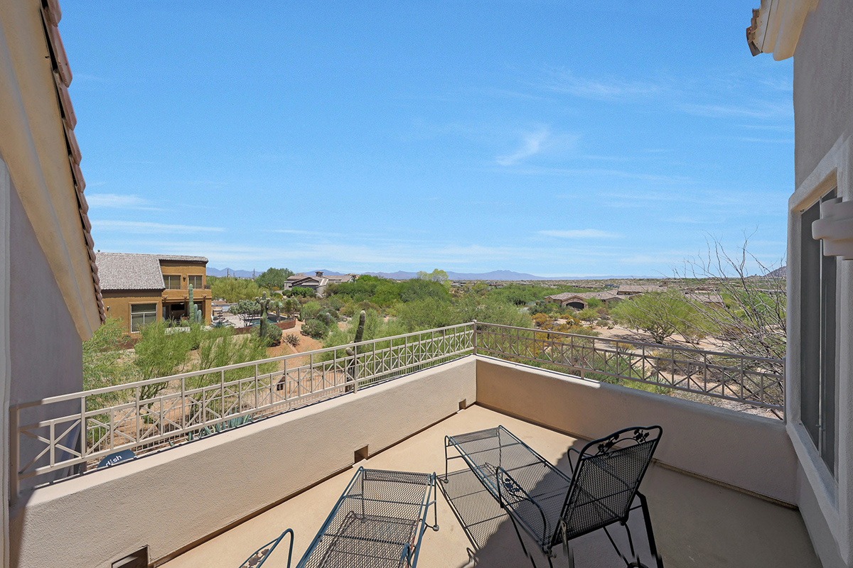 Well-maintained and move-in ready, this home is located on a premium cul-de-sac lot in the sought-after Saddleback at Troon Village community, bordered on two sides by desert open space for exceptional privacy and tranquility. The elegant, open floor plan is filled with natural light and features soaring vaulted ceilings, neutral tile and carpet, and upgraded cabinetry throughout. The spacious upstairs primary suite is a true retreat with its own sitting area, cozy fireplace, private balcony, and stunning views. The downstairs guest bedroom has access to the guest bathroom and the room off the entryway with double doors makes a perfect home office or den. The inviting family room, complete with a second fireplace, flows seamlessly into the kitchen, making it ideal for relaxing.