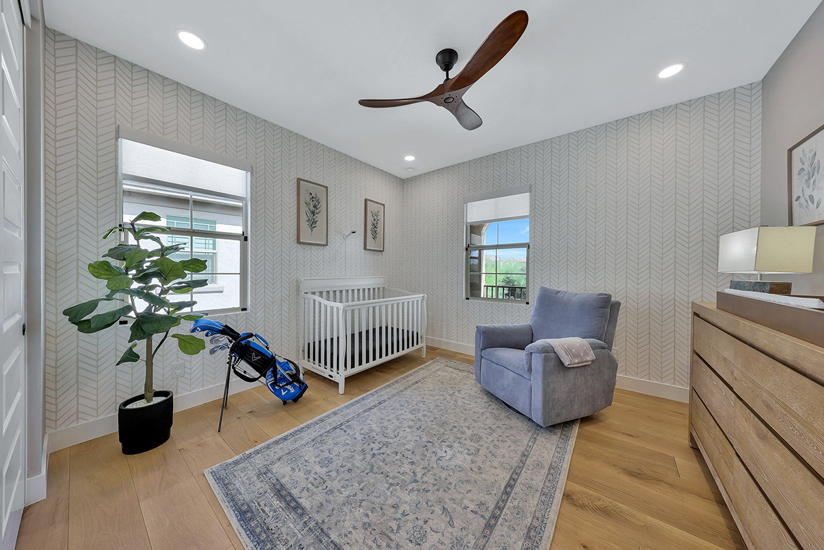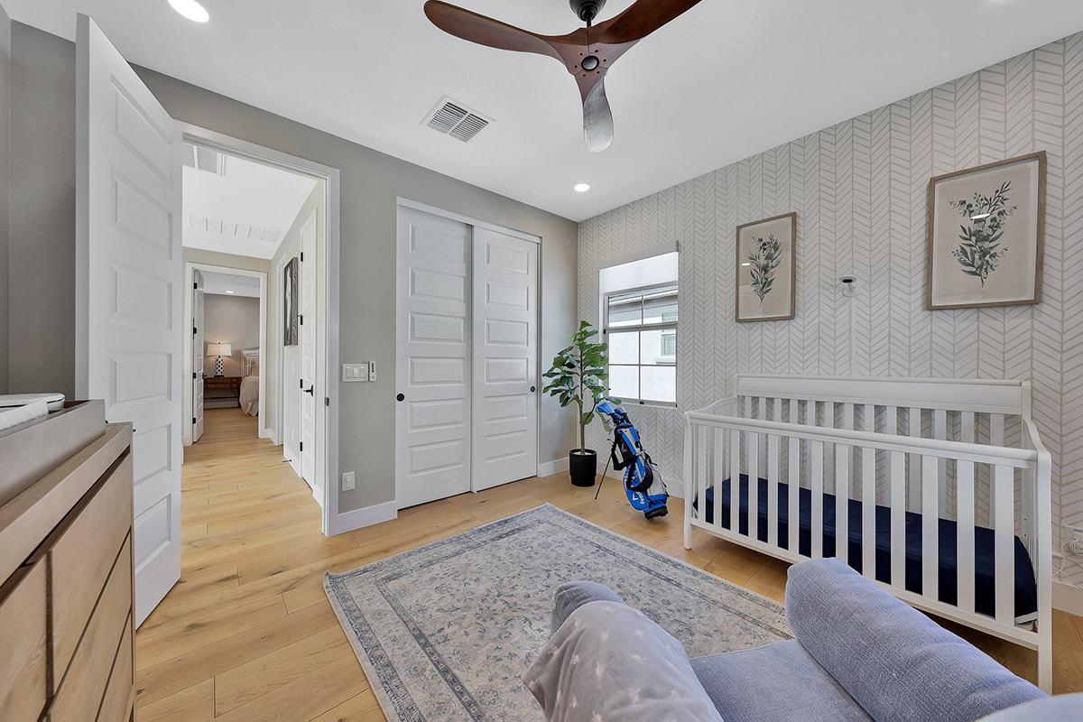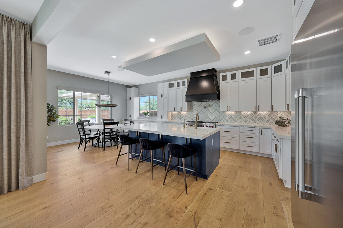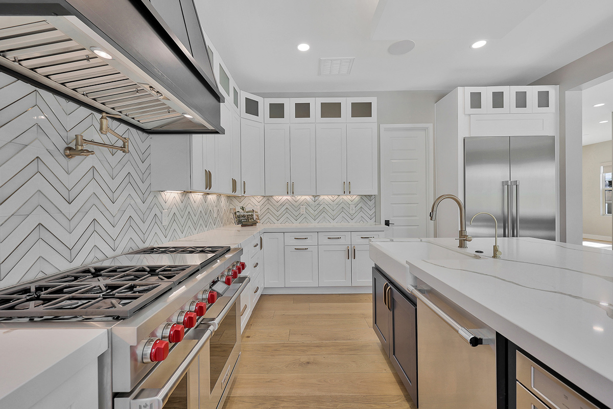 Inside, you’ll find engineered French oak hardwood floors, smooth textured walls, 8-foot solid core doors with sleek black hardware, and a seamless blend of modern elegance and functionality. The gourmet kitchen is a chef’s dream, featuring top-of-the-line Wolf and Thermador appliances, a pot filler, farmhouse sink, custom cabinetry with soft-close drawers, and a walk-in pantry.