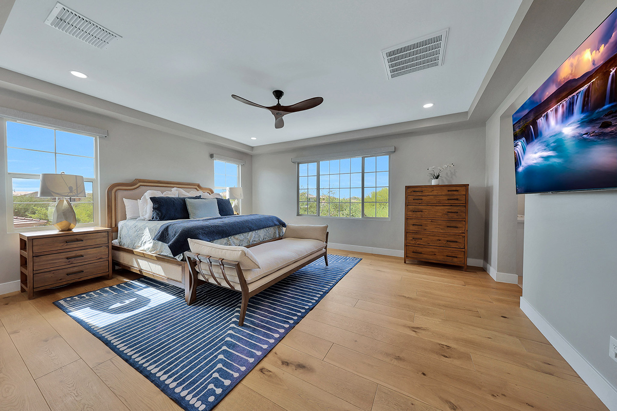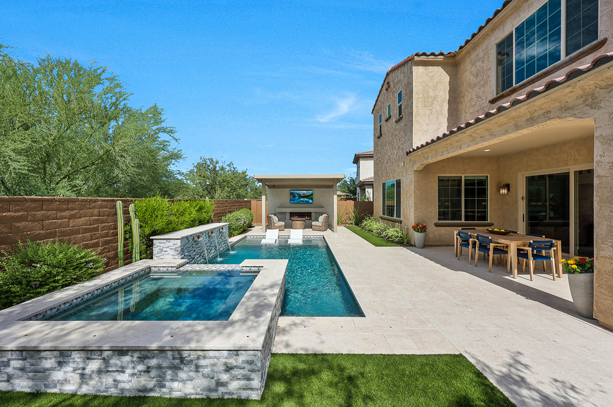 Outdoors, a heated pool and spa, Baja shelf, 14’x14’ Ramada with a built-in BBQ and teppanyaki grill, and lush landscaping with pet-friendly artificial turf create an oasis for relaxation and gatherings. Additional features include a bonus room with balcony access, a two-car garage with epoxy flooring and EV charging ports, and an oversized lot with no neighbors on three sides.