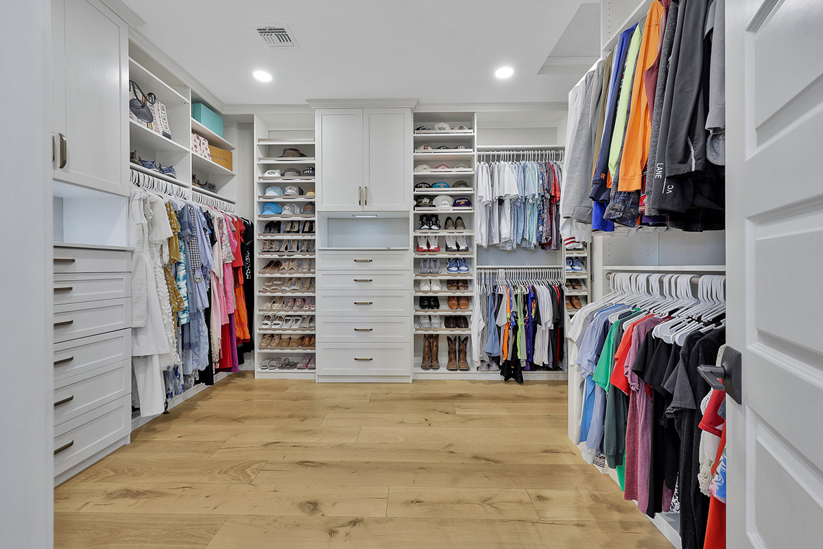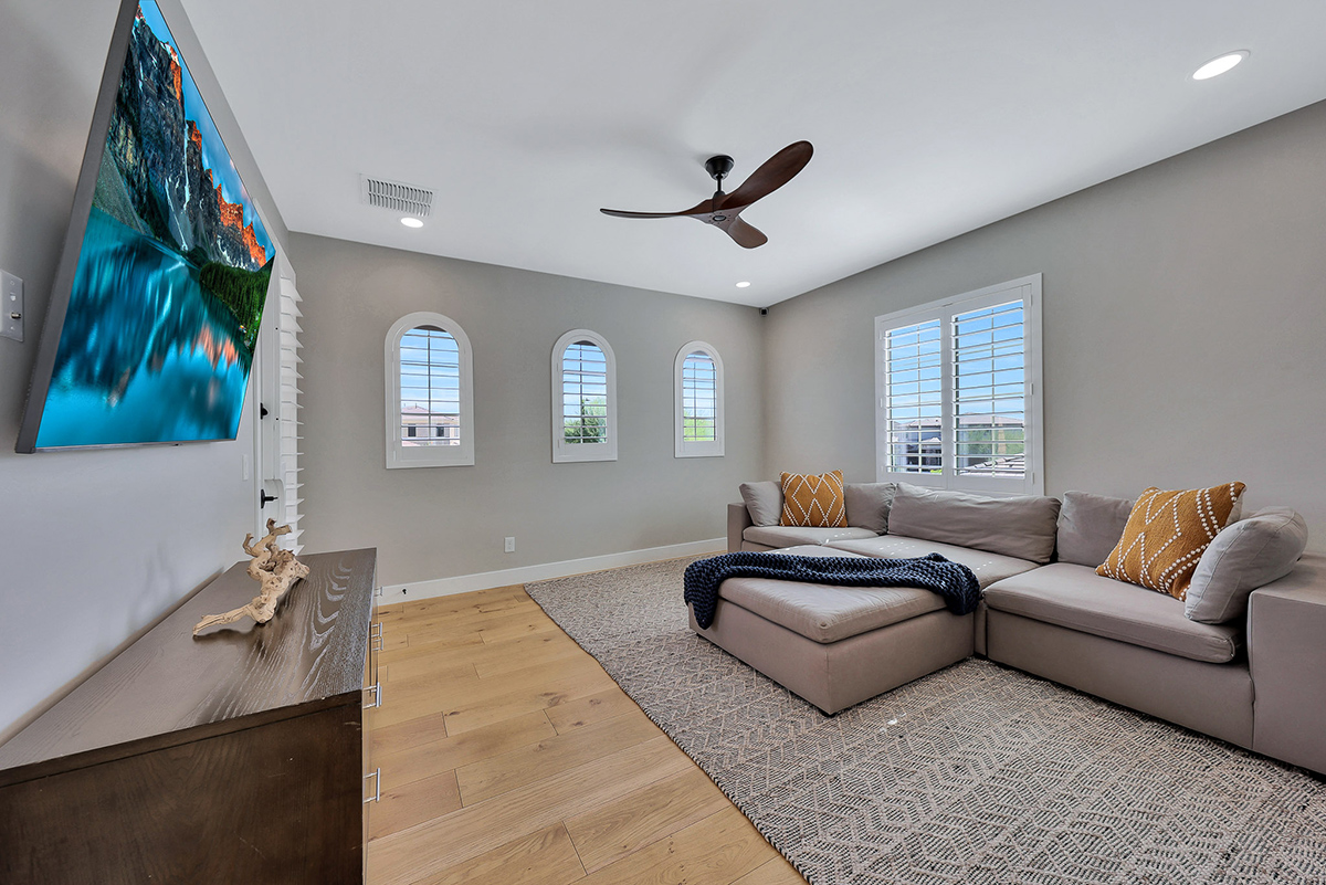 The expansive primary suite is a tranquil retreat with a coffered ceiling and a spa-inspired bathroom complete with a steam shower, freestanding tub, warm champagne-toned fixtures, and a custom walk-in closet designed by Closet Factory. The open floor plan flows effortlessly into the family room with a gas fireplace, multi-sliding glass doors, and access to the entertainer’s backyard.