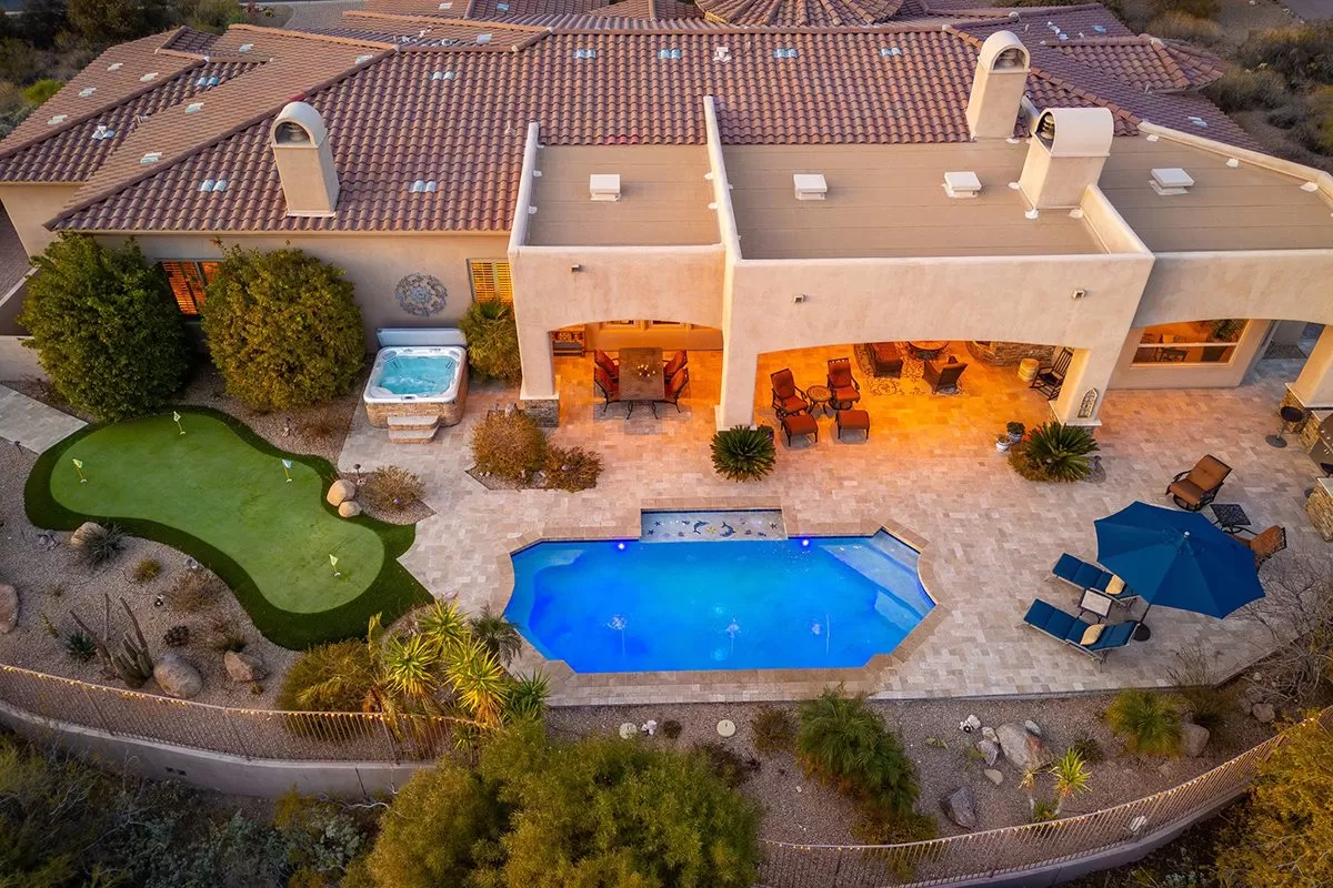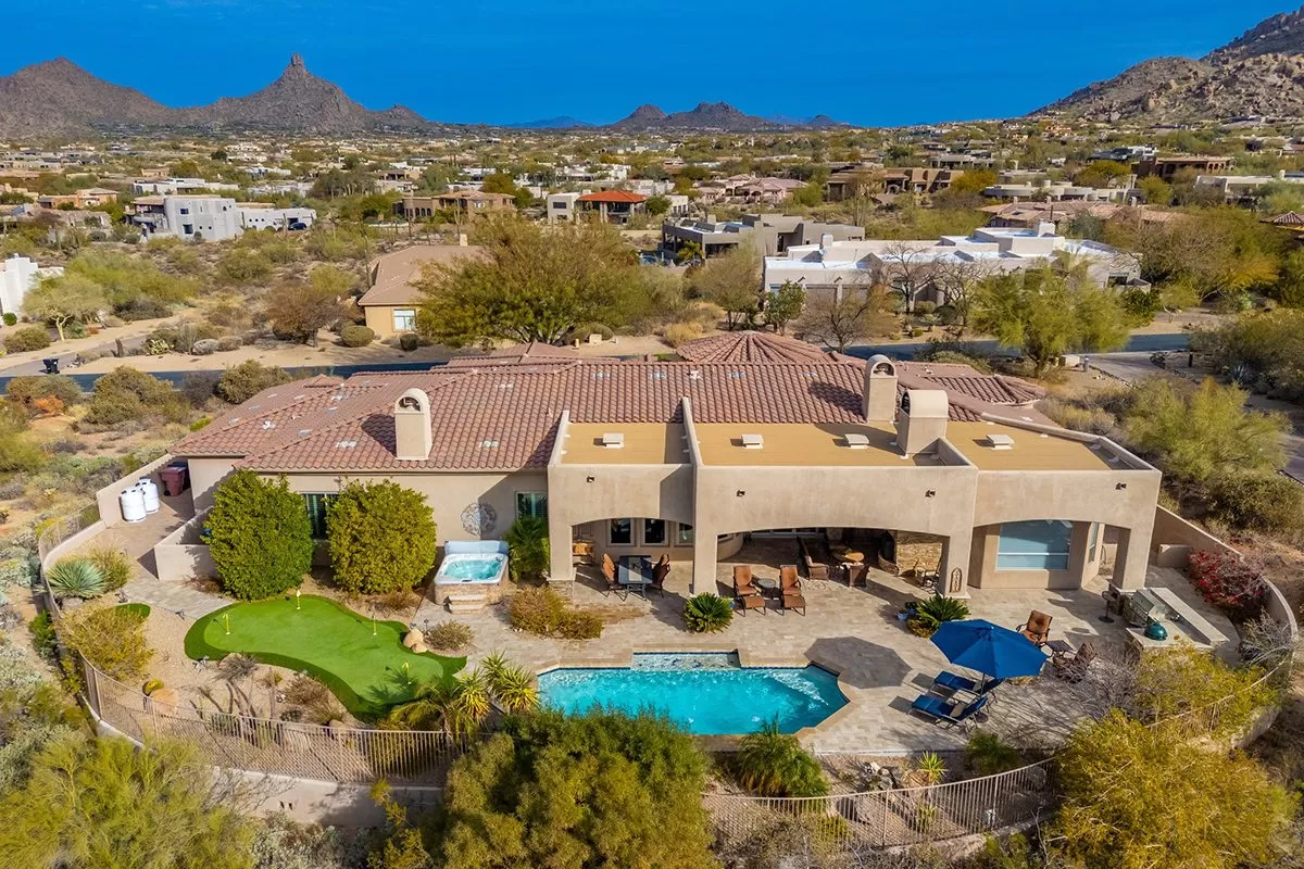 Perched on a premium view lot backing to the McDowell Mountain Preserve, this exceptional home in gated Sonoran Highlands offers a rare combination of privacy and breathtaking scenery. Designed for both entertaining and everyday luxury, the backyard is a true retreat with a stacked stone fireplace, built-in BBQ with grill and Green Egg, travertine hardscape, a large covered patio, pool with water feature, fire pit, four-hole putting green, and an above-ground spa.