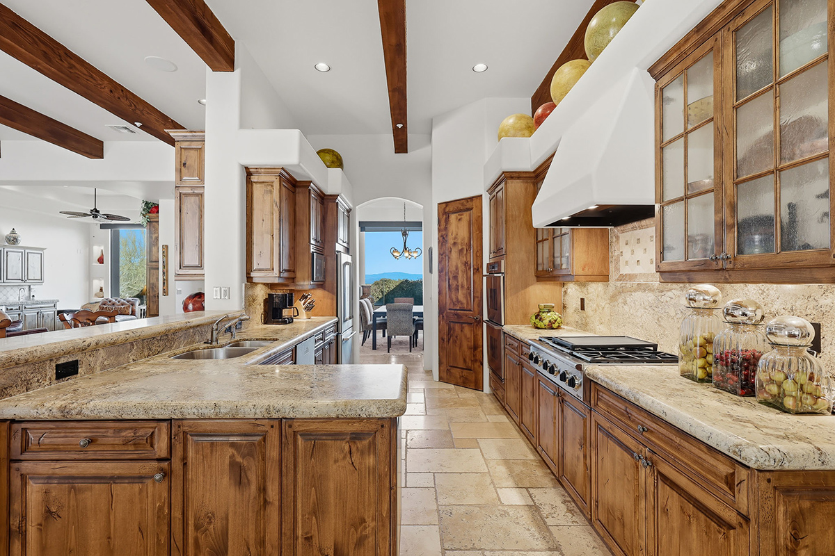 Nestled within the guard-gated custom home enclave of Troon Mountain Estates, this beautifully designed single-level residence offers refined desert living with sweeping views of Four Peaks to the east and Troon Mountain rising behind the backyard. Thoughtfully crafted for both everyday comfort and entertaining, the open-concept floor plan showcases travertine flooring, wood-beam ceilings in the great room, and a striking cantera stone gas fireplace.