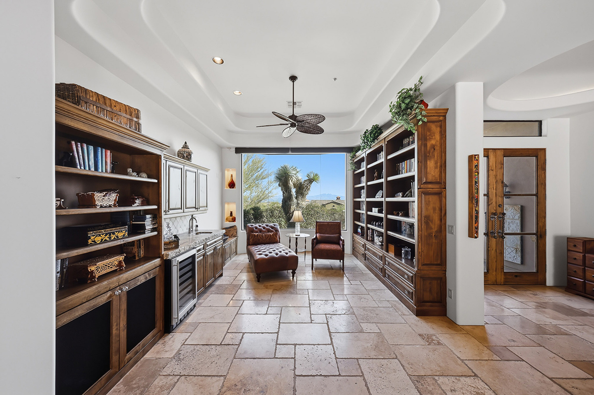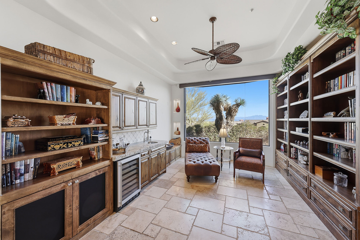 Expansive sliding glass doors open fully to create seamless indoor-outdoor living, leading to a resort-style backyard complete with pool and spa—perfect for enjoying Arizona’s year-round lifestyle. The chef’s kitchen features a gas cooktop, double ovens, walk-in pantry, RO system, bar seating, and an adjacent breakfast nook, while abundant built-in cabinetry throughout the home provides exceptional storage. Off the great room, a charming reading room and wet bar with butted glass windows frame distant mountain views, creating a serene space to unwind or entertain.