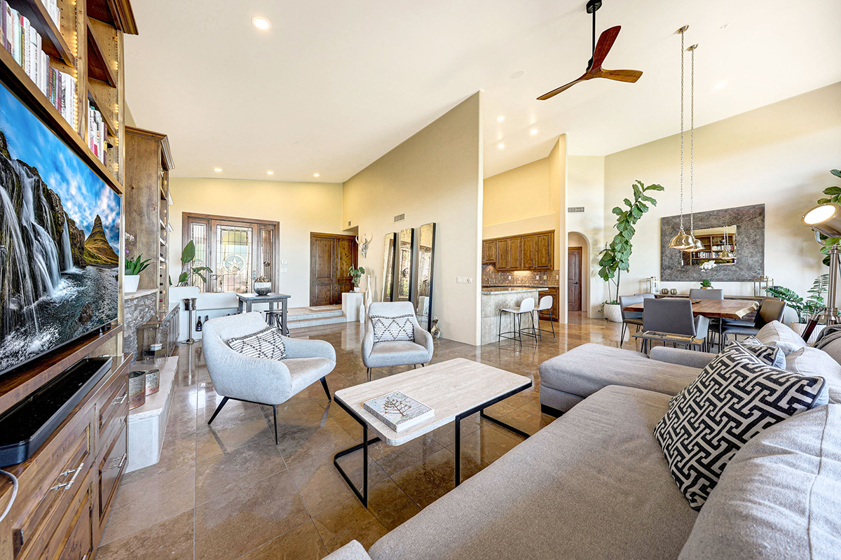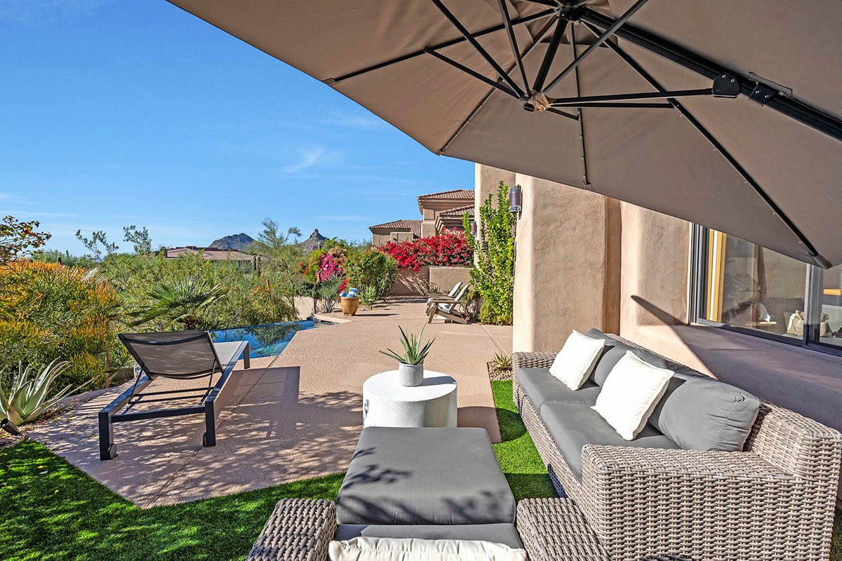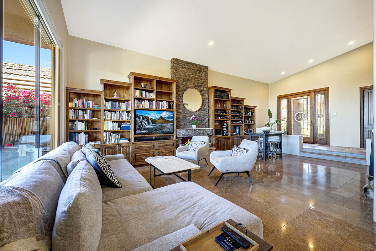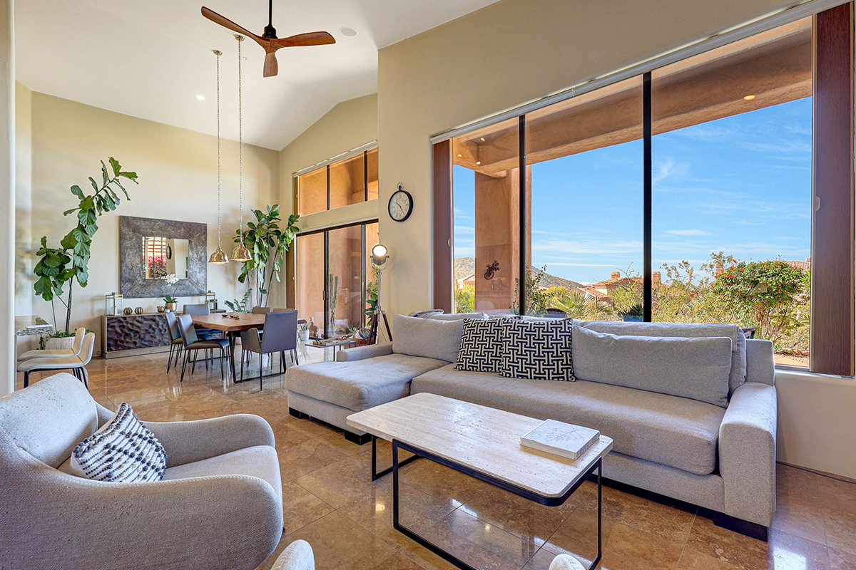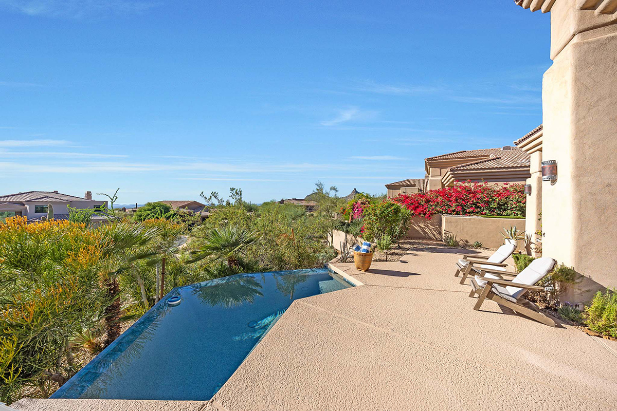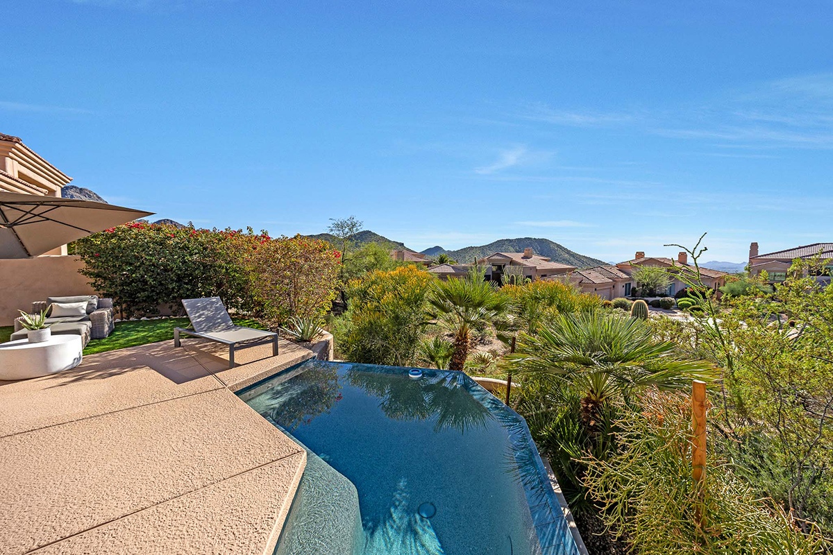 Fantastic find in gated Whispering Ridge at Troon Village! Meticulously maintained, beautifully updated, and move-in ready! The open and airy floor plan showcases large view windows that frame the stunning desert surroundings and low-maintenance backyard with an infinity-edge play pool, all set against a backdrop of city lights, sunsets and Pinnacle Peak mountain views. The great room’s stacked-stone gas fireplace, flanked by custom built-ins, creates a warm focal point while seamlessly connecting to the dining area and kitchen for easy entertaining.