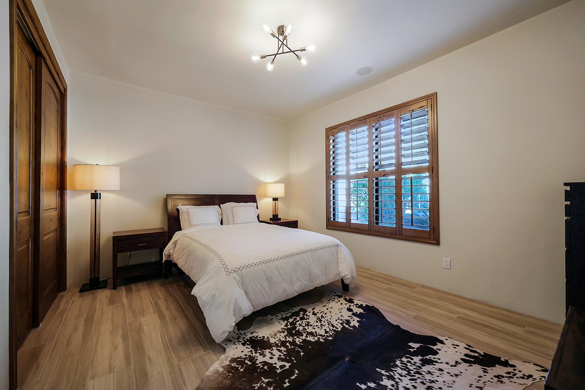 The inviting primary suite includes a large view window and a spa-like bath with a jetted soaking tub, walk-in shower with frameless glass, dual vanities with seating area, walk-in closet, and updated lighting and fixtures. Two guest rooms offer flexibility for visitors or a home office, each with updated Italian porcelain plank flooring (2019).