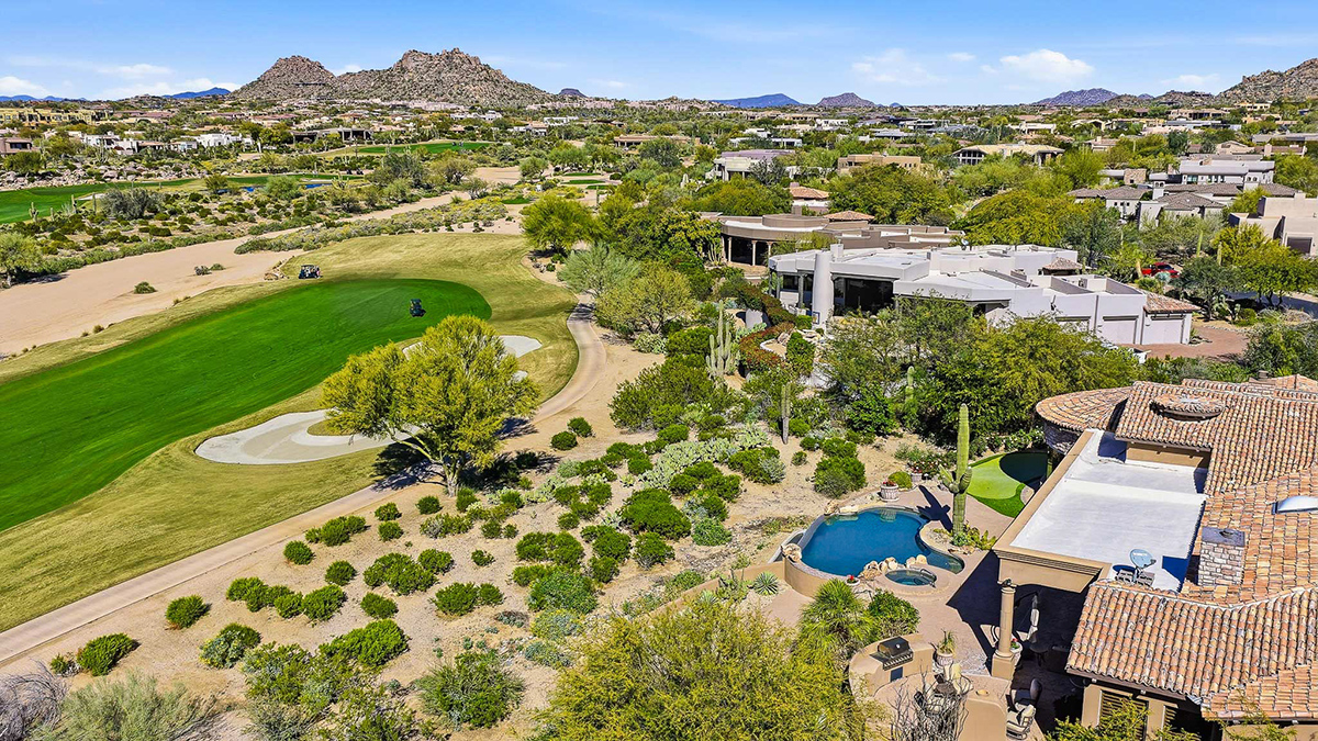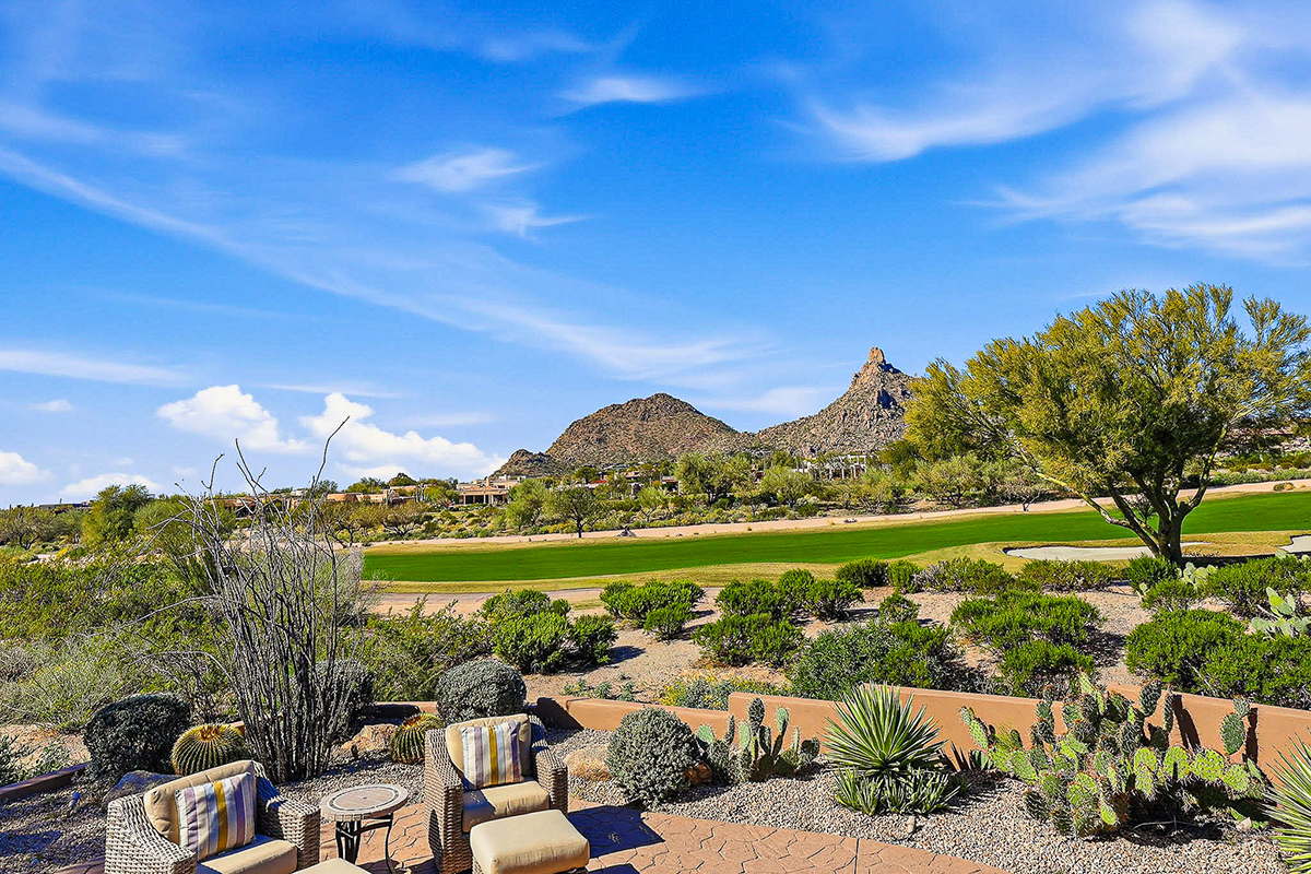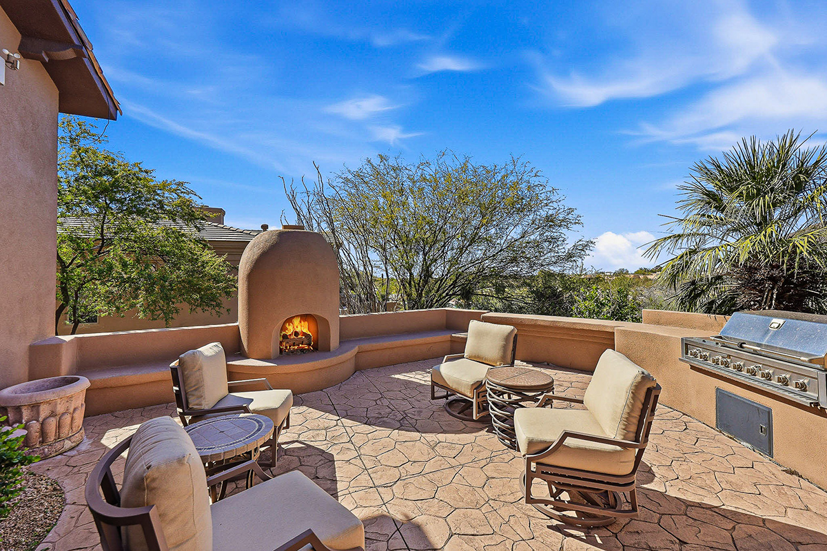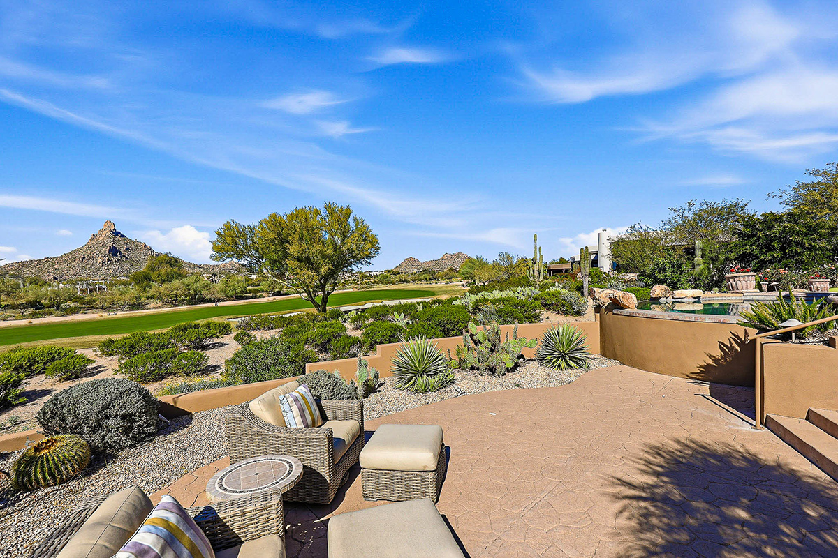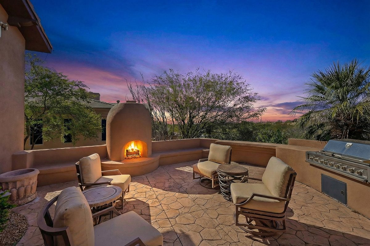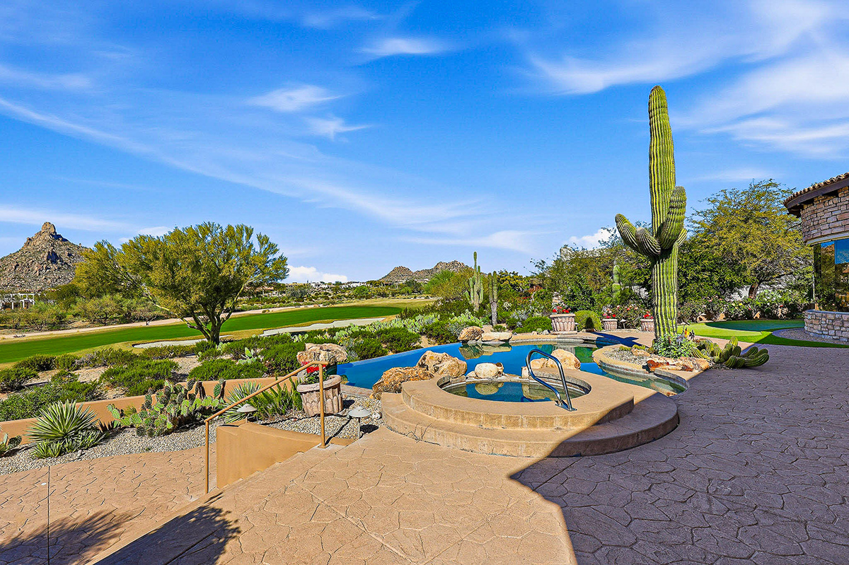 Outdoor living is equally impressive, featuring a heated pool and spa, expansive covered patio, built-in BBQ, outdoor fireplace, and multiple seating areas—each perfectly positioned to take in breathtaking fairway and Pinnacle Peak vistas.