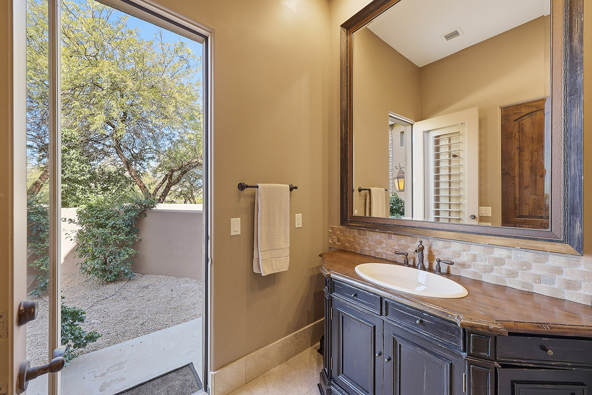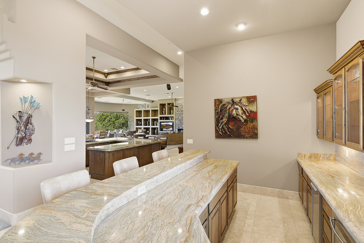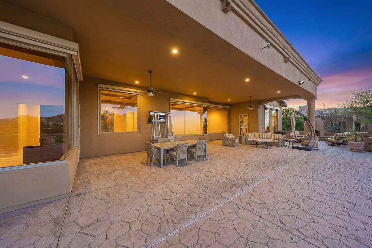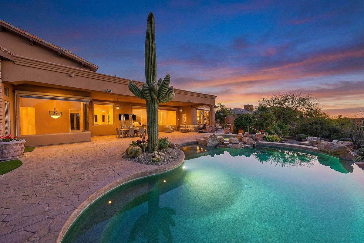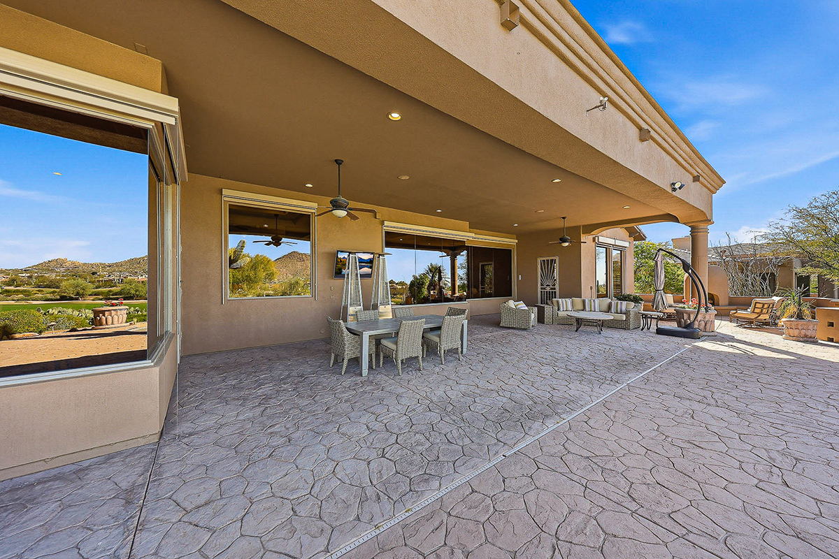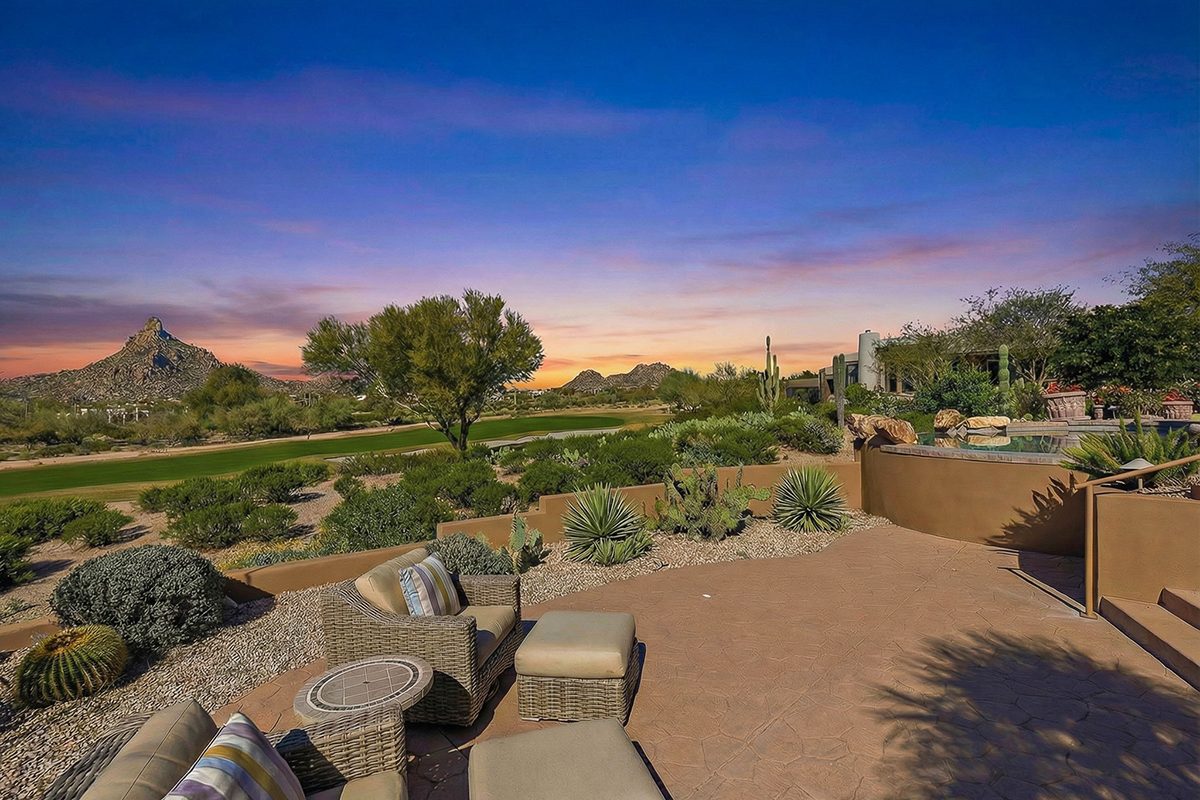 Outdoor living is equally impressive, featuring a heated pool and spa, expansive covered patio, built-in BBQ, outdoor fireplace, and multiple seating areas—each perfectly positioned to take in breathtaking fairway and Pinnacle Peak vistas.