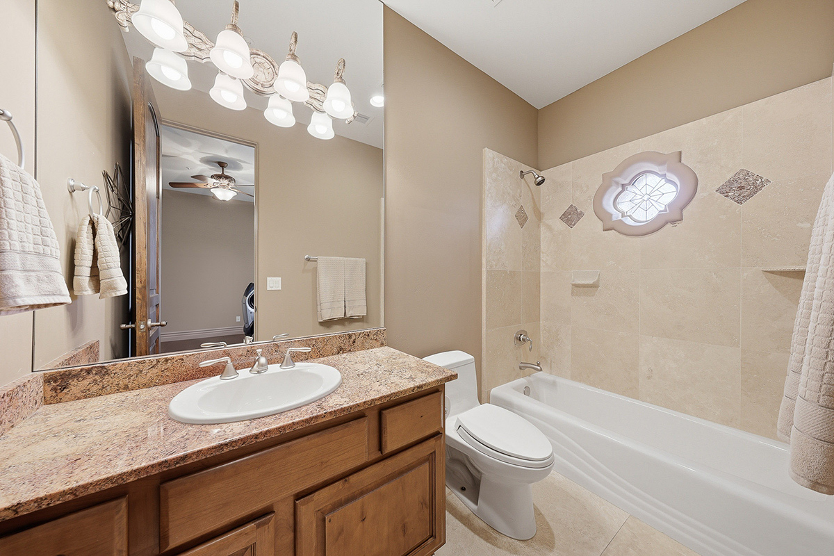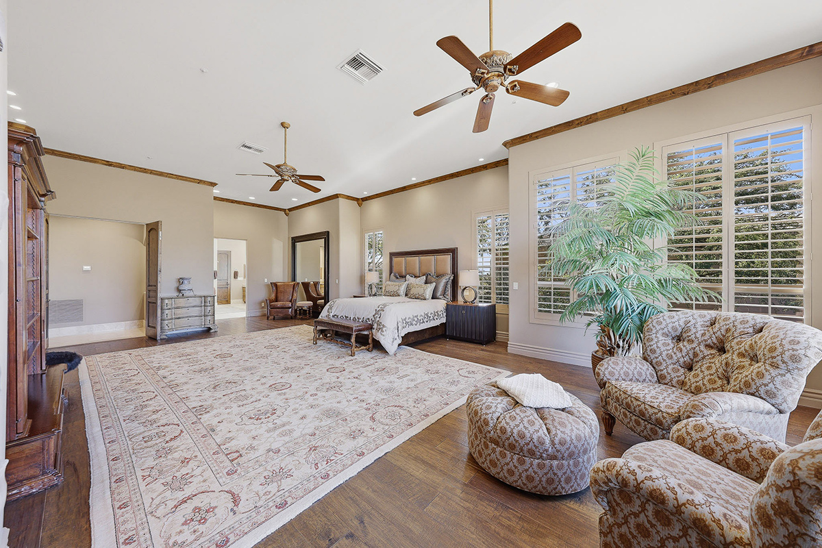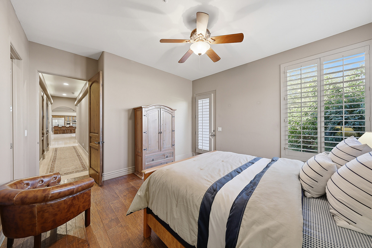 Formal living and dining spaces connect to a wet bar with wine refrigerator and ice maker, creating an ideal layout for hosting. All guest bedrooms are generously sized en suite, each featuring walk-in showers and walk-in closets.