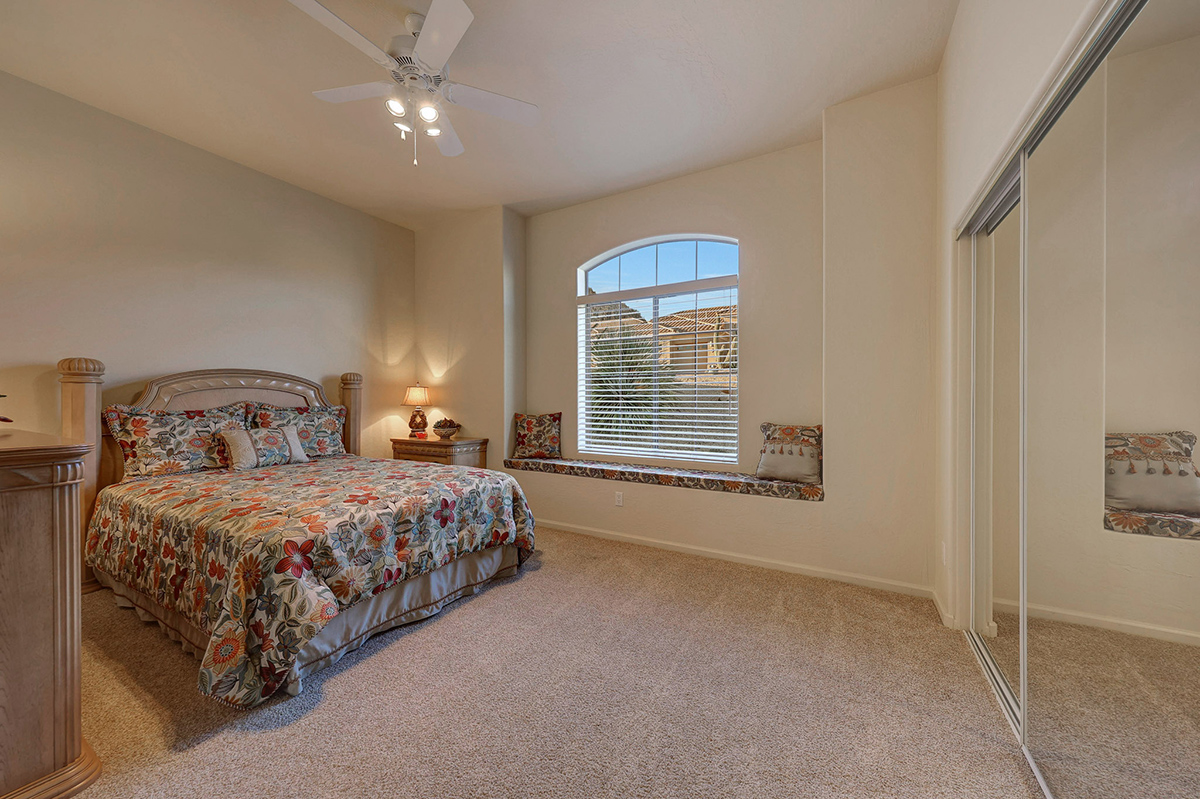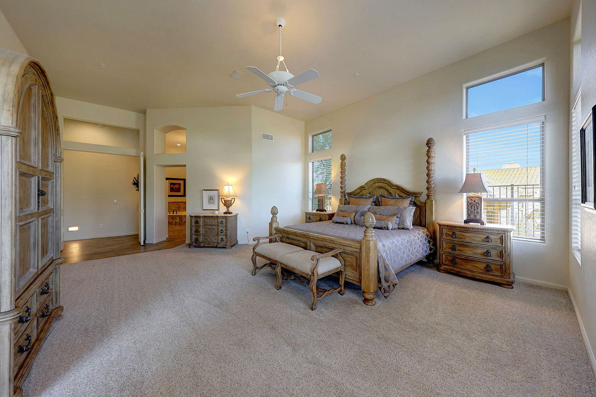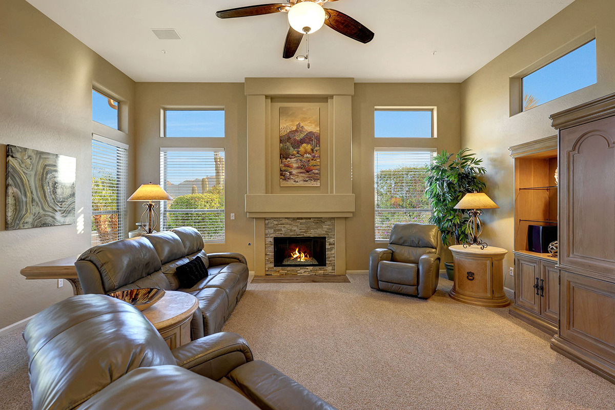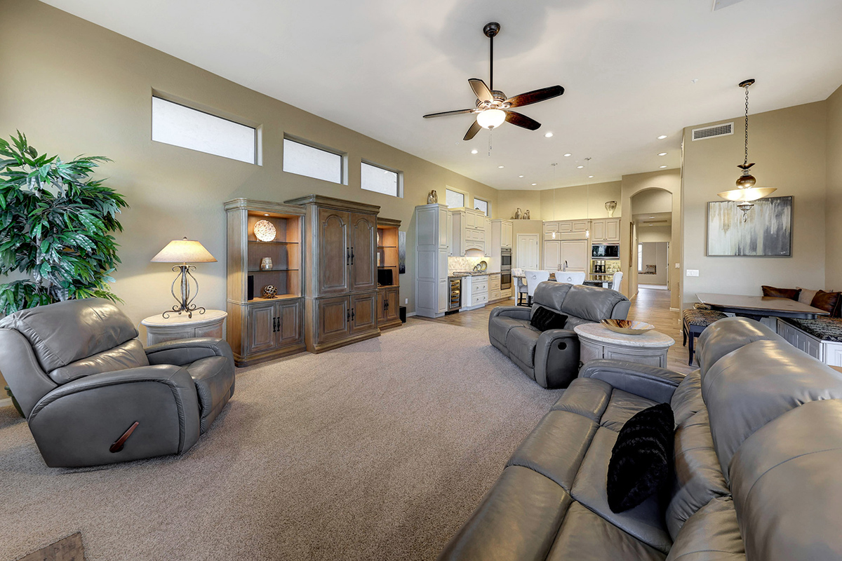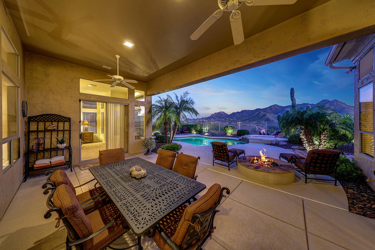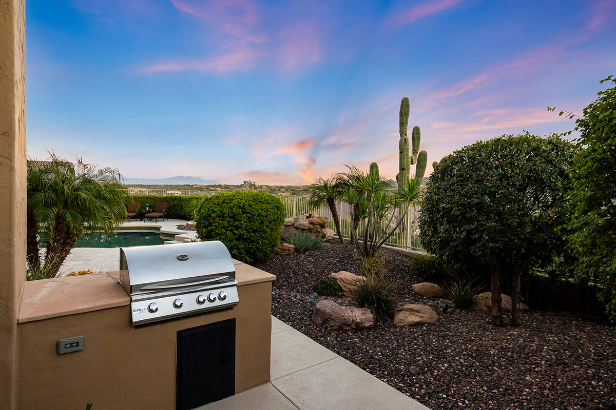 The backyard is an entertainer’s dream with a pool and spa, a large covered porch, a built-in BBQ, a fire pit, and plenty of space to enjoy the panoramic vistas. This home can be completely furnished and accessorized by Separate Bill of Sale.