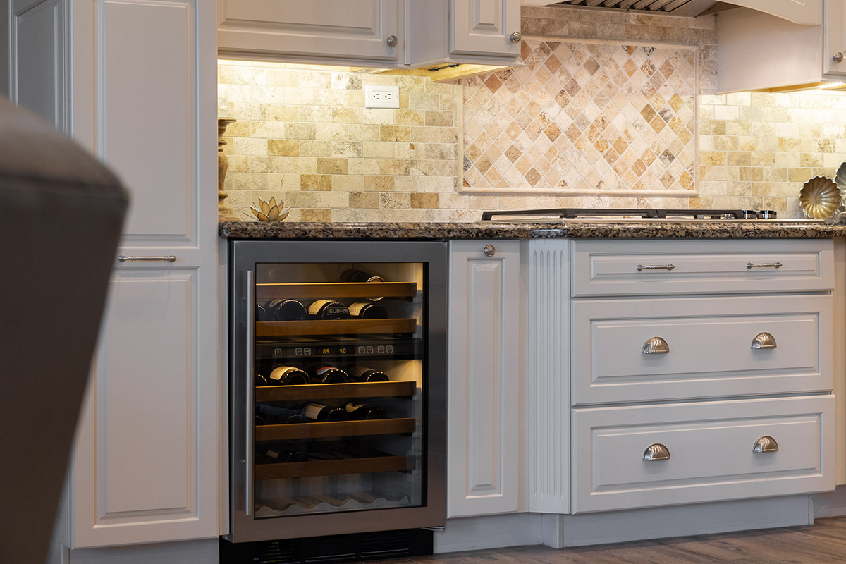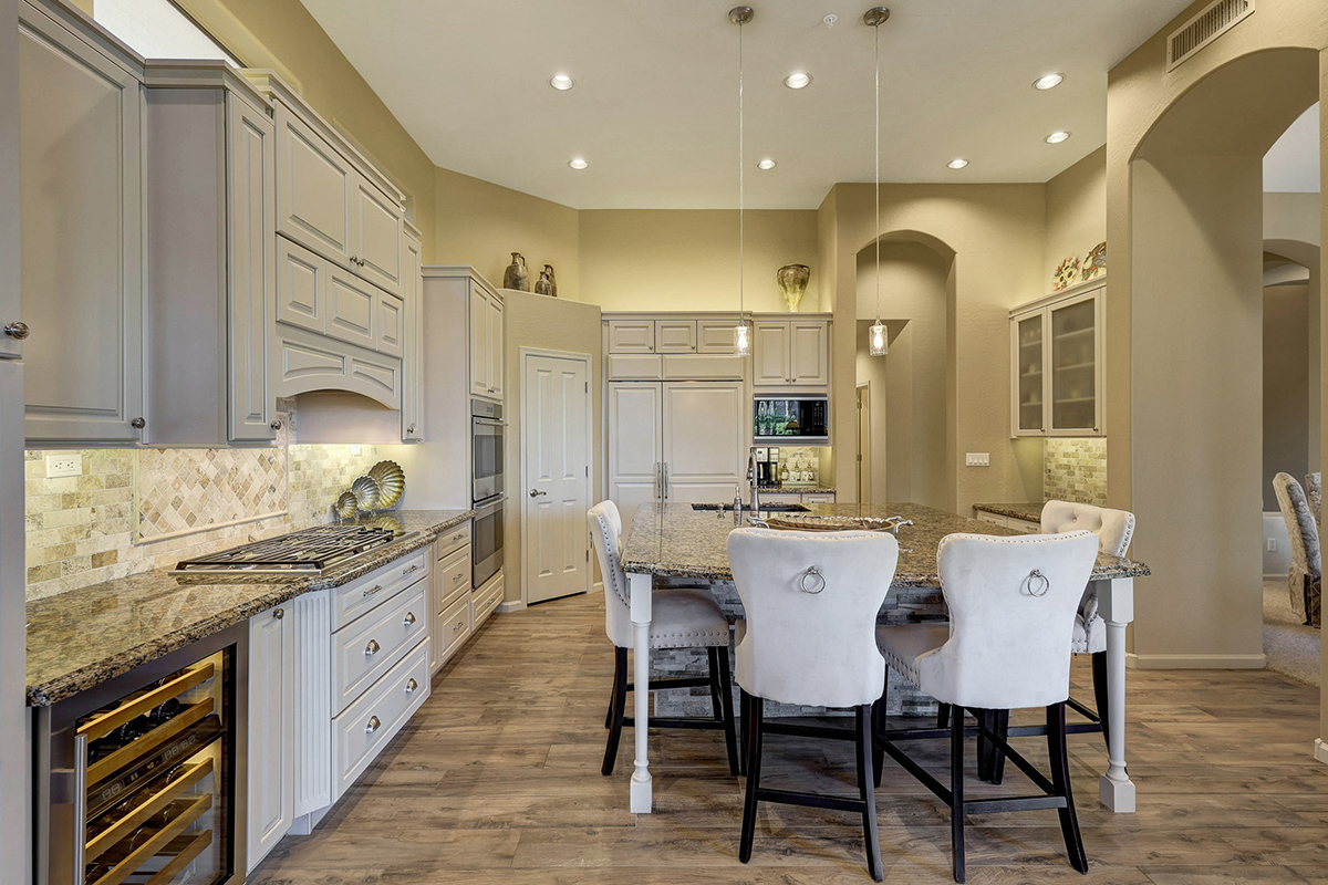Inside, a 2017 remodel includes the kitchen featuring white cabinetry with pull-out spice racks and pop-up mixer lift stand, granite counters, top-of-the-line Wolf stainless steel appliances, including wall ovens and a gas cooktop, a paneled Sub-Zero refrigerator, a corner pantry, countertop seating, and a beverage/wine fridge. A cozy breakfast nook with built-in seating overlooks the yard. The kitchen opens to the family room with a fireplace and abundant natural light from the view windows.
