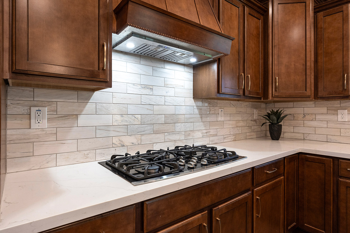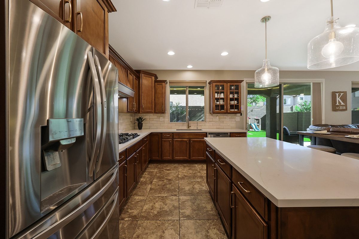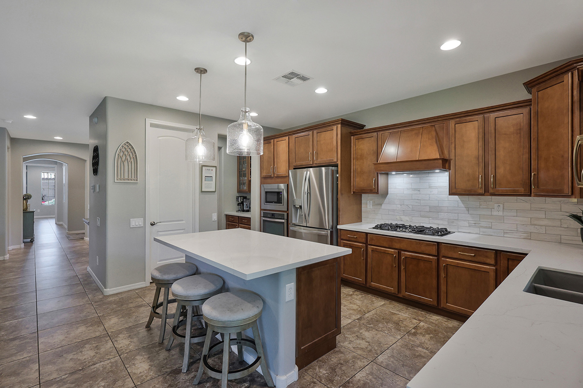 The kitchen, refreshed in May 2023, is the heart of the home with a large center island, quartz countertops, stainless steel appliances including a wall oven and gas cooktop, tiled backsplash, workstation, and a walk-in pantry. The open-concept design connects the kitchen to the living space, creating a perfect gathering place.