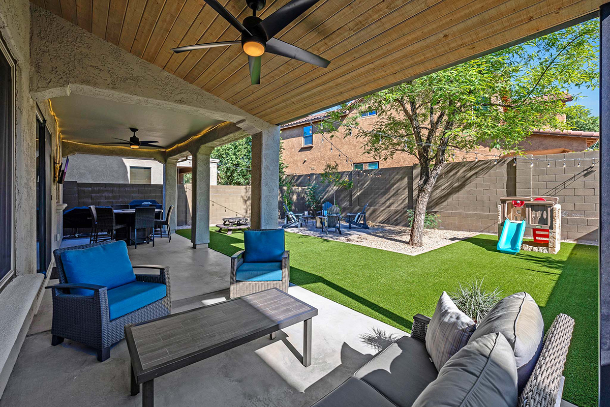 Outdoor living is just as inviting with a low-maintenance backyard showcasing a large covered patio, extended paver seating area (Oct 2023), and brand-new turf (Feb 2025), creating a private backyard retreat perfect for relaxing or entertaining. Thoughtful improvements include a new powder bath vanity (Jan 2021), attic AC coils (July 2023), a new hot water heater, replaced water softener, and updated exterior paint (April 2025).