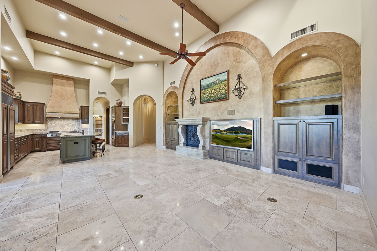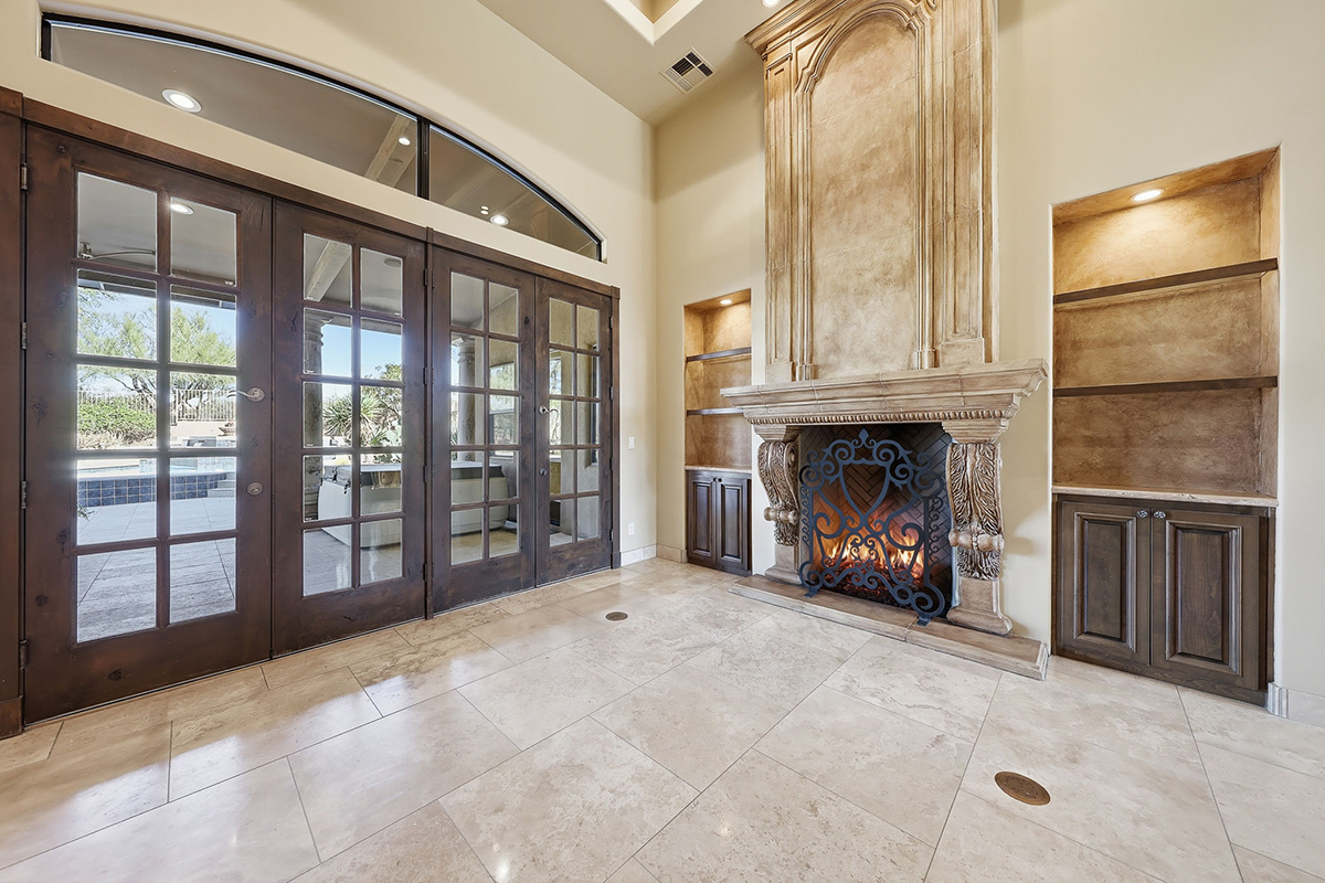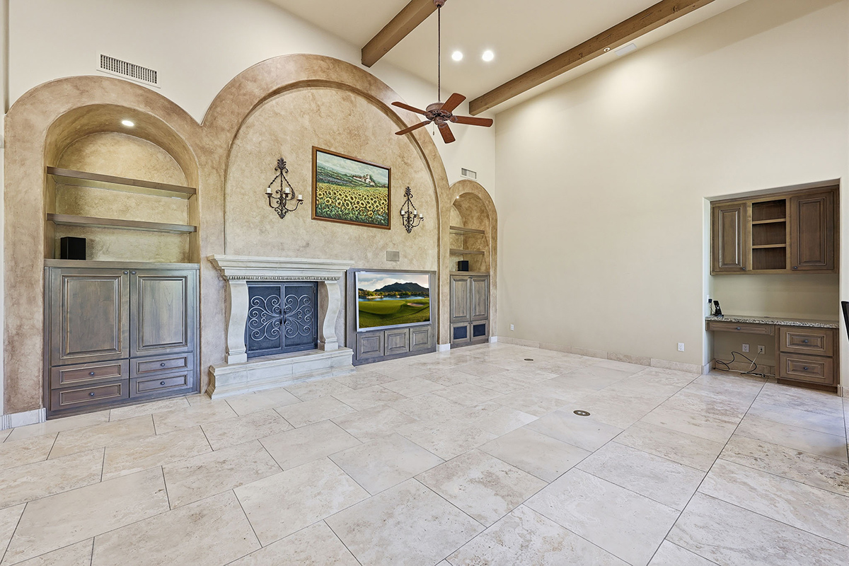 The resort-style backyard is an entertainer’s dream, featuring stone columns, a sparkling pool with elevated spa, an above-ground hot tub, mature landscaping, and a covered patio complete with heaters and a fireplace. A built-in BBQ with bar seating creates the perfect setting to enjoy Arizona’s breathtaking sunrises and sunsets.