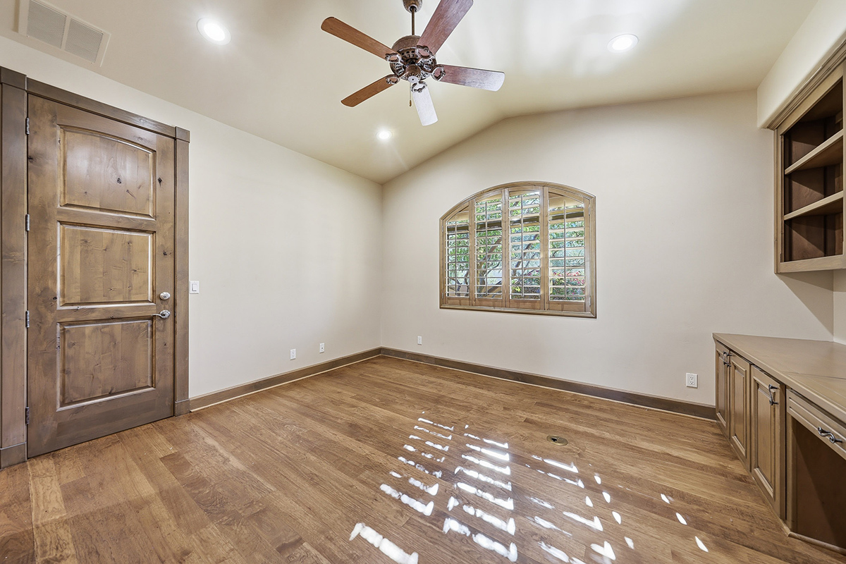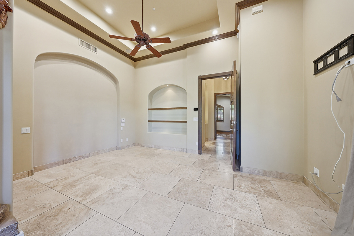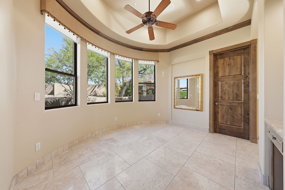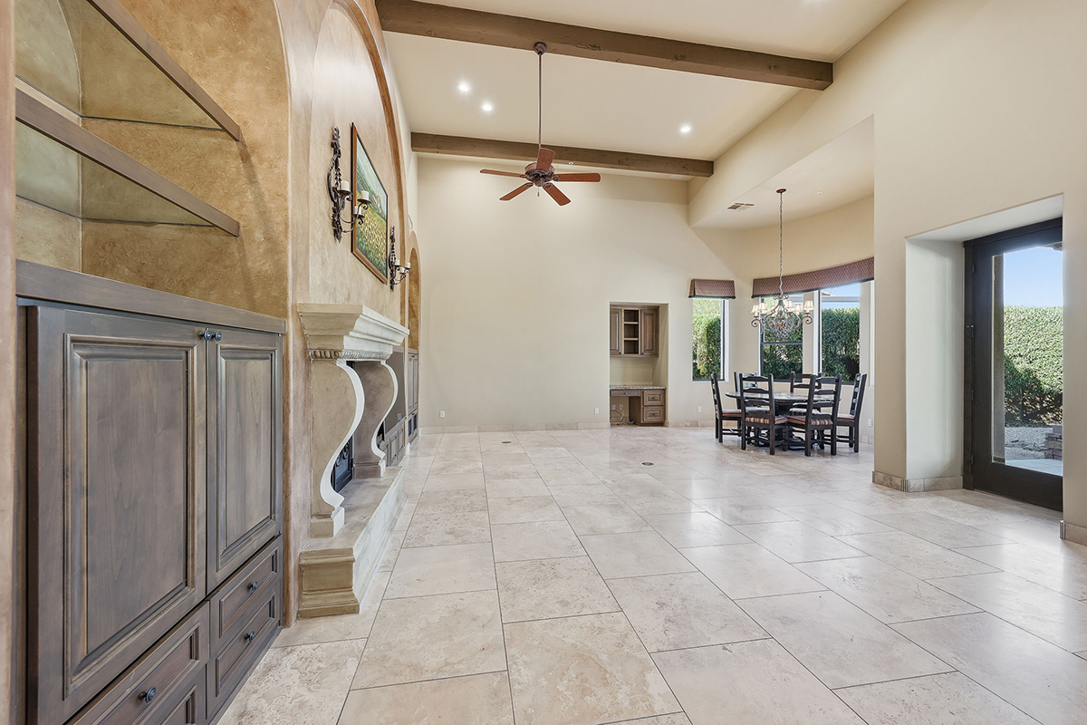 The resort-style backyard is an entertainer’s dream, featuring stone columns, a sparkling pool with elevated spa, an above-ground hot tub, mature landscaping, and a covered patio complete with heaters and a fireplace. A built-in BBQ with bar seating creates the perfect setting to enjoy Arizona’s breathtaking sunrises and sunsets.