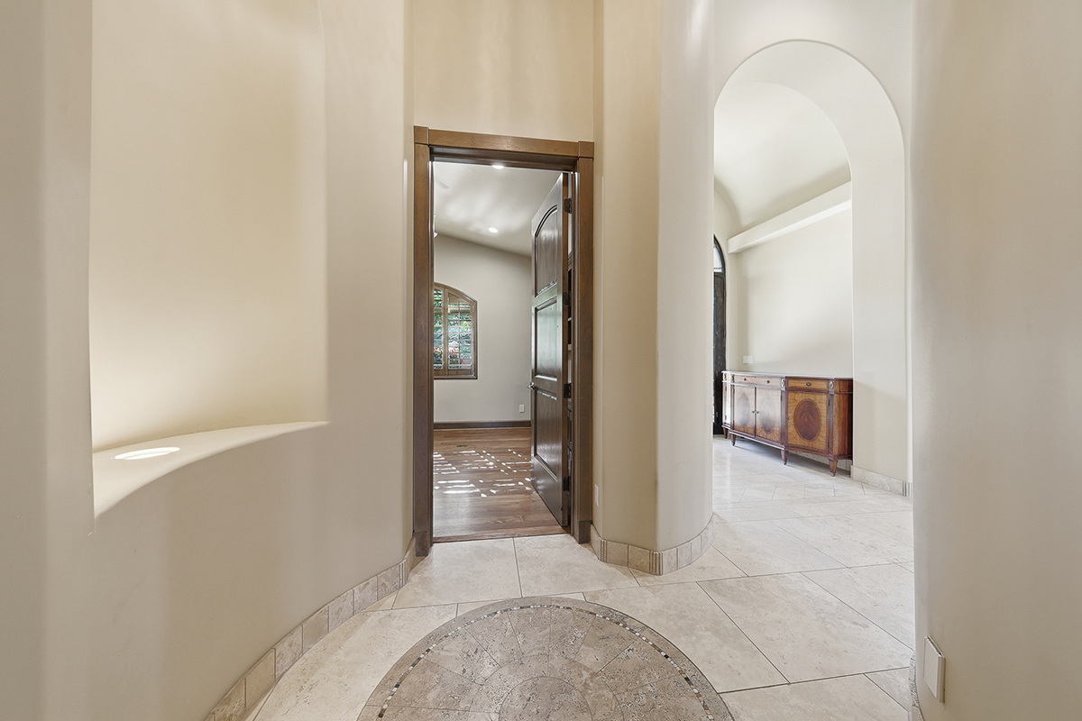 The primary suite provides a private retreat with a spacious walk-in closet and a spa-inspired bath with sitting area, soaking tub, split vanities, and elegant finishes. Additional highlights include formal living and dining spaces, custom paint, wood shutters, wood doors and molding, a wet bar with wine refrigerator, stone accent columns, neutral tile flooring, art niches, gas fireplaces, stainless steel appliances including a six-burner gas range, a custom metal and glass front door, and a three-car garage with extended paver driveway.