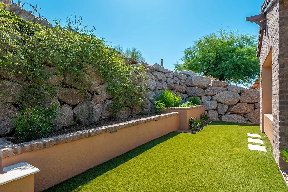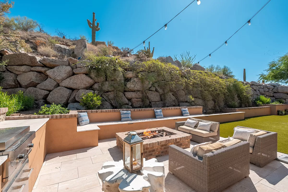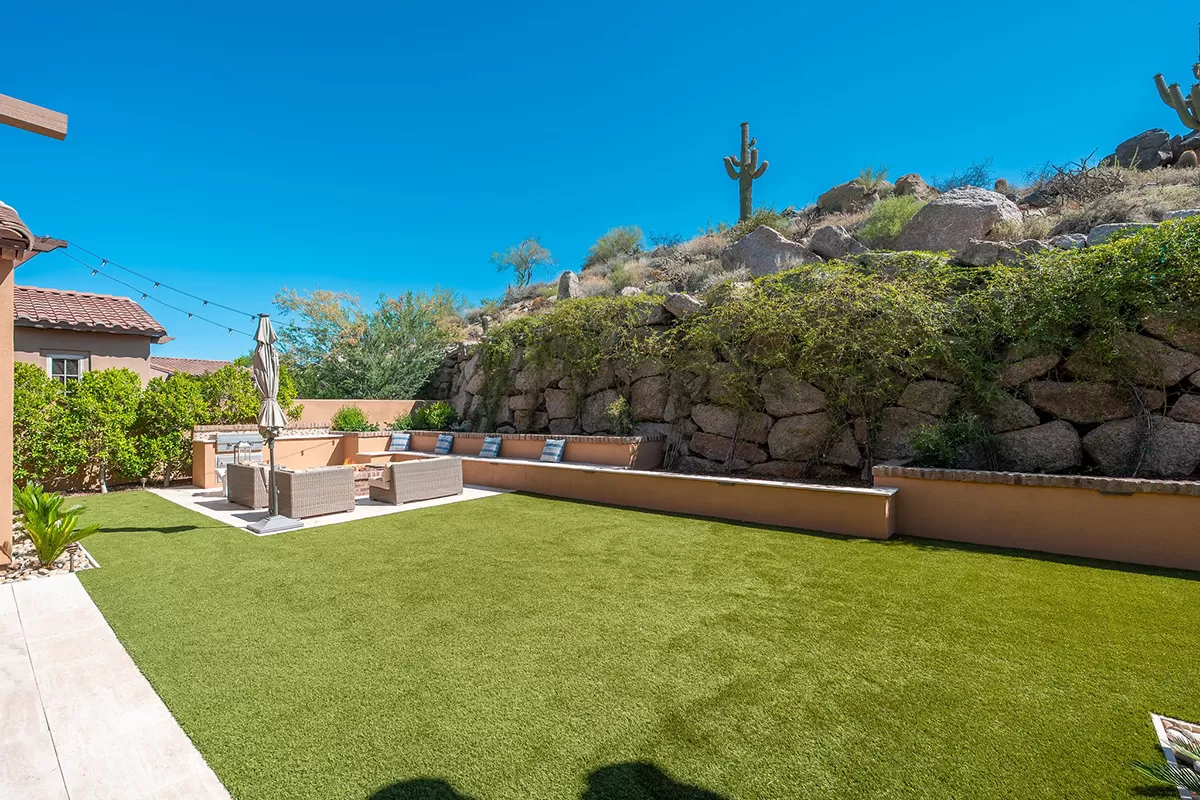 The professionally designed backyard offers true Arizona living with a stunning vine-covered boulder wall carved out for the lot, artificial turf, built-in seating surrounding the outdoor fireplace, raised planters, a built-in gas griddle, and a covered patio—perfect for entertaining or relaxing year-round.