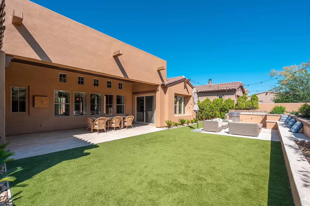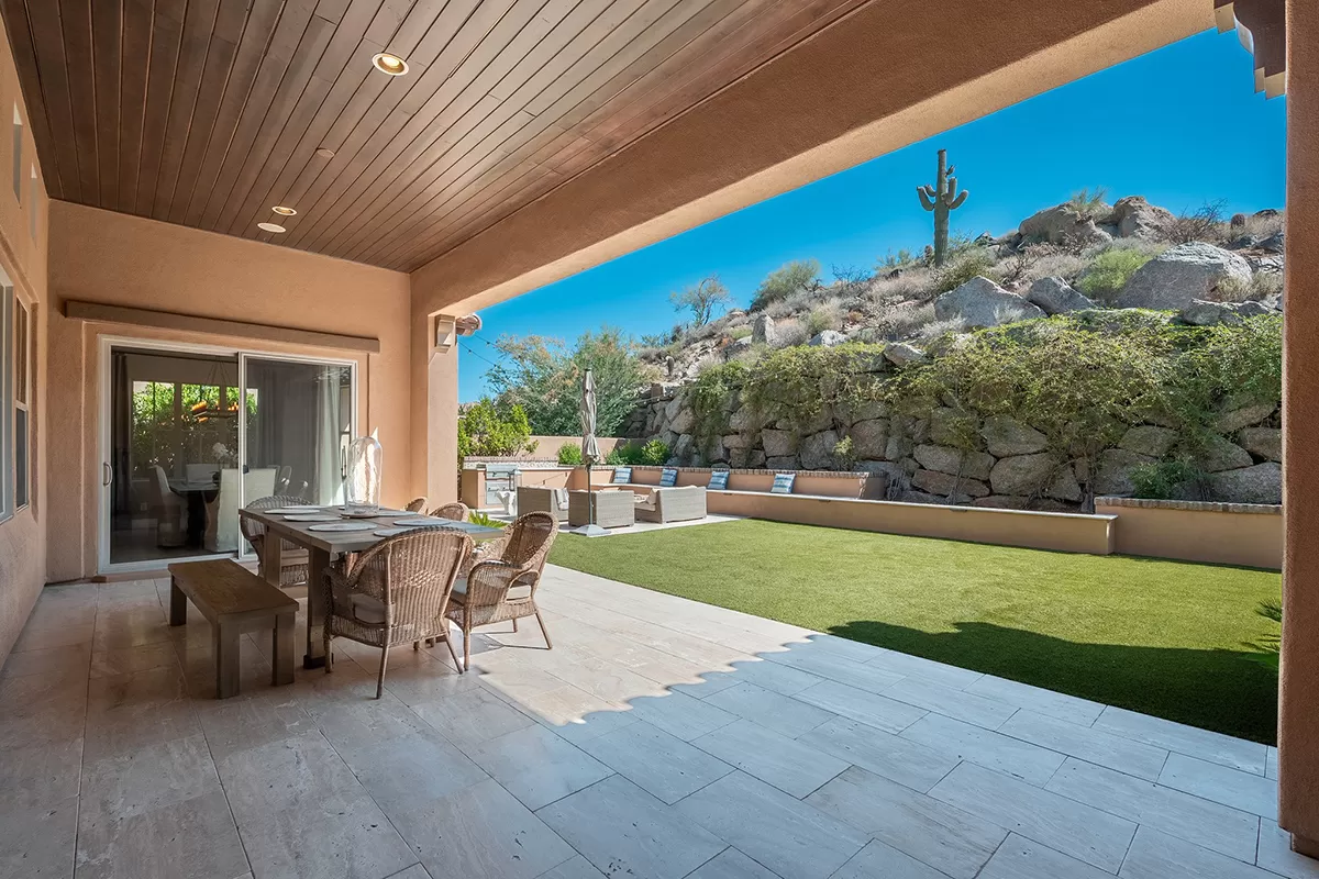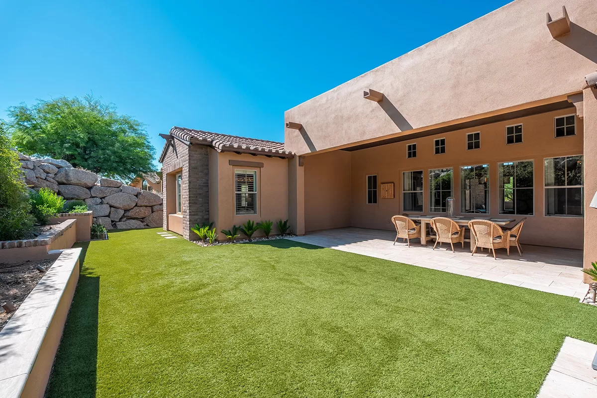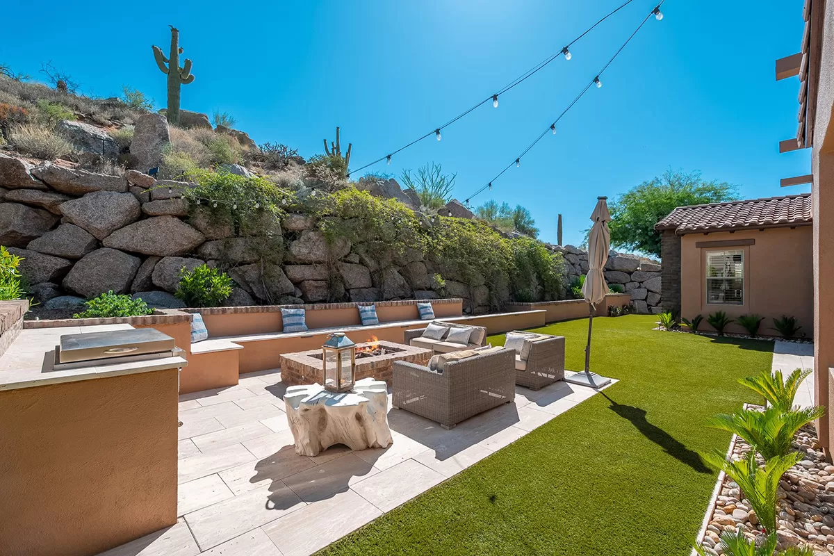 The professionally designed backyard offers true Arizona living with a stunning vine-covered boulder wall carved out for the lot, artificial turf, built-in seating surrounding the outdoor fireplace, raised planters, a built-in gas griddle, and a covered patio—perfect for entertaining or relaxing year-round.